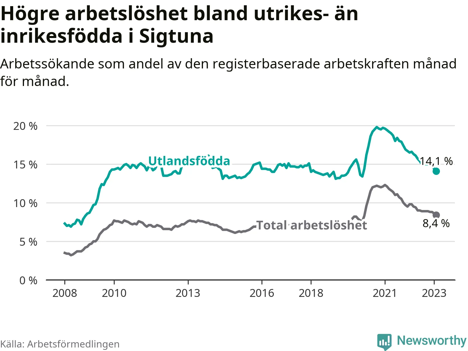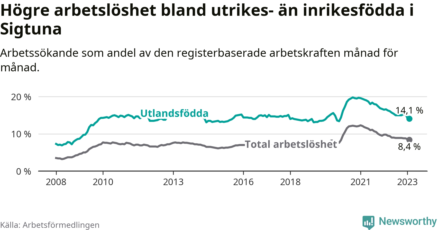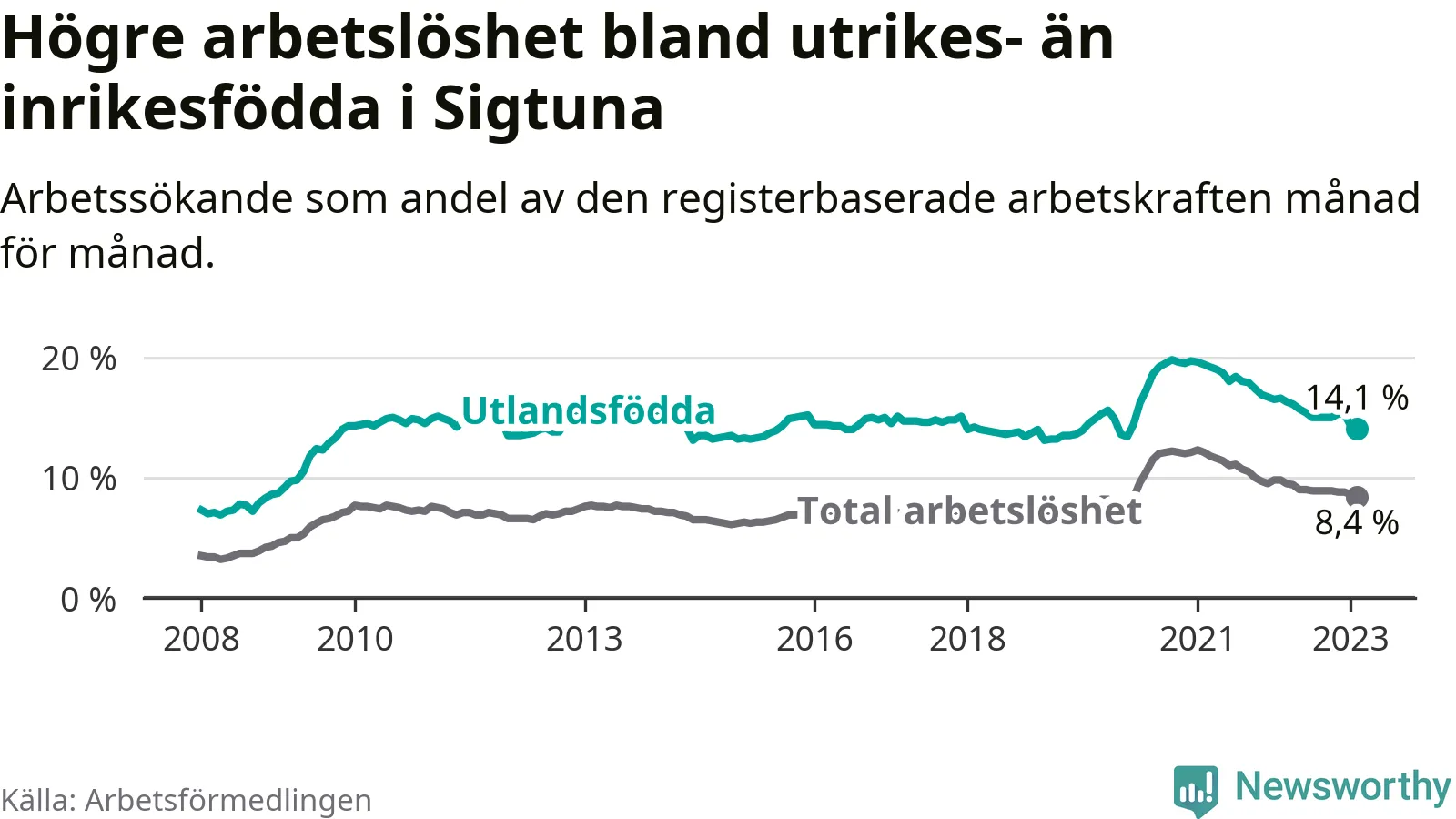 Arbetslösheten bland utlandsfödda var 14,1 procent i Sigtuna under februari månad, motsvarande 1 648 av 11 688 personer. Det är 2,5 procentenheter färre än vid samma tidpunkt i fjol (+1 631 om man räknar personer). Därmed är de utlandsföddas arbetslöshet lägre än vid samma tidpunkt i fjol för 21:a månaden i följd. Sedan maj 2021 har arbetslösheten bland utlandsfödda minskat från 18,7 till 14,1 procent. Den nuvarande arbetslöshetsnivån är den lägsta sedan februari 2020.