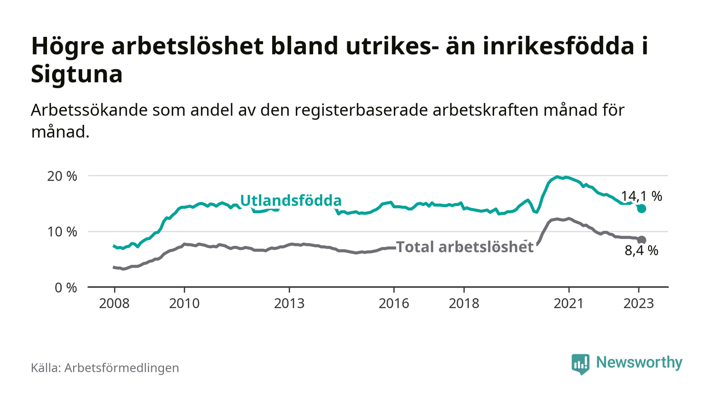 Skillnaden i arbetslöshet mellan utrikesfödda och hela befolkningen är 5,7 procentenheter i Sigtuna. Det är en mindre skillnad än för ett år sedan (−1,1 procentenheter).