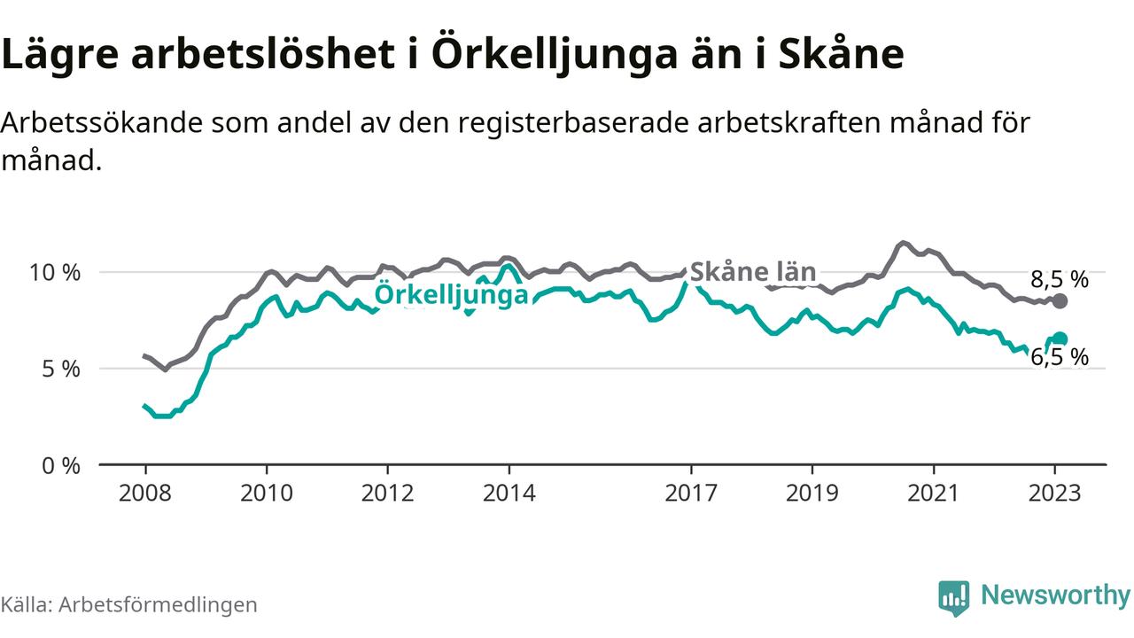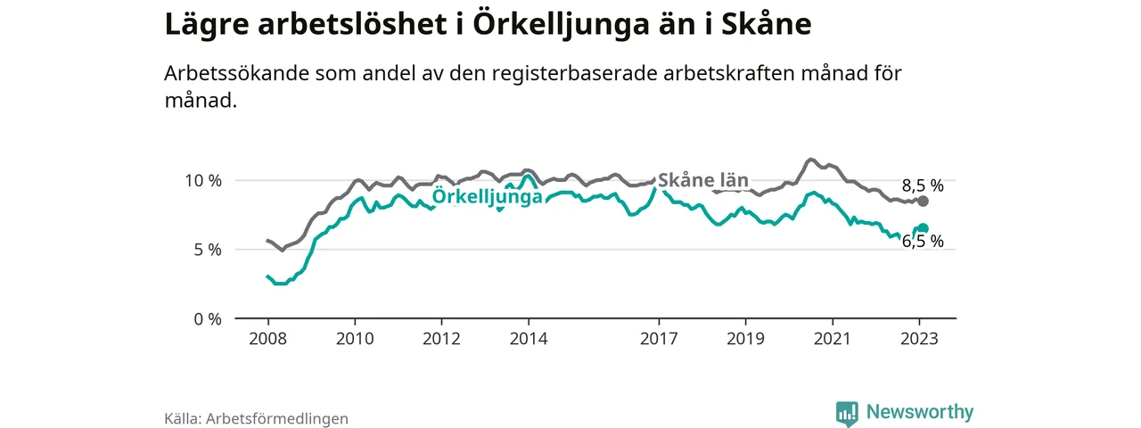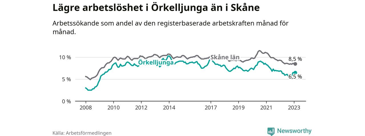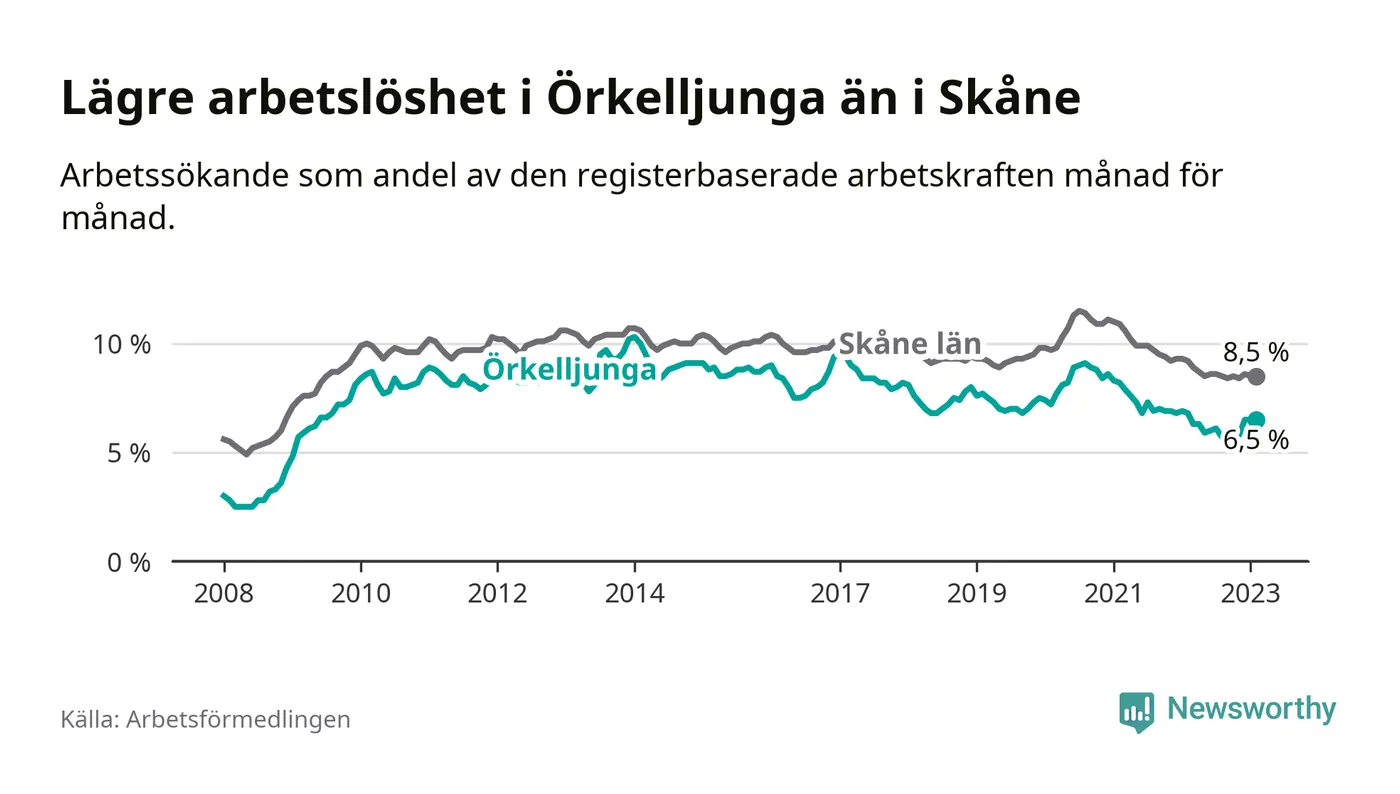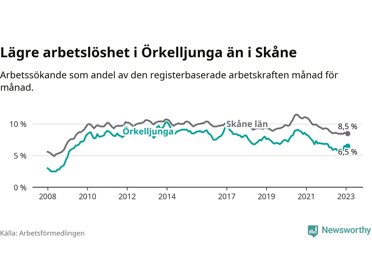 Det är 23:e månaden i följd som arbetslösheten i Örkelljunga är lägre än den var under samma tidpunkt året innan. Sedan mars 2021 har arbetslösheten gått ner från 7,9 till 6,5 procent.