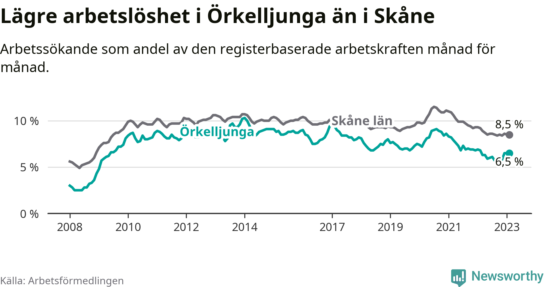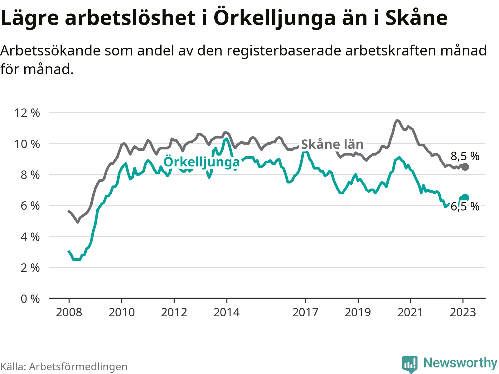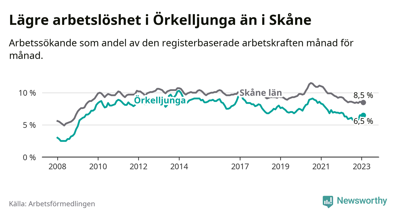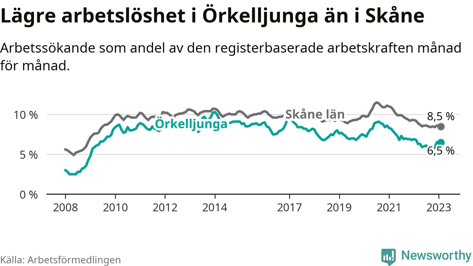 Det är 23:e månaden i följd som arbetslösheten i Örkelljunga är lägre än den var under samma tidpunkt året innan. Sedan mars 2021 har arbetslösheten gått ner från 7,9 till 6,5 procent.