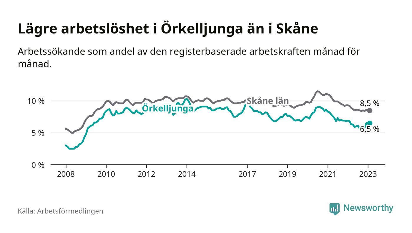 Örkelljunga hade redan tidigare lägre arbetslöshet än snittet i hela Skåne län och nu växer klyftan (6,5 procent i kommunen, jämfört med 8,5 procent i hela länet). Lomma har den lägsta arbetslösheten i länet (3,2 procent), medan Perstorp har den högsta (12,9 procent). För att Örkelljunga skulle komma ner i samma arbetslöshetsnivå som Lomma skulle 165 personer behöva sysselsättas.