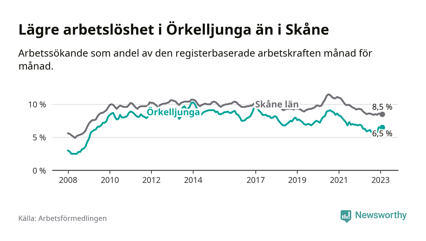 Under februari månad rapporterade Örkelljunga kommun en total arbetslöshet på 6,5 procent. Det är en minskning jämfört med samma tidpunkt i fjol (−0,3 procentenheter). Även i Skåne län sjunker arbetslösheten .