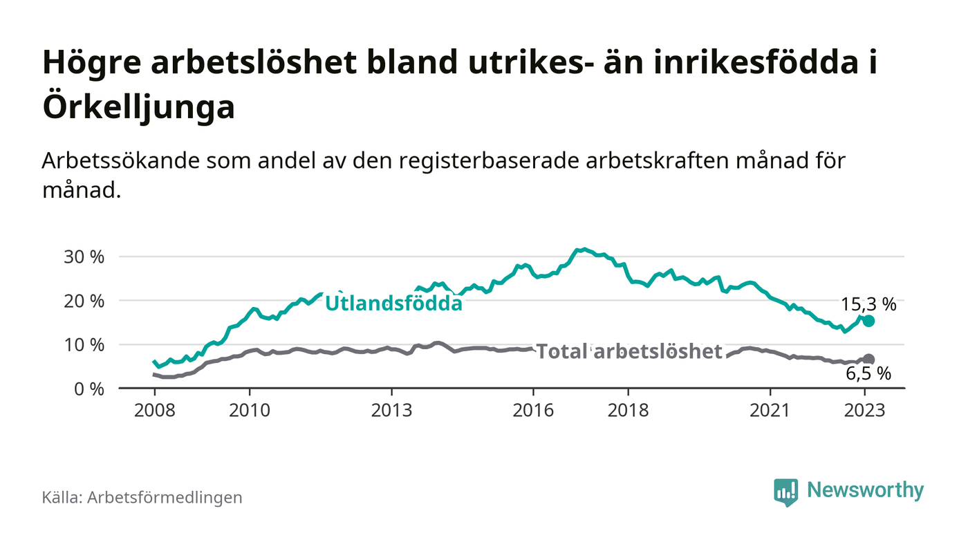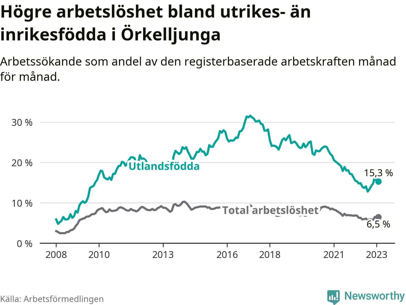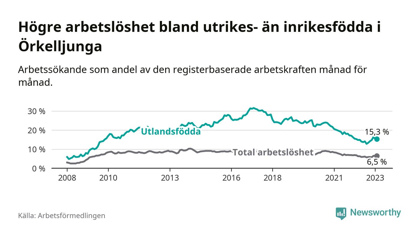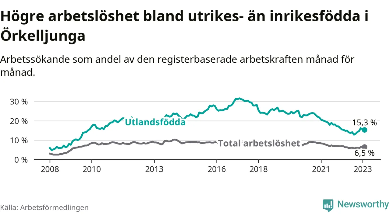 Arbetslösheten bland utlandsfödda var 15,3 procent i Örkelljunga under februari månad, motsvarande 157 av 1 026 personer. Det är i stort sett lika stor andel som i fjol.