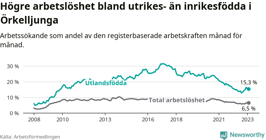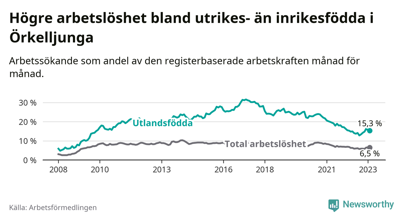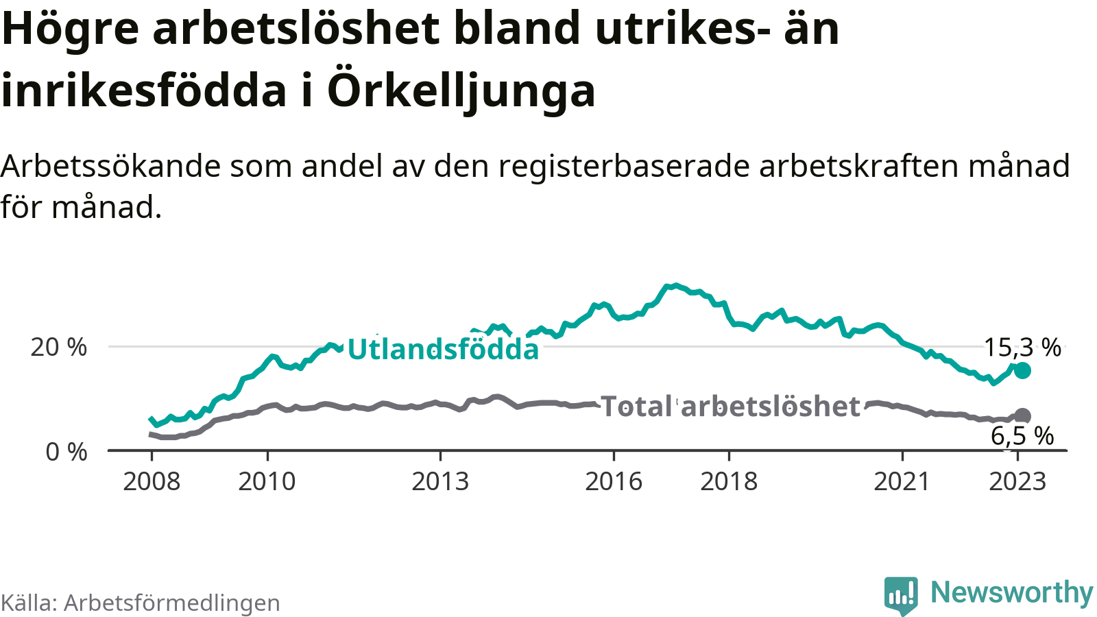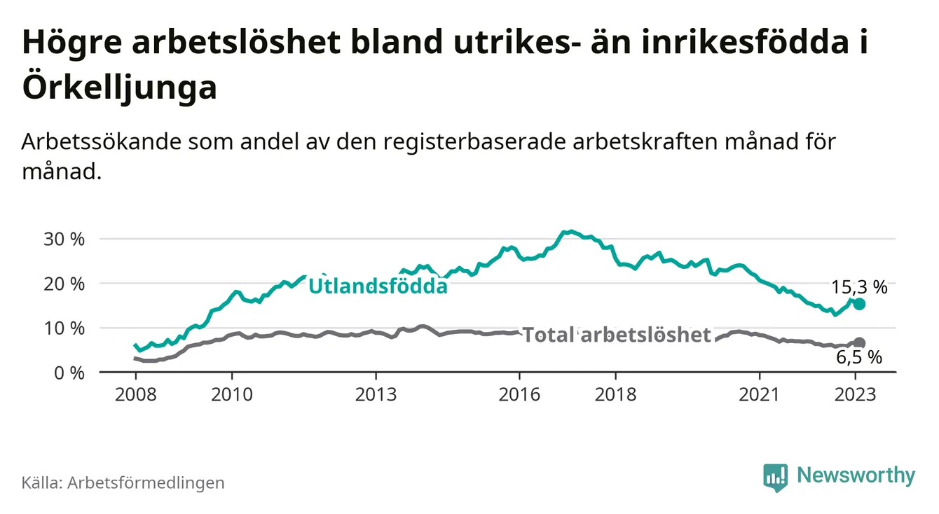 Arbetslösheten bland utlandsfödda var 15,3 procent i Örkelljunga under februari månad, motsvarande 157 av 1 026 personer. Det är i stort sett lika stor andel som i fjol.