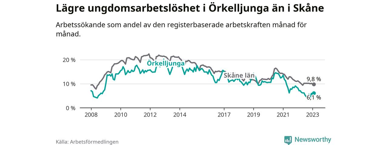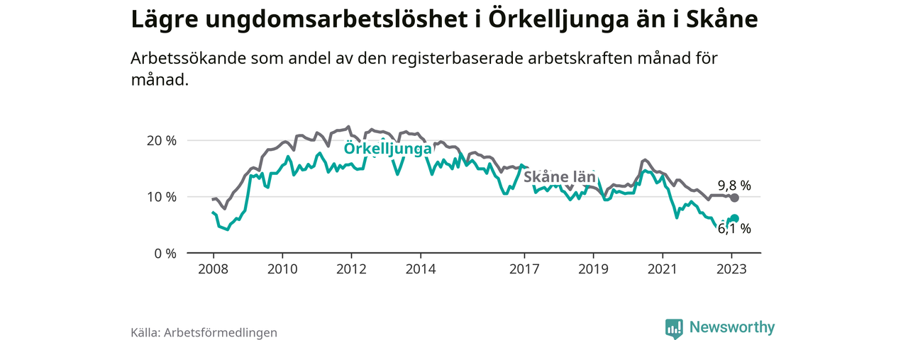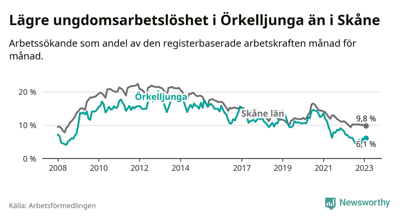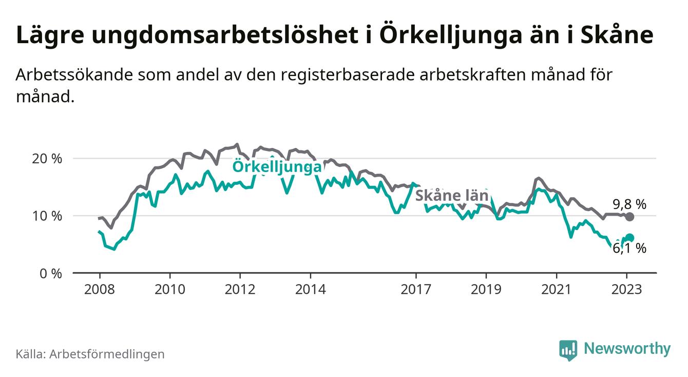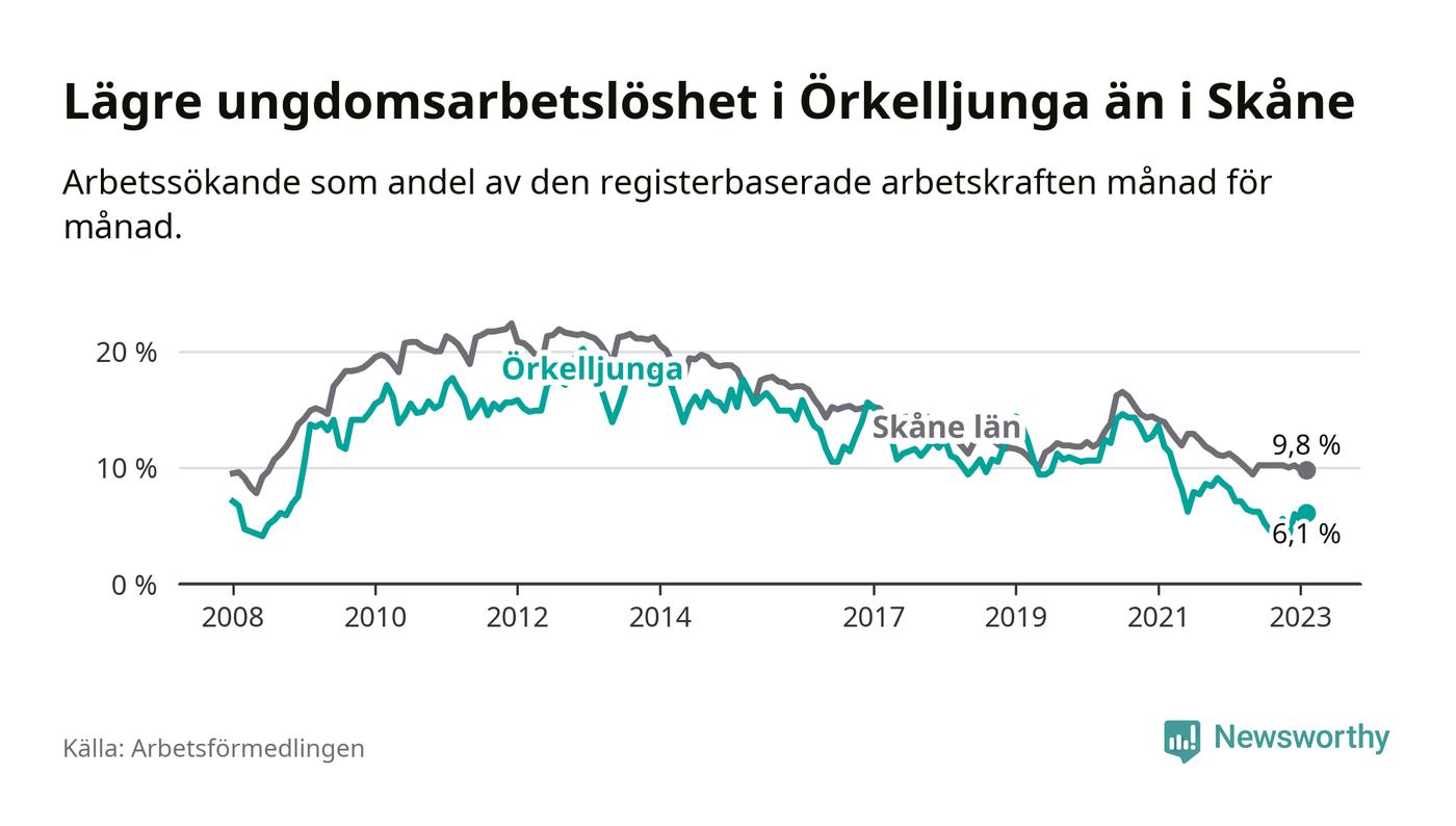 Graf: Arbetslöshet bland unga i Örkelljunga kommun och Skåne län