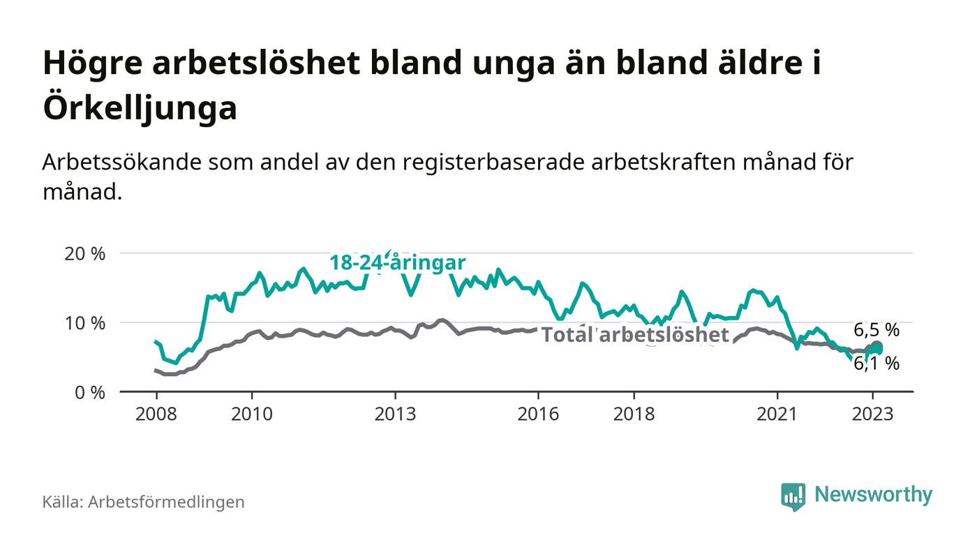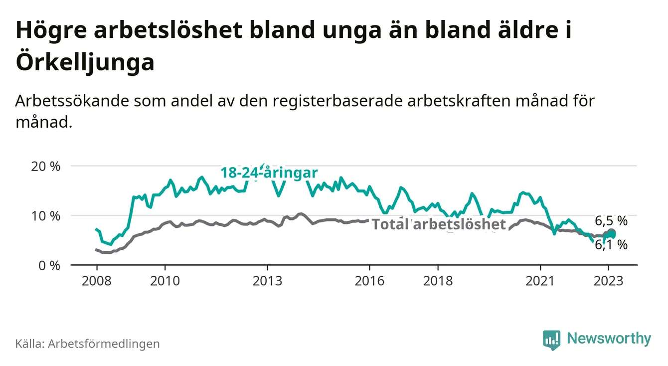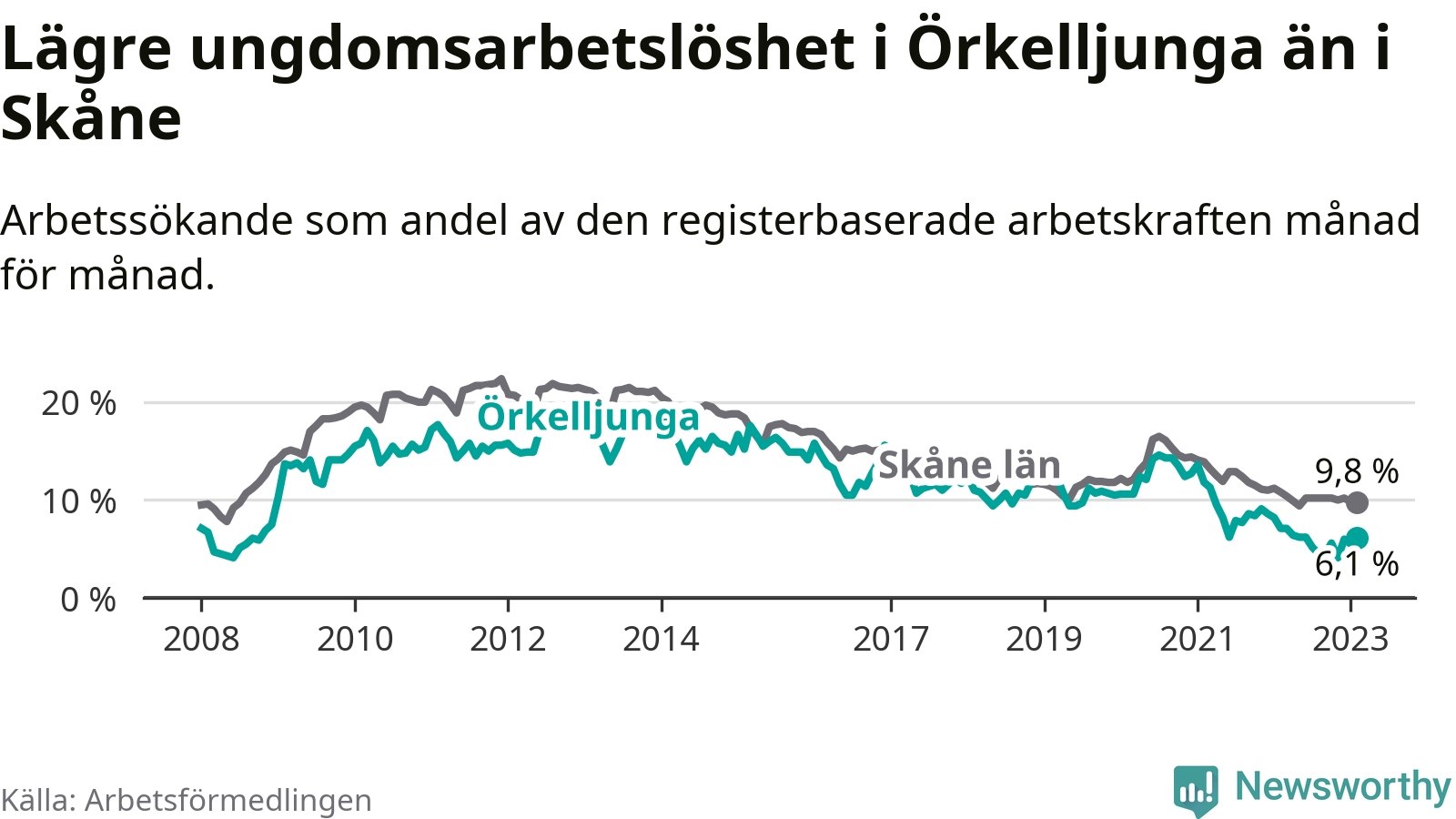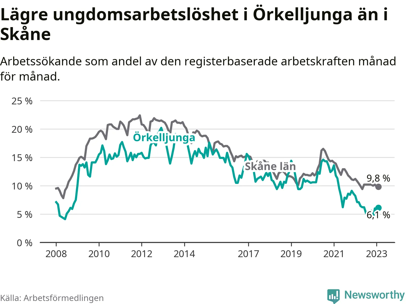 Graf: Arbetslöshet bland unga i Örkelljunga kommun och Skåne län