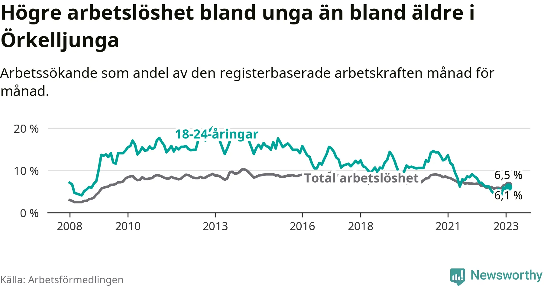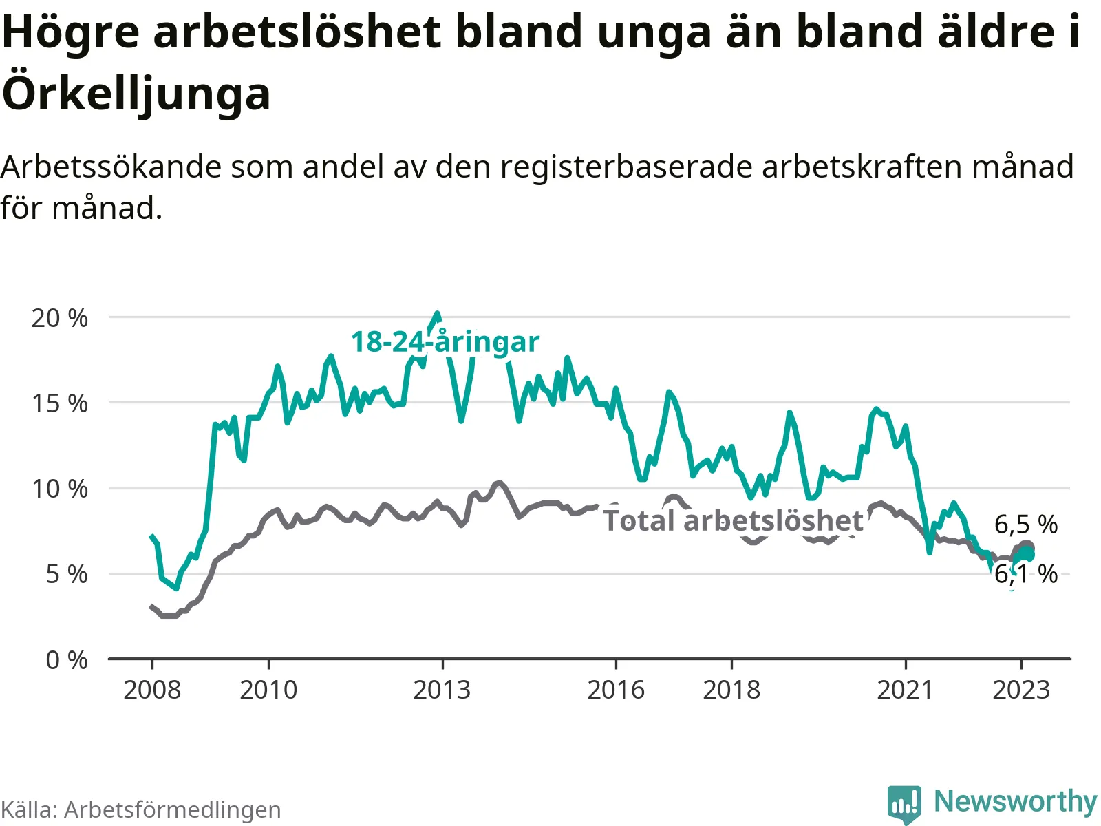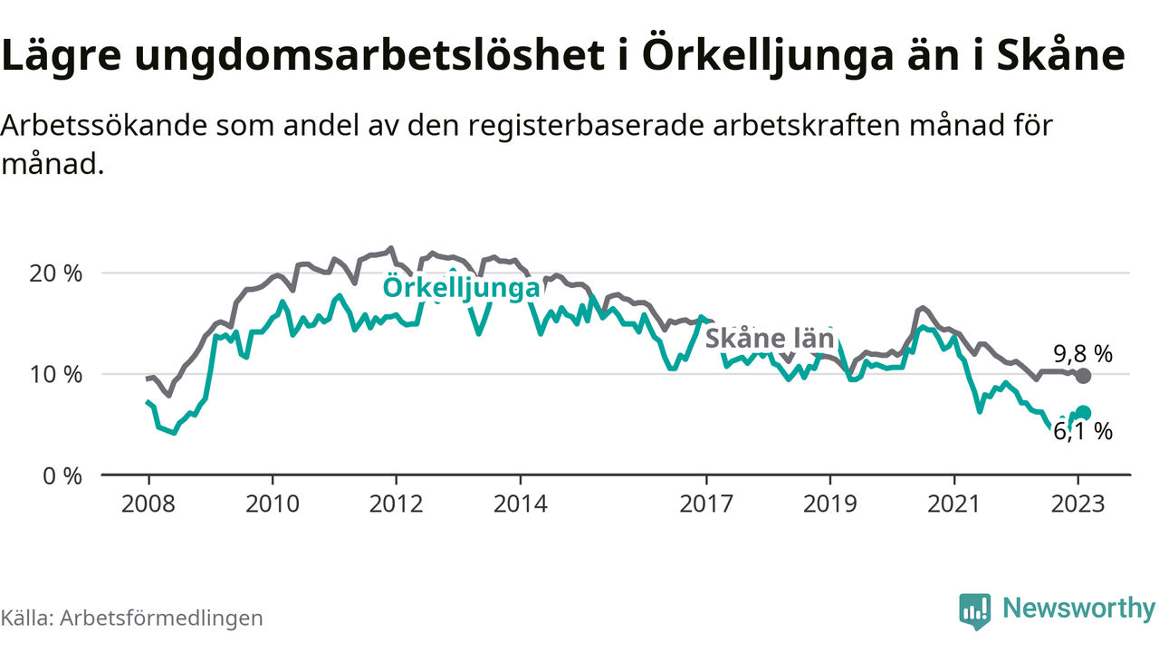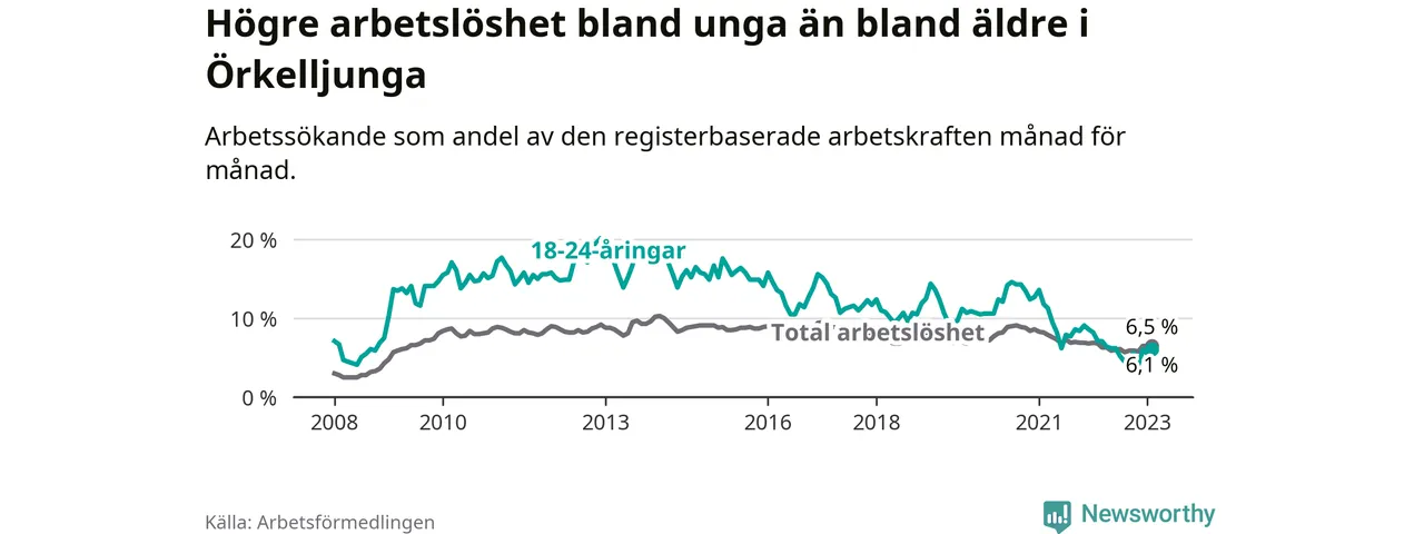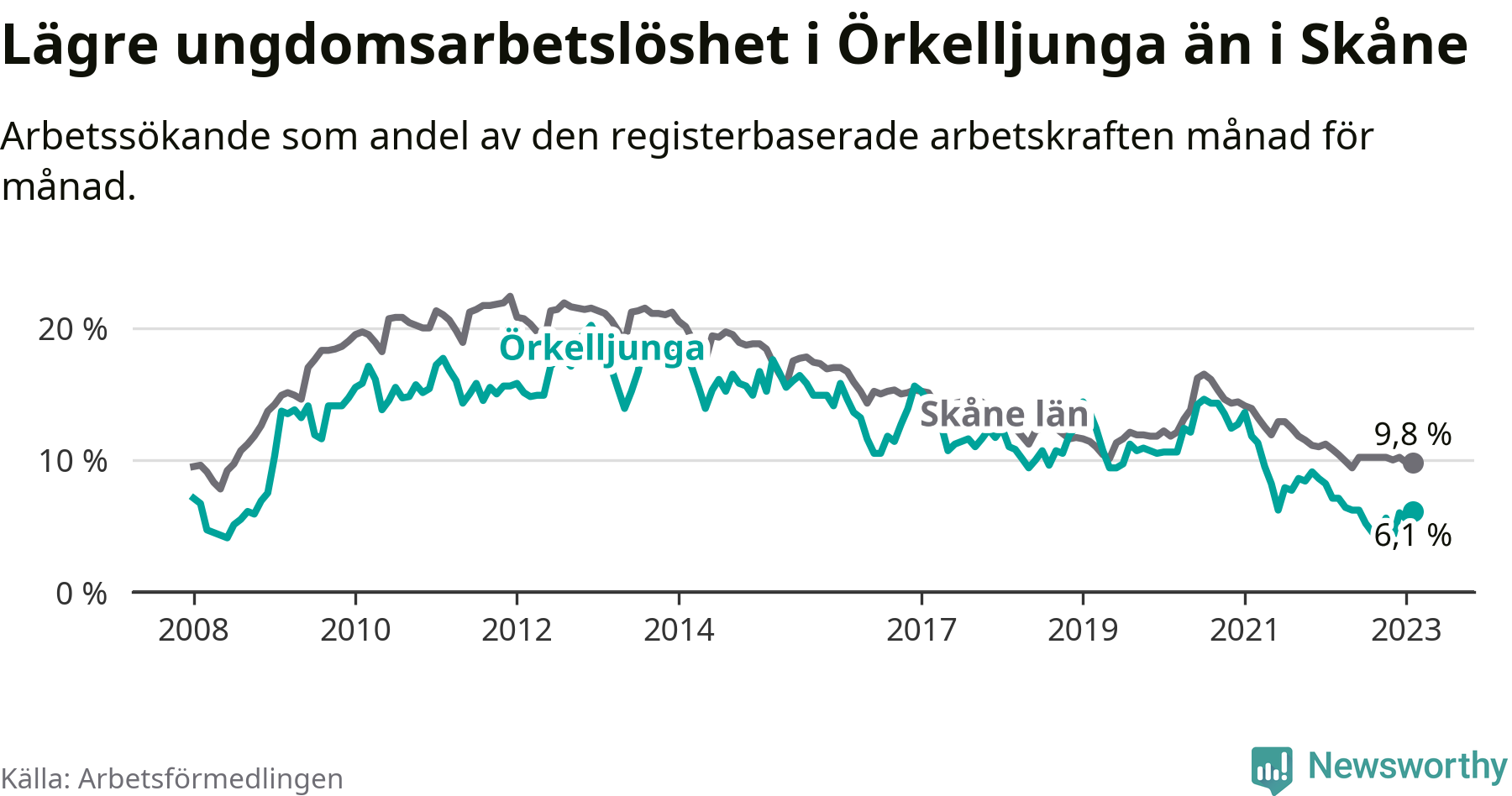 Graf: Arbetslöshet bland unga i Örkelljunga kommun och Skåne län