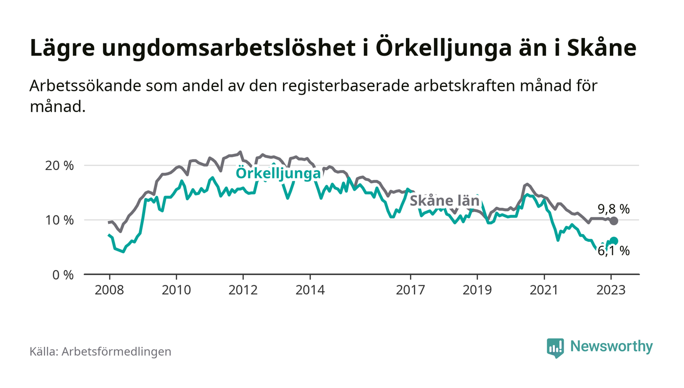 Precis som den totala arbetslösheten ligger ungdomsarbetslösheten i Örkelljunga lägre än i Skåne som helhet. Skillnaden mellan kommunen och länet är 3,7 procentenheter.