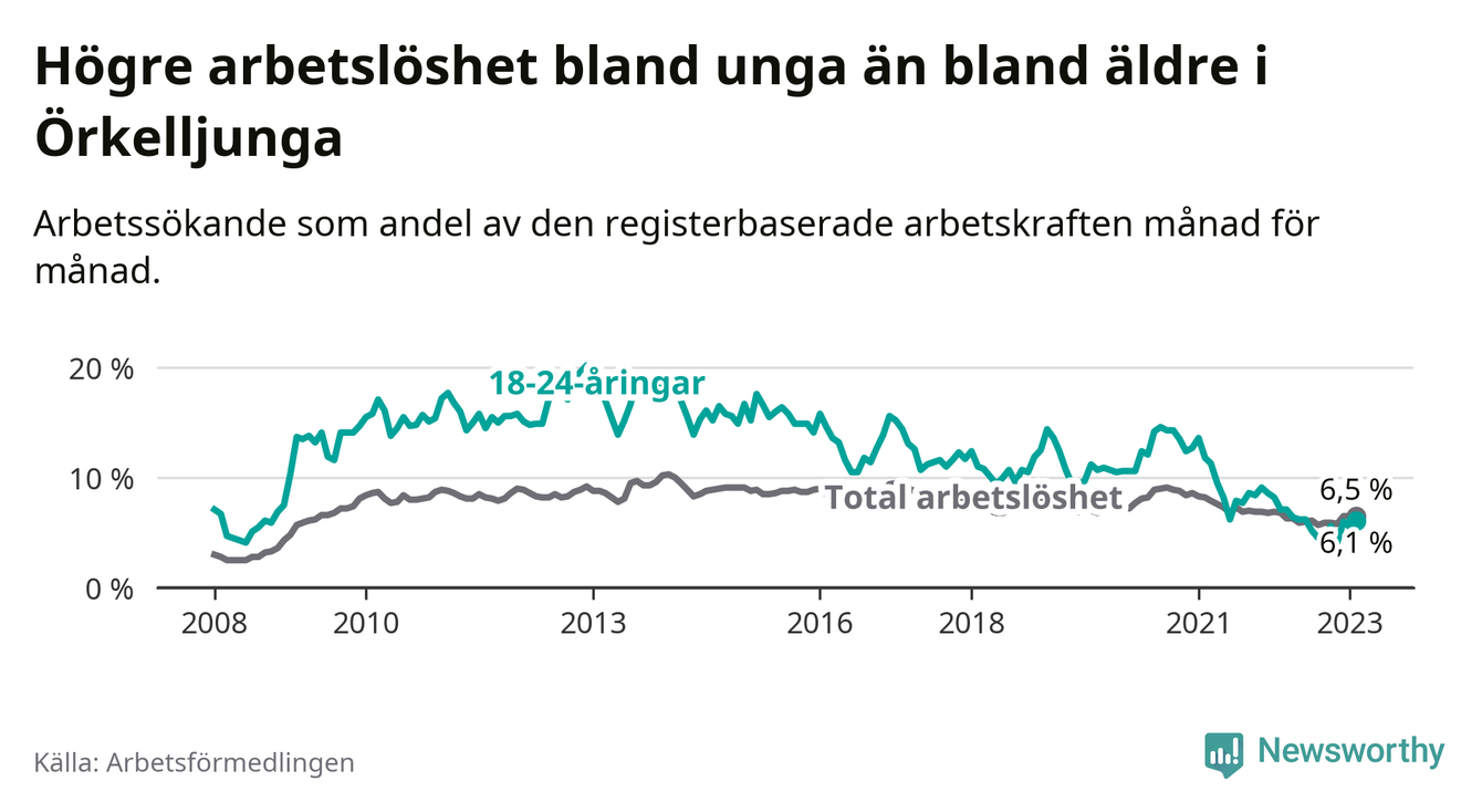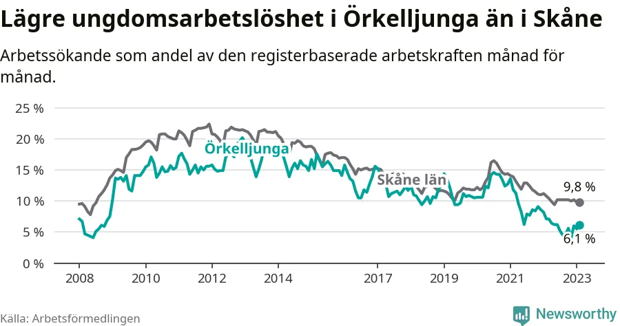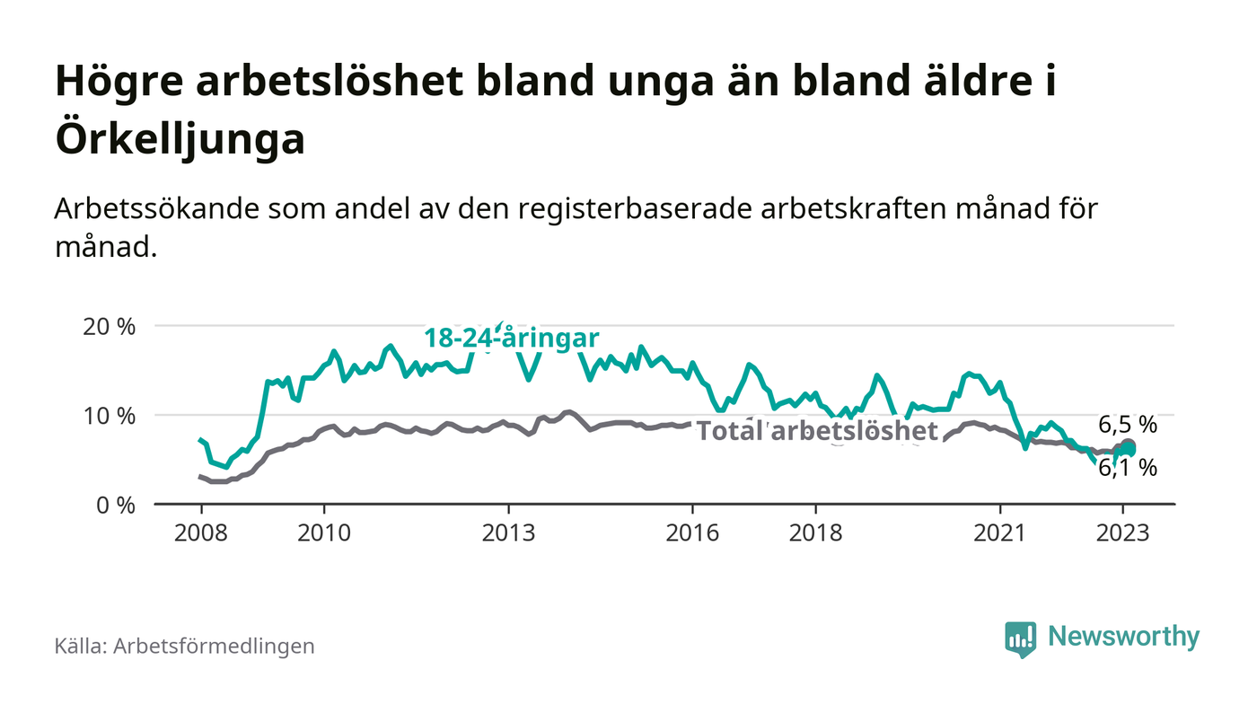 I och med den senaste månadens nedgång har de ungas arbetslöshet i Örkelljunga sjunkit åtta månader i följd (ner från 6,2 procent i juni 2022 till 6,1 procent nu).