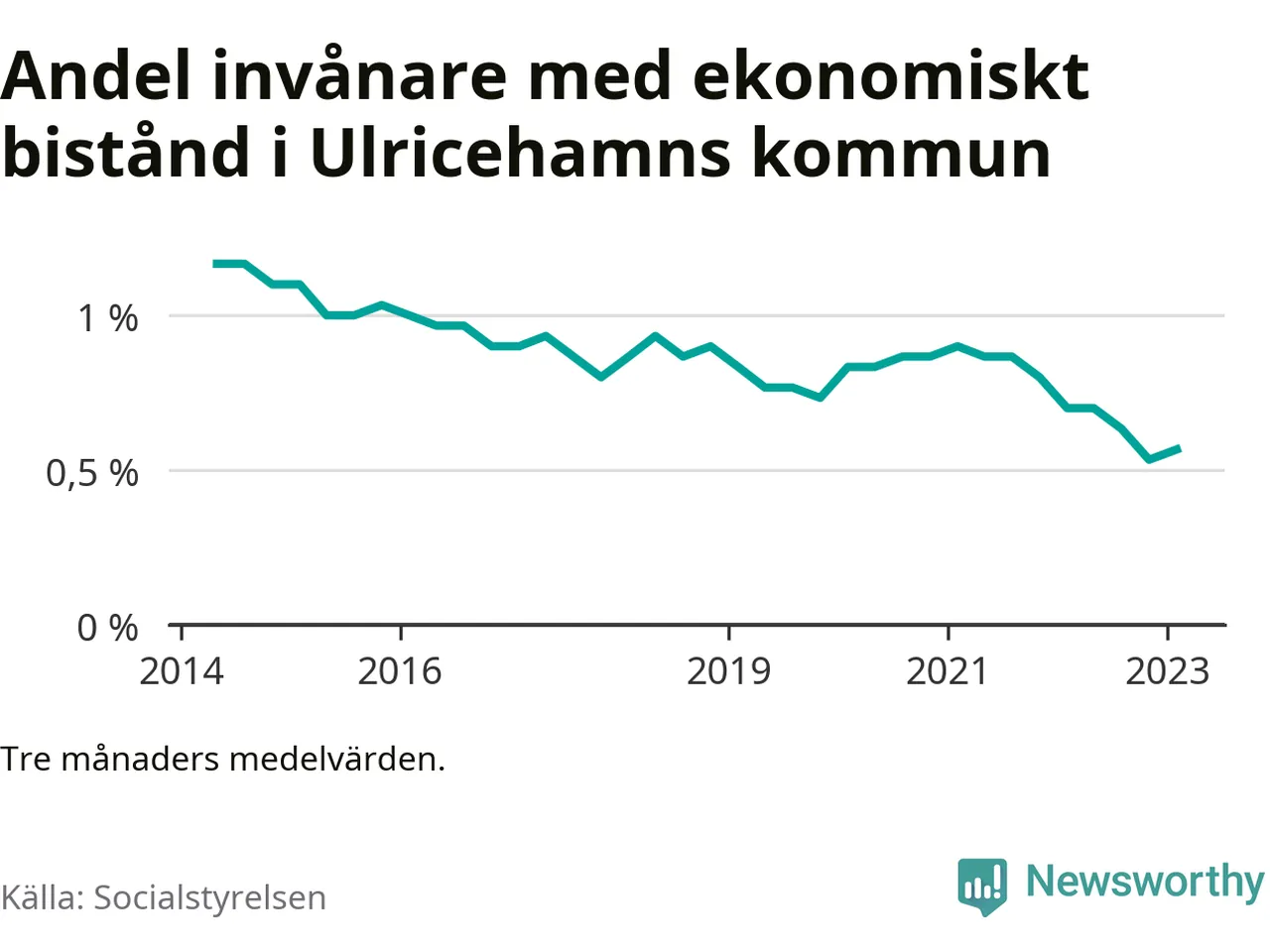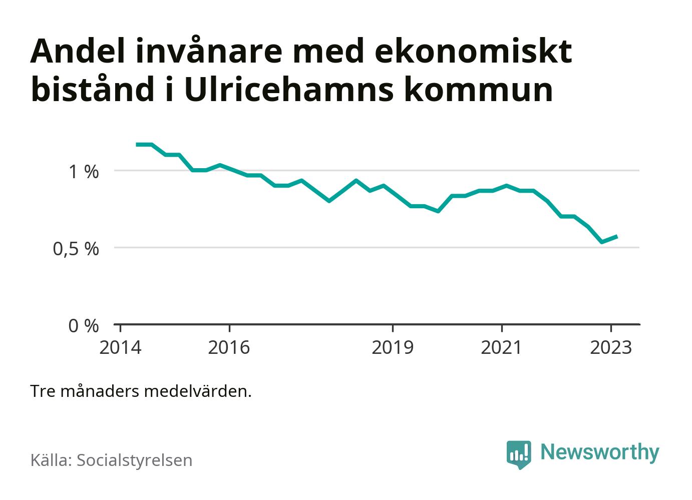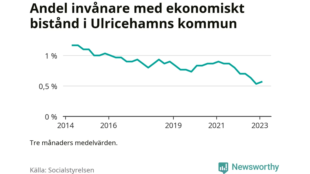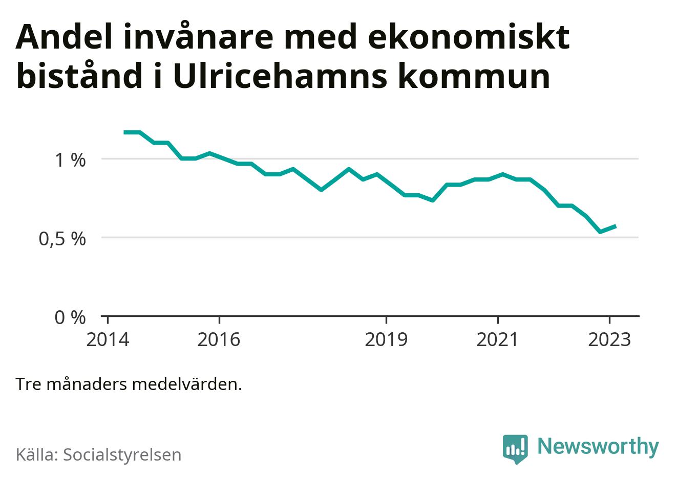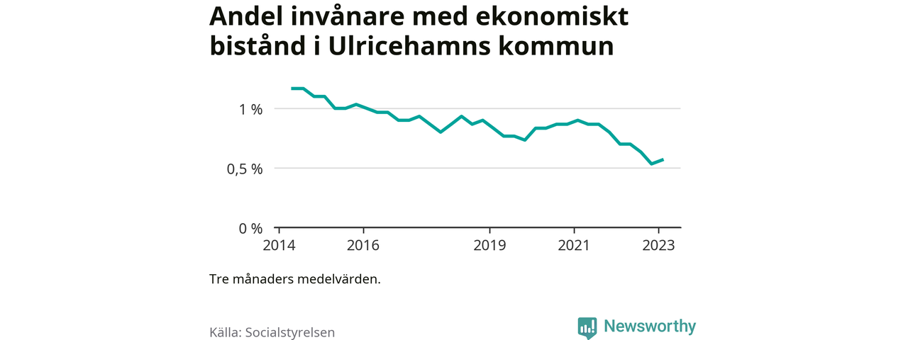 Andelen invånare med ekonomiskt bistånd i Ulricehamns kommun var lägre under de tre senaste månaderna, jämfört med motsvarande period året innan. Det visar den senaste, preliminära statistiken från Socialstyrelsen.