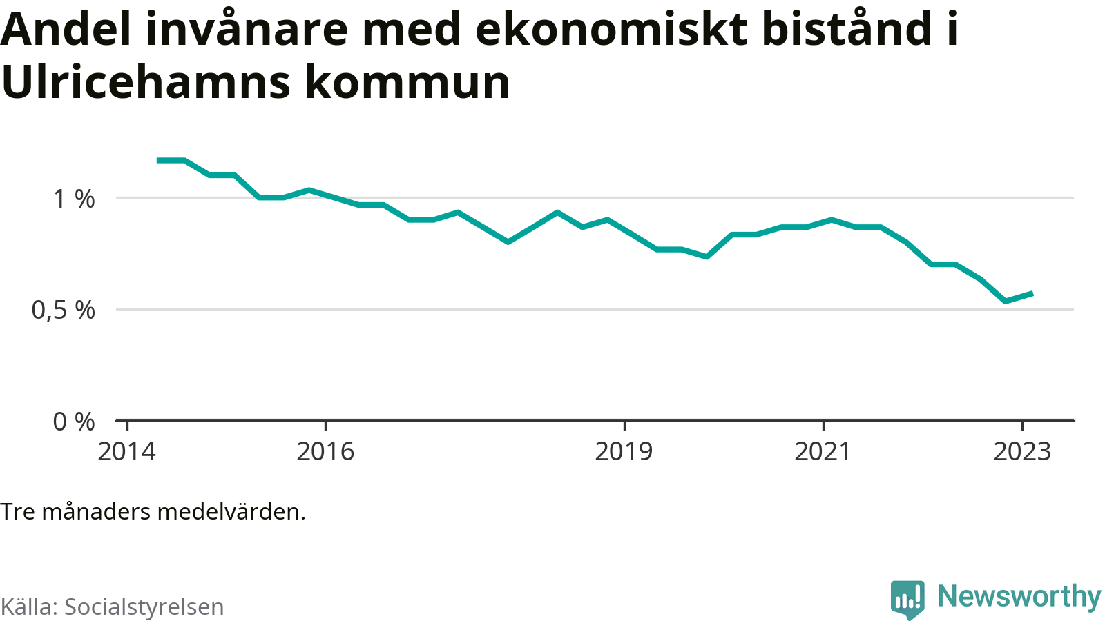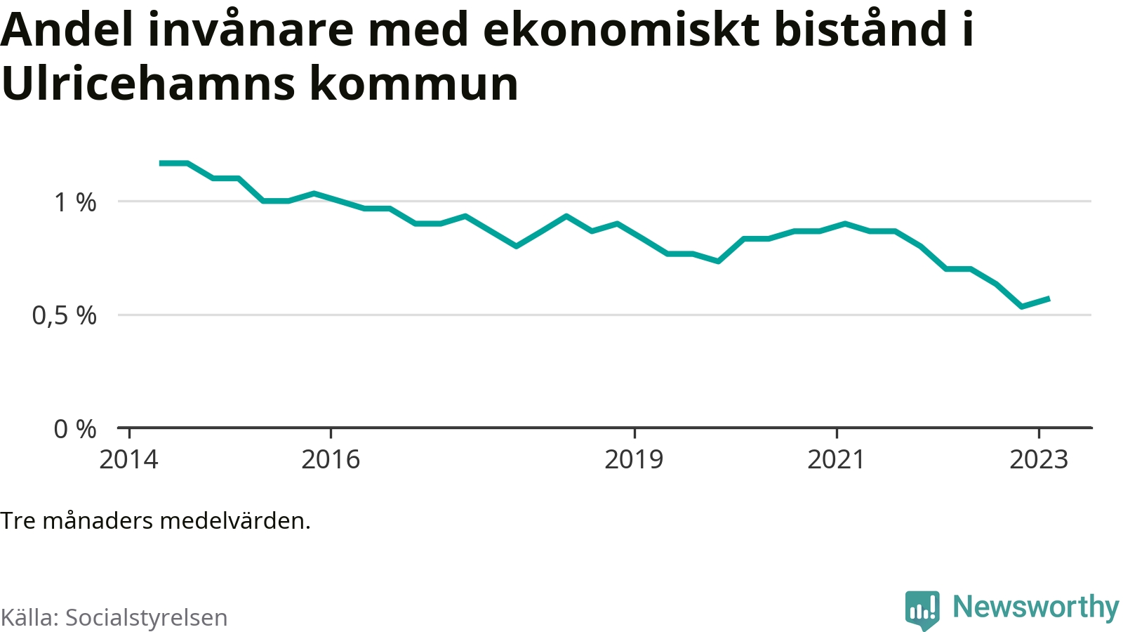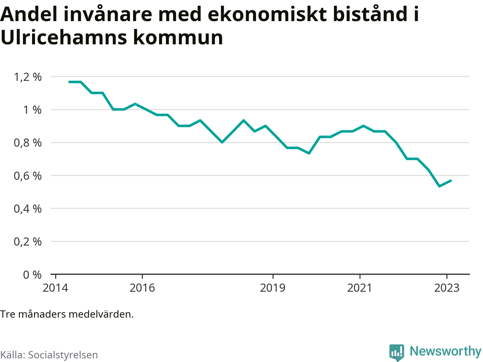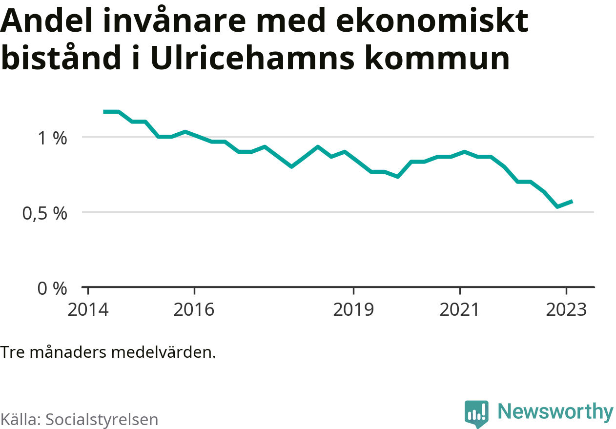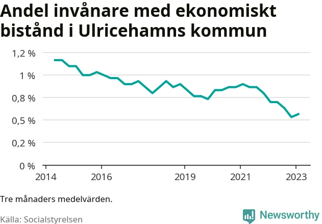 Andelen invånare med ekonomiskt bistånd i Ulricehamns kommun var lägre under de tre senaste månaderna, jämfört med motsvarande period året innan. Det visar den senaste, preliminära statistiken från Socialstyrelsen.