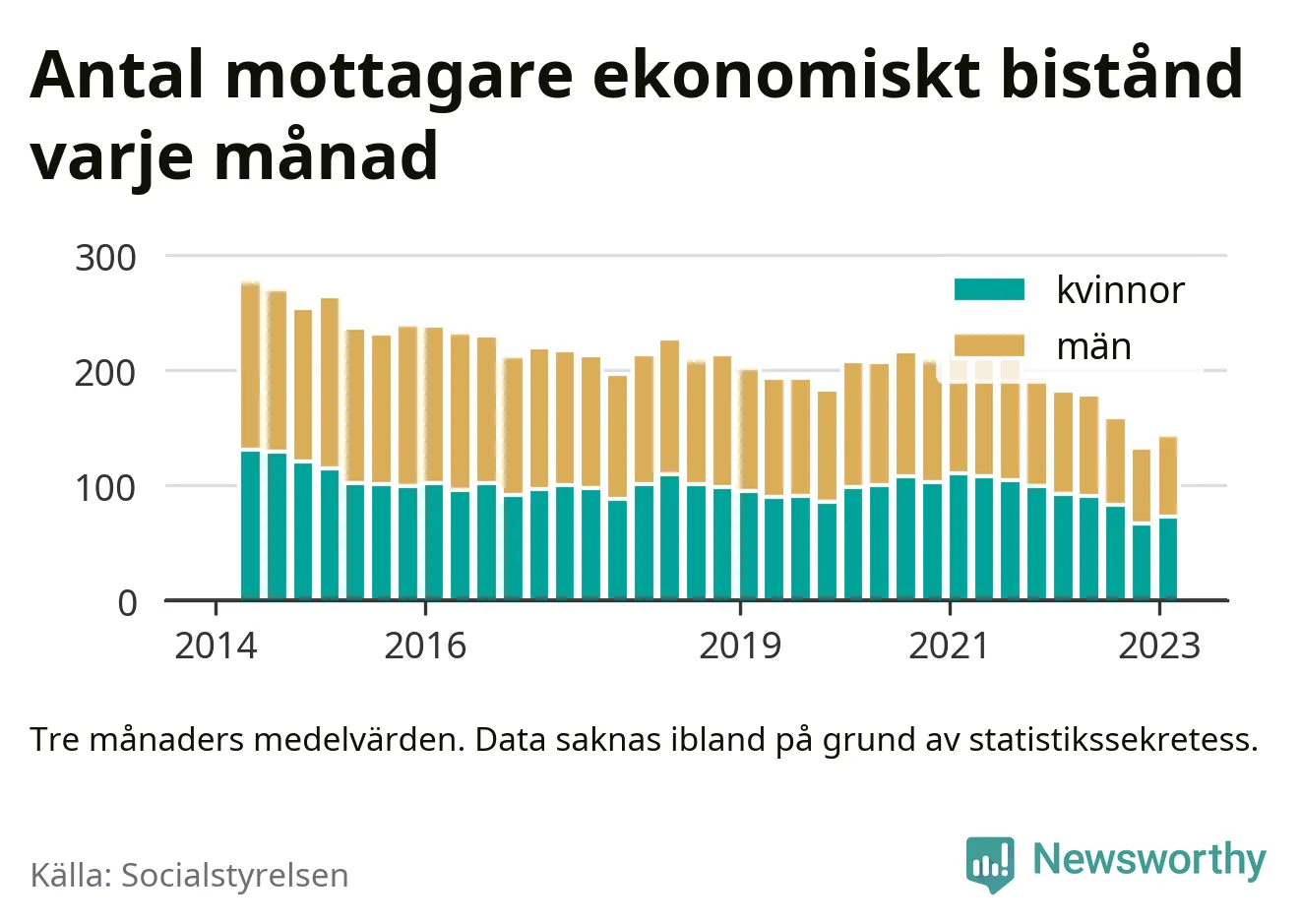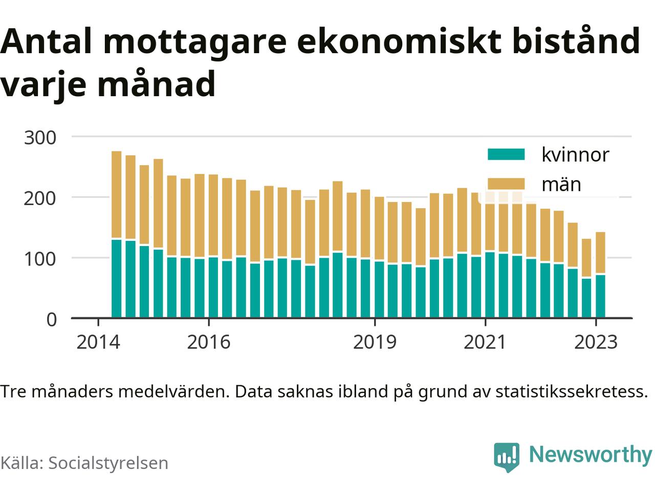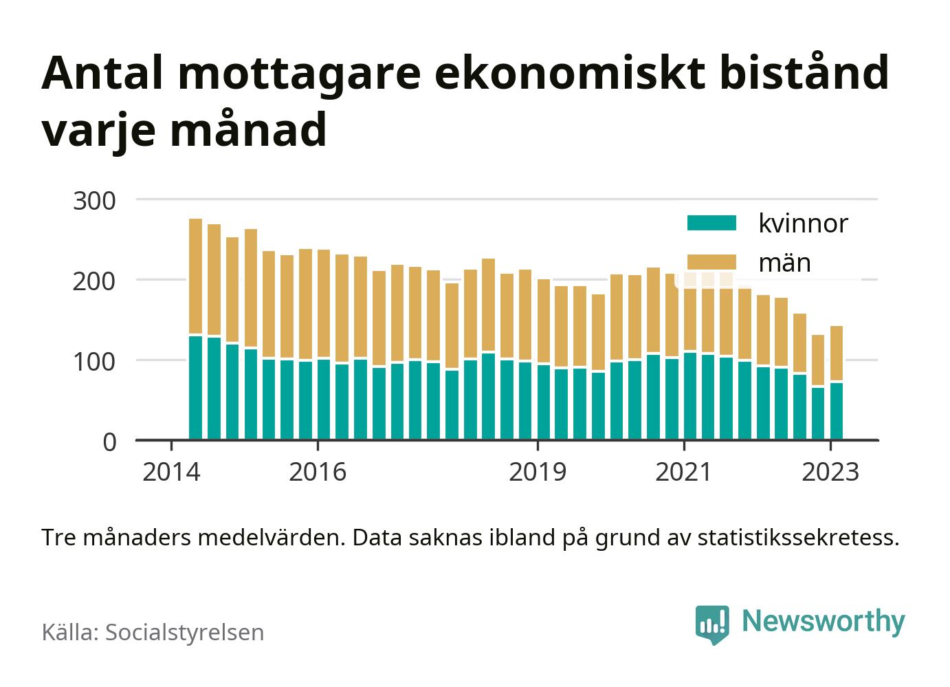 I genomsnitt 71 män och 73 kvinnor fick ekonomiskt bistånd varje månad under vintern.