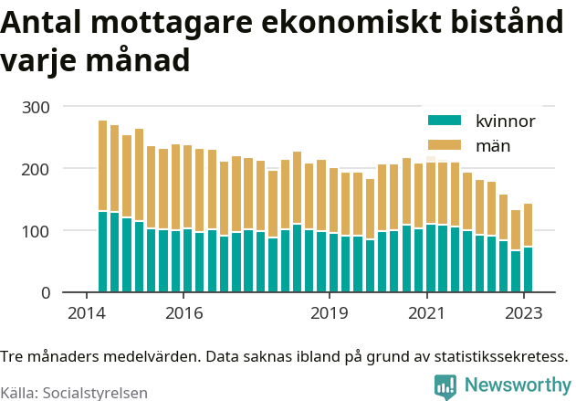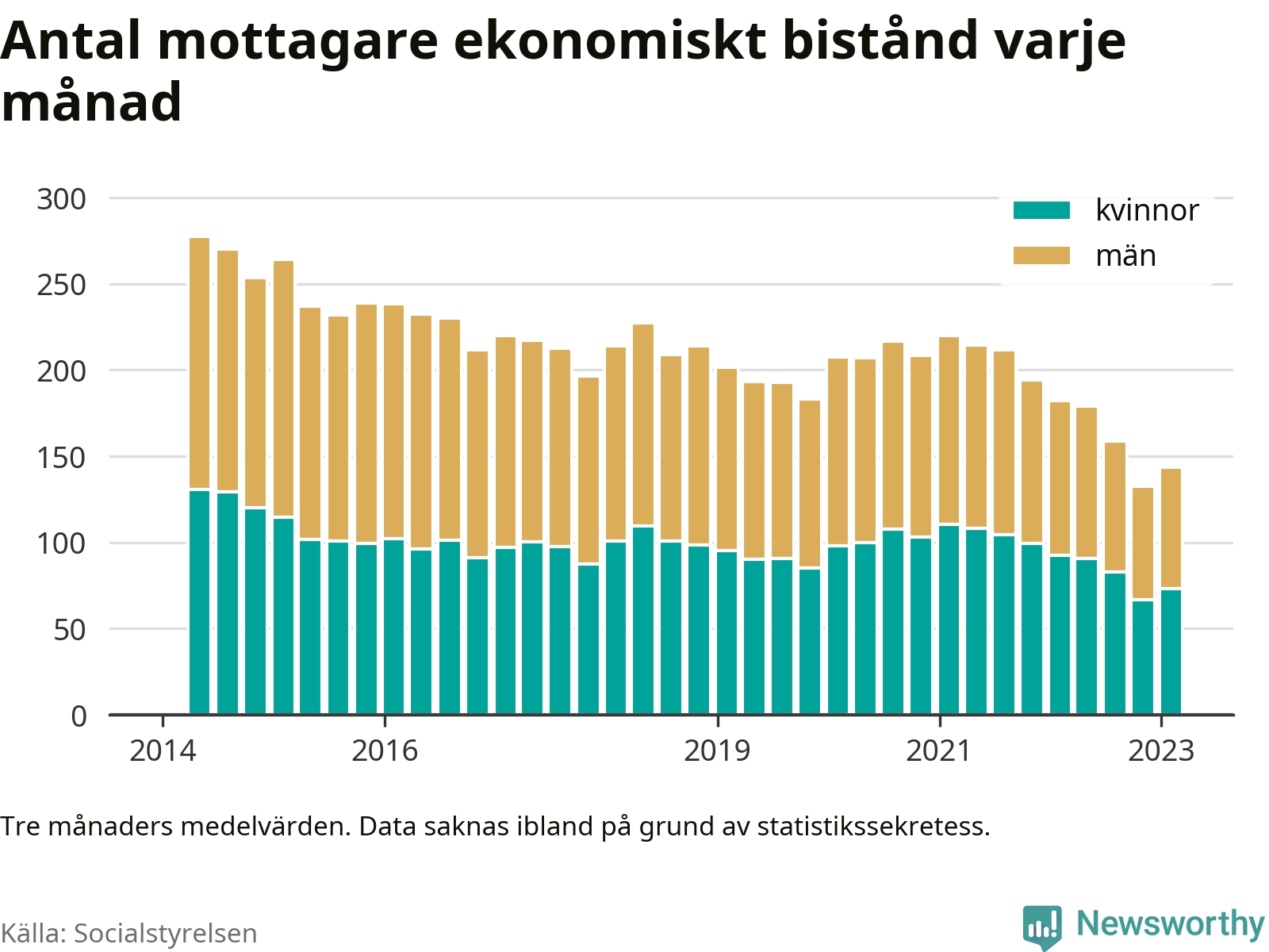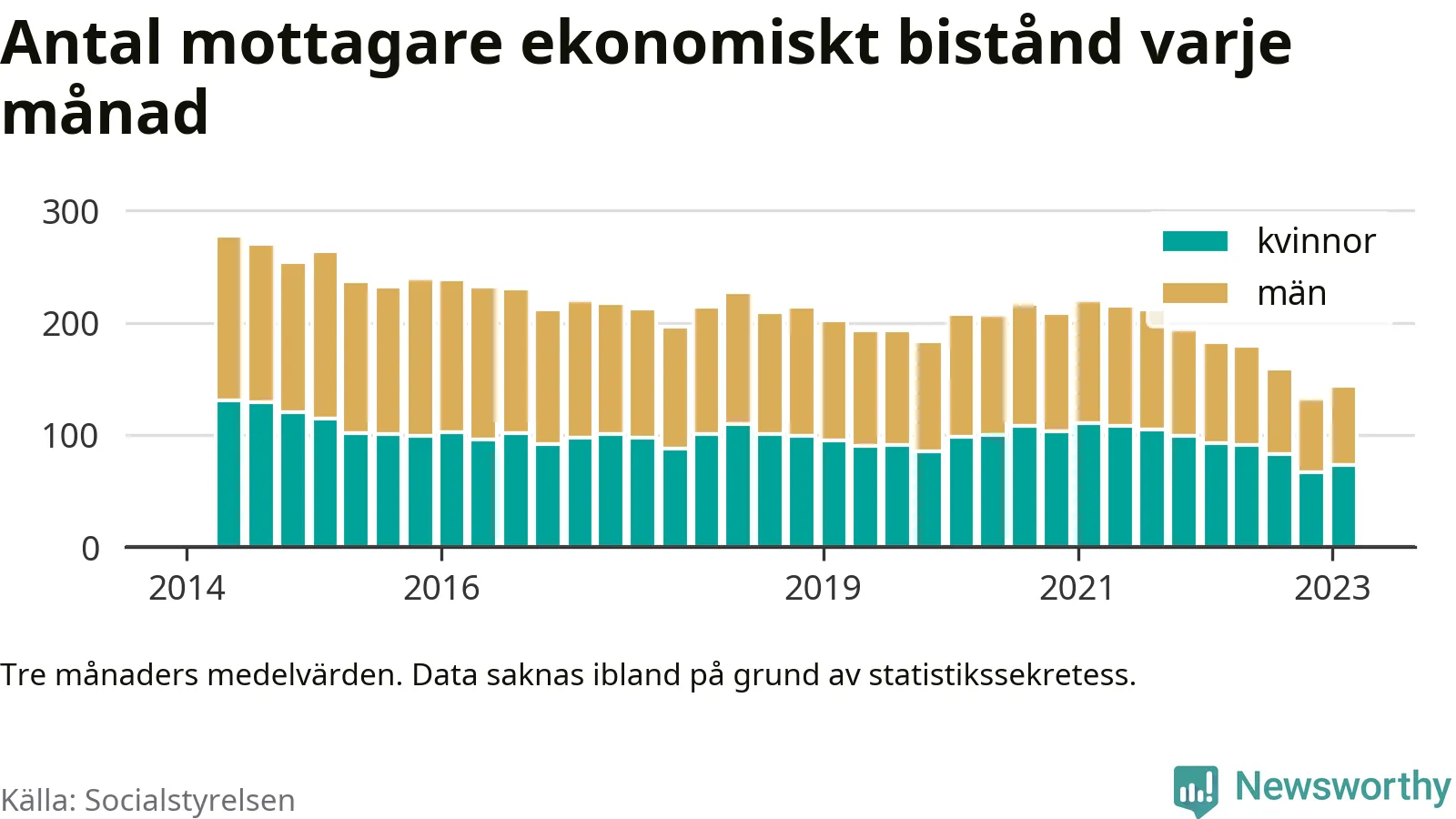 I genomsnitt 71 män och 73 kvinnor fick ekonomiskt bistånd varje månad under vintern.