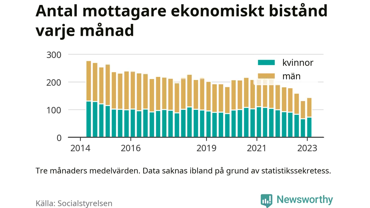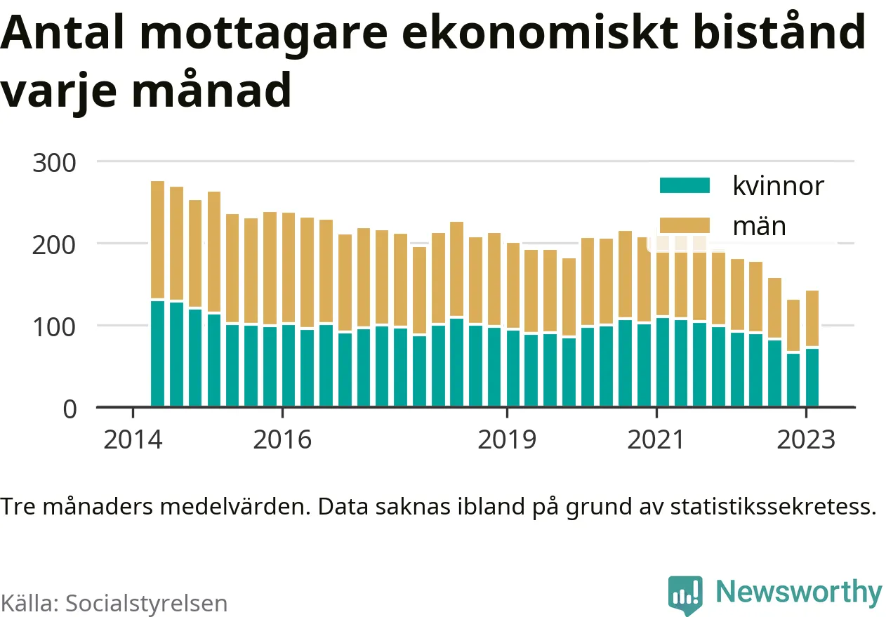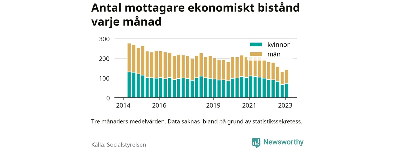 Den högsta andelen biståndstagare under det senaste decenniet hade kommunen under våren 2014 (längre tillbaka sträcker sig inte datan), och den lägsta andelen under hösten 2022 (0,5 procent).