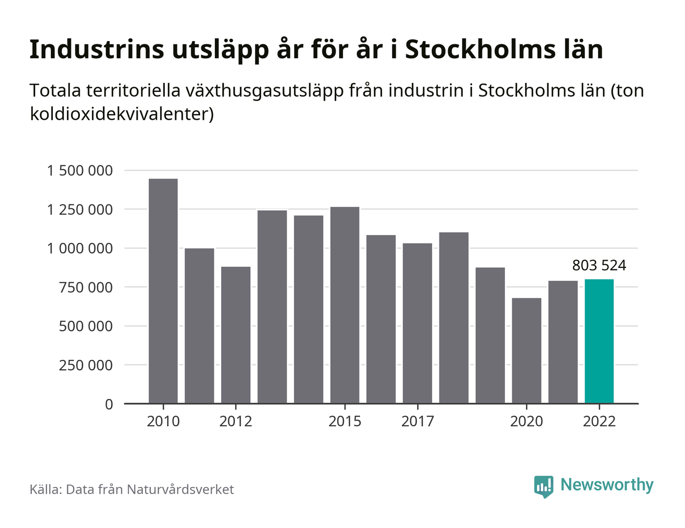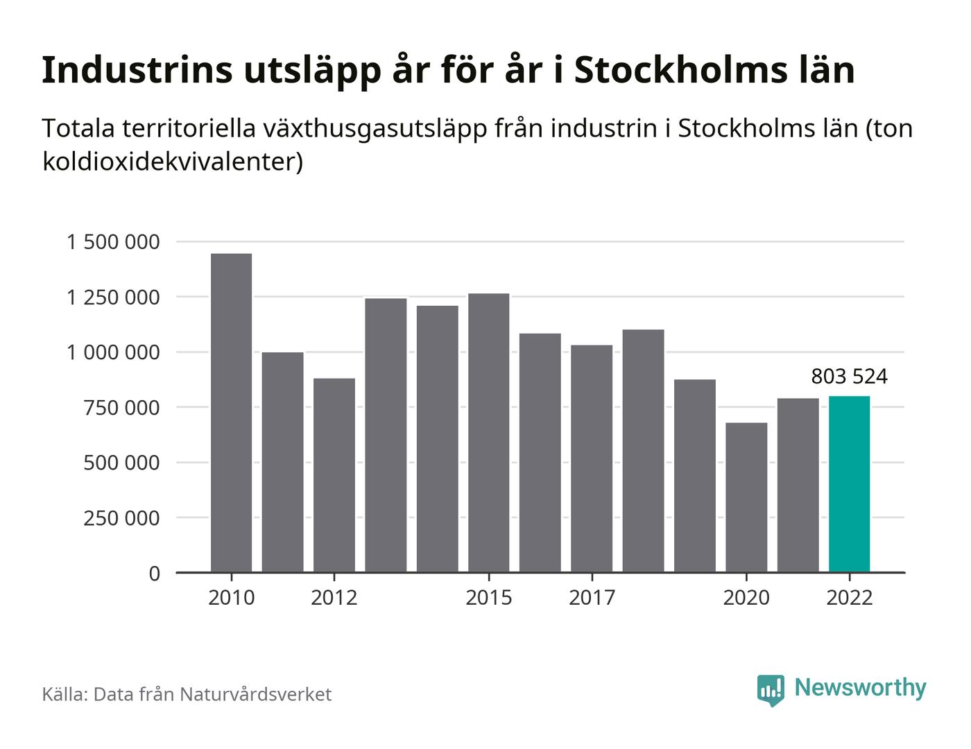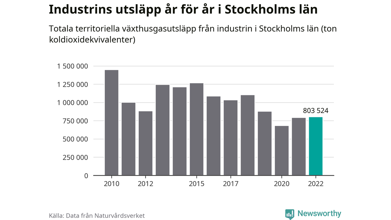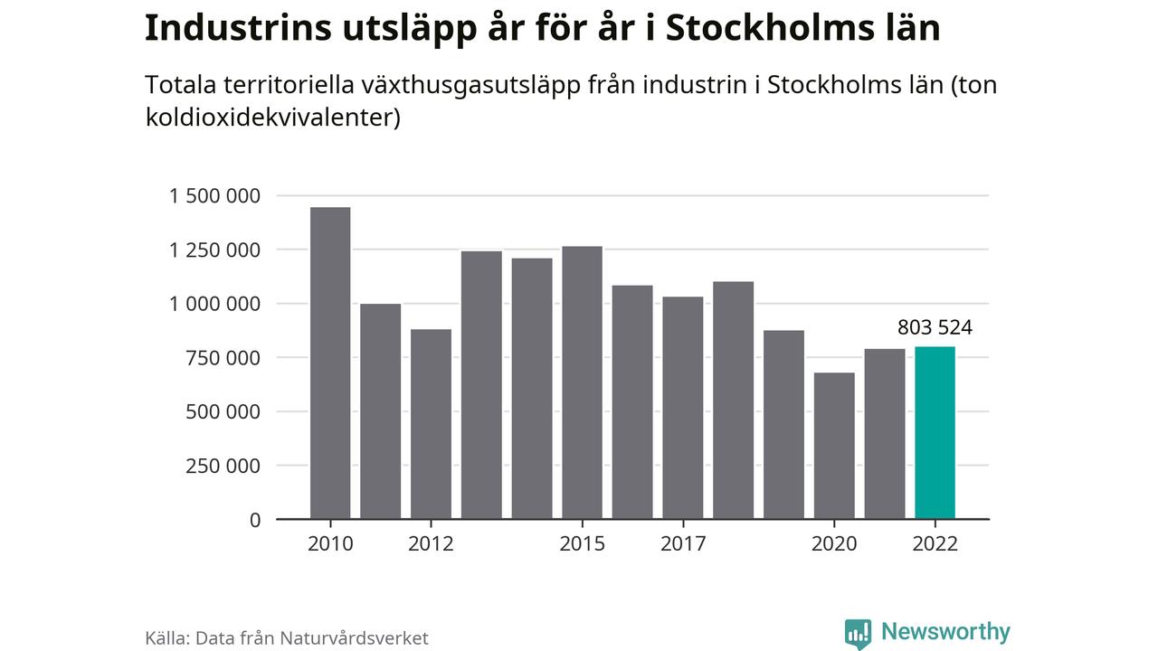 Stockholmsindustrierna släppte ut växthusgaser motsvarande omkring 804 000 ton koldioxid under år 2022. Det är ungefär lika mycket som året innan.