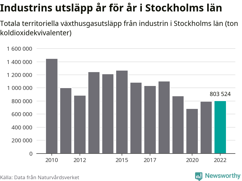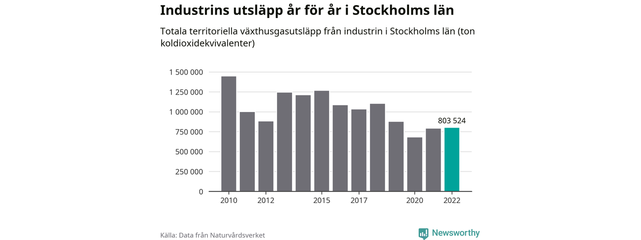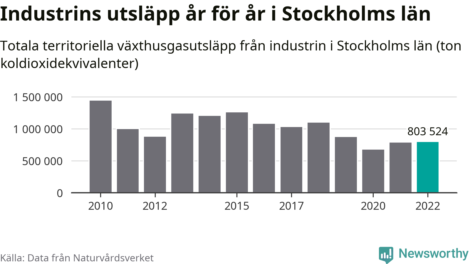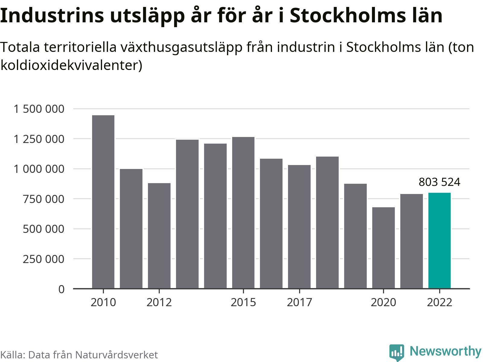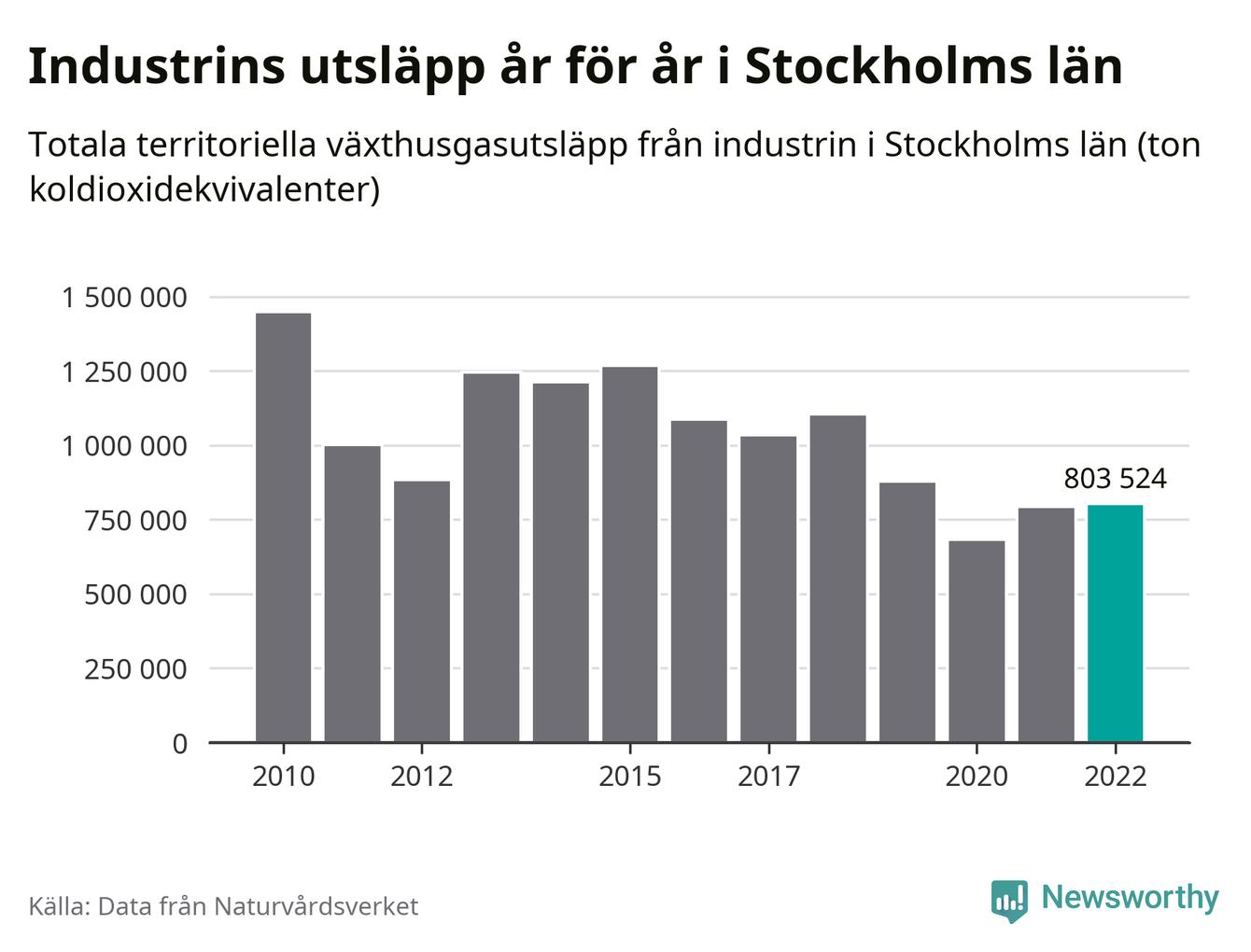 Stockholmsindustrierna släppte ut växthusgaser motsvarande omkring 804 000 ton koldioxid under år 2022. Det är ungefär lika mycket som året innan.