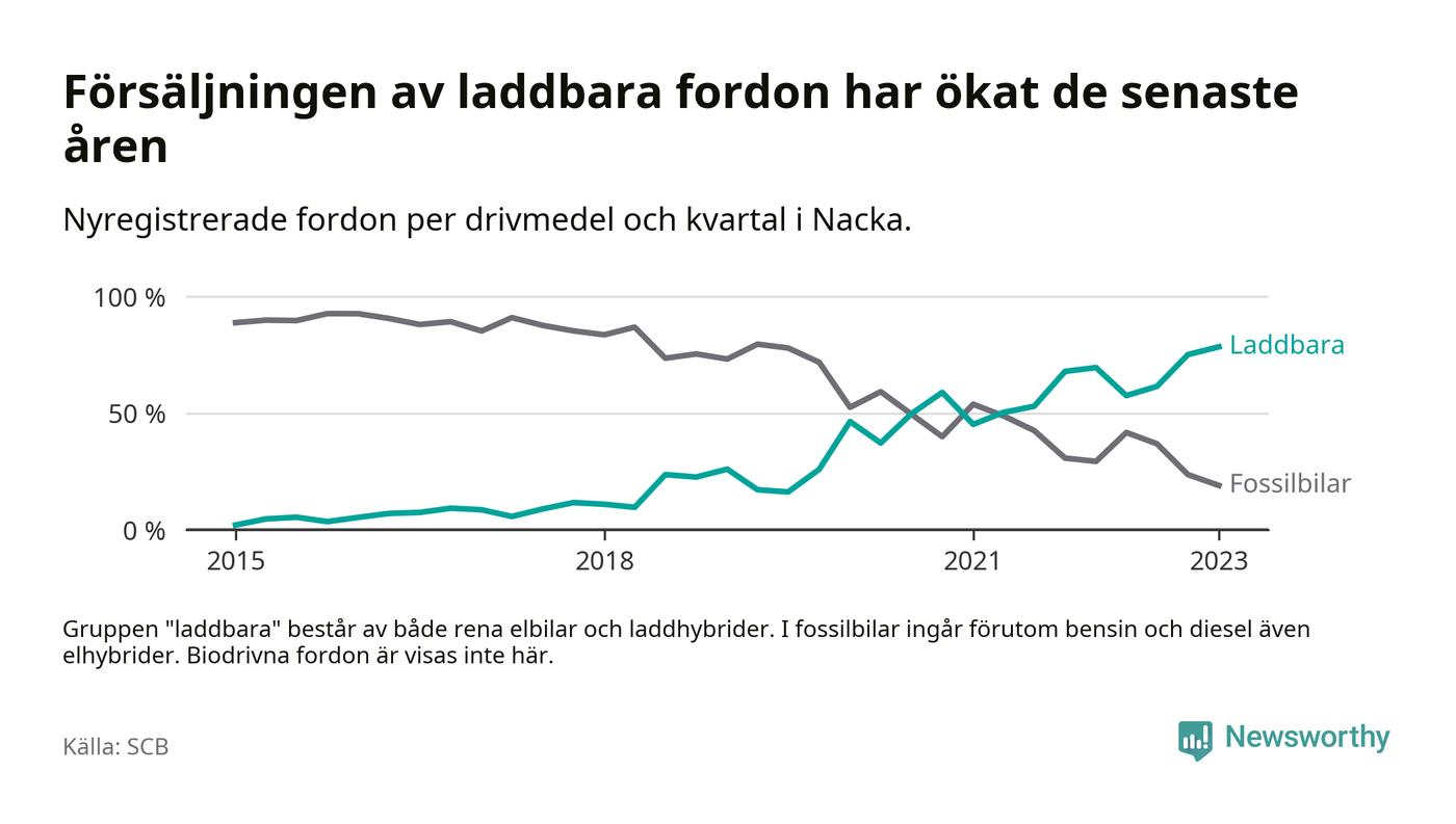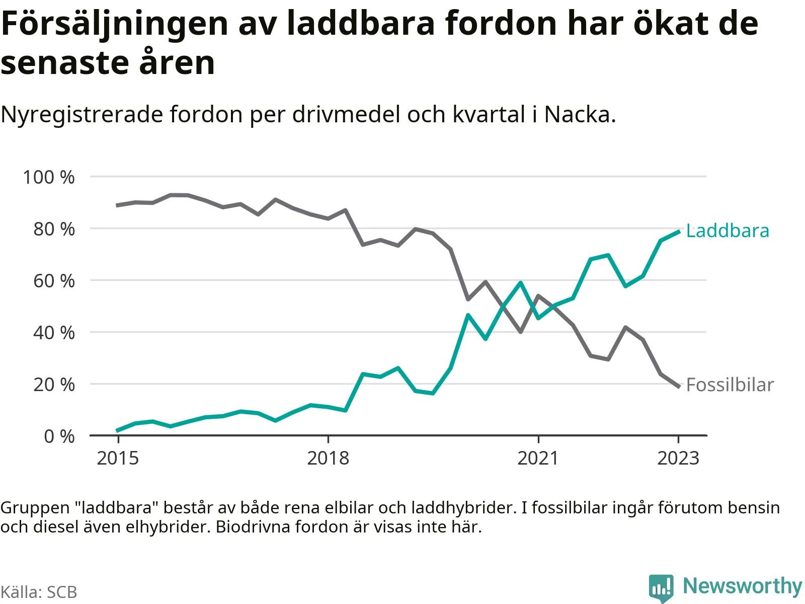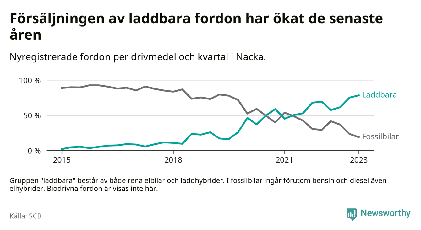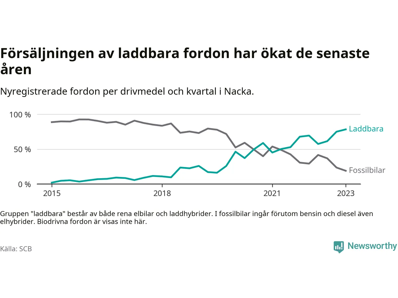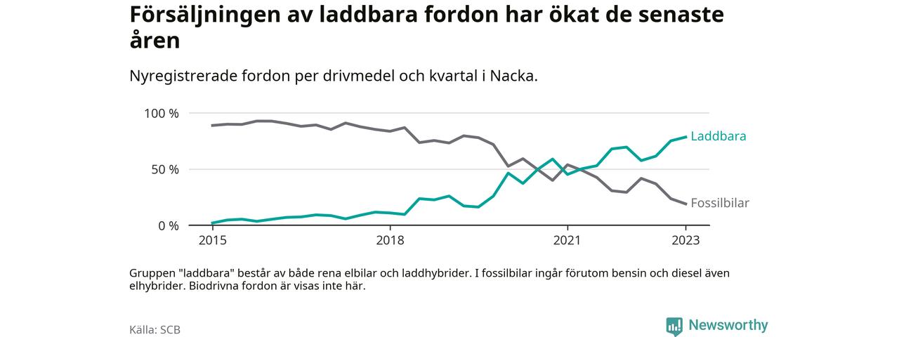 Under första kvartalet 2023 var 78 procent av alla nyregistrerade personbilar i Nacka laddbara (sammanlagt registrerades 1 395 nya bilar). Merparten av de laddbara bilarna var rena elbilar (53 procent av alla).