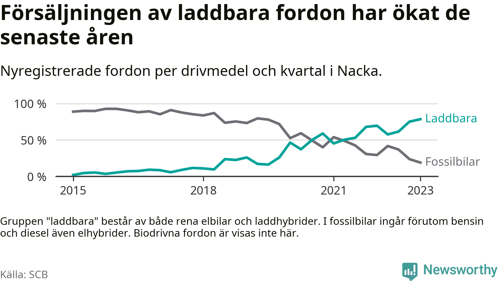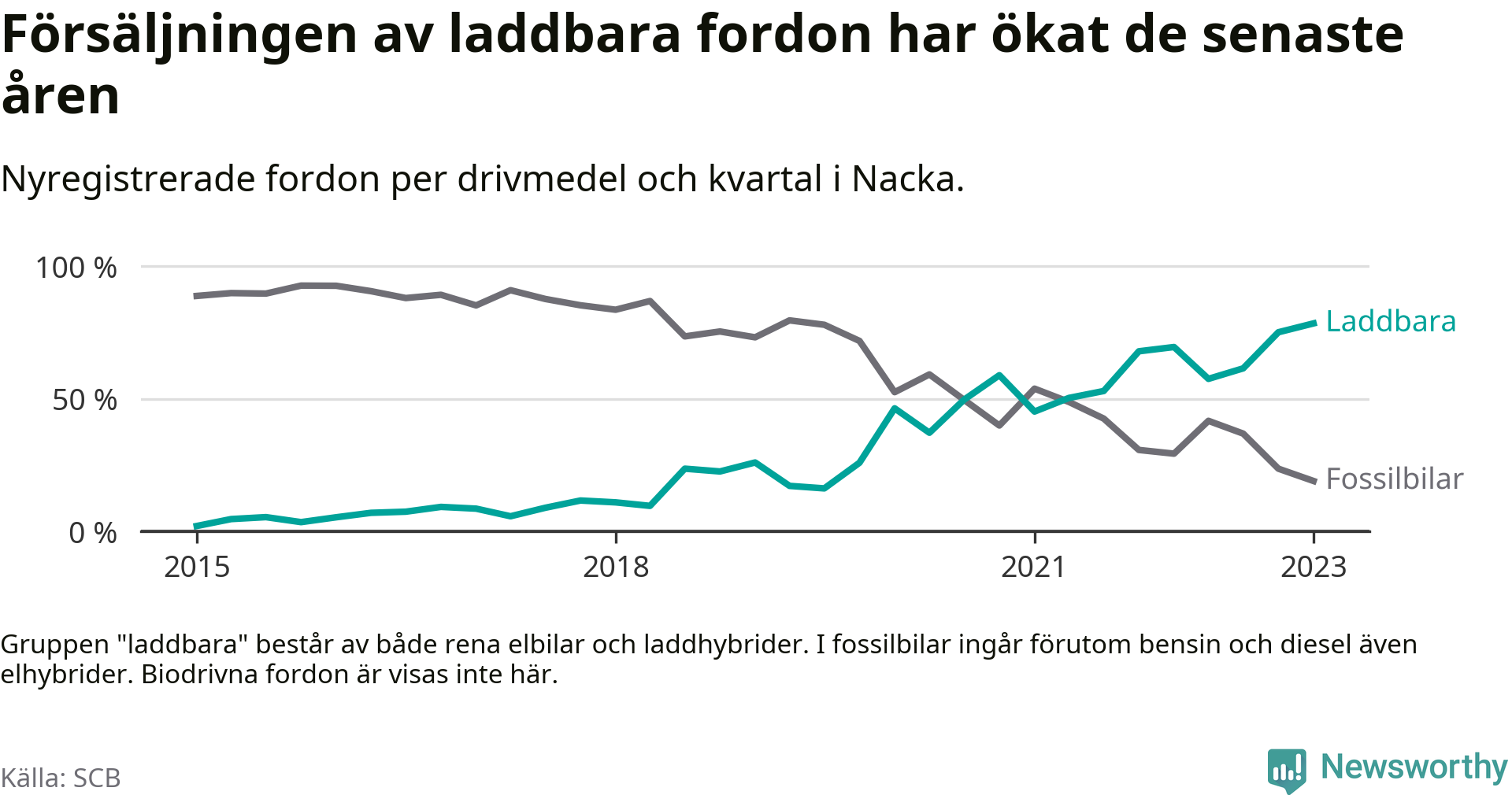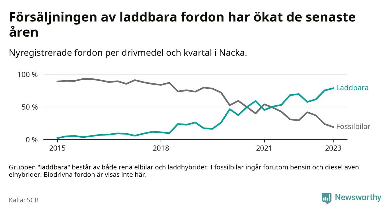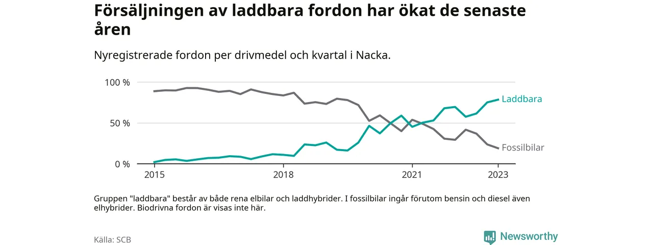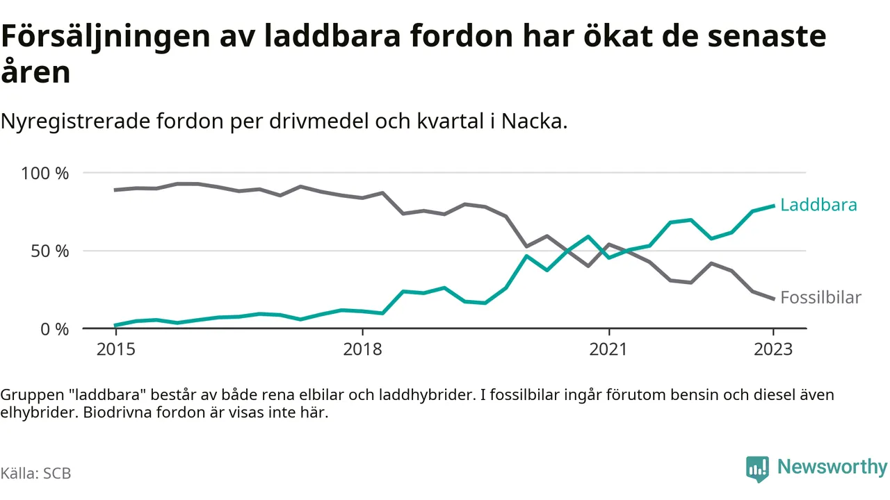 Under första kvartalet 2023 var 78 procent av alla nyregistrerade personbilar i Nacka laddbara (sammanlagt registrerades 1 395 nya bilar). Merparten av de laddbara bilarna var rena elbilar (53 procent av alla).