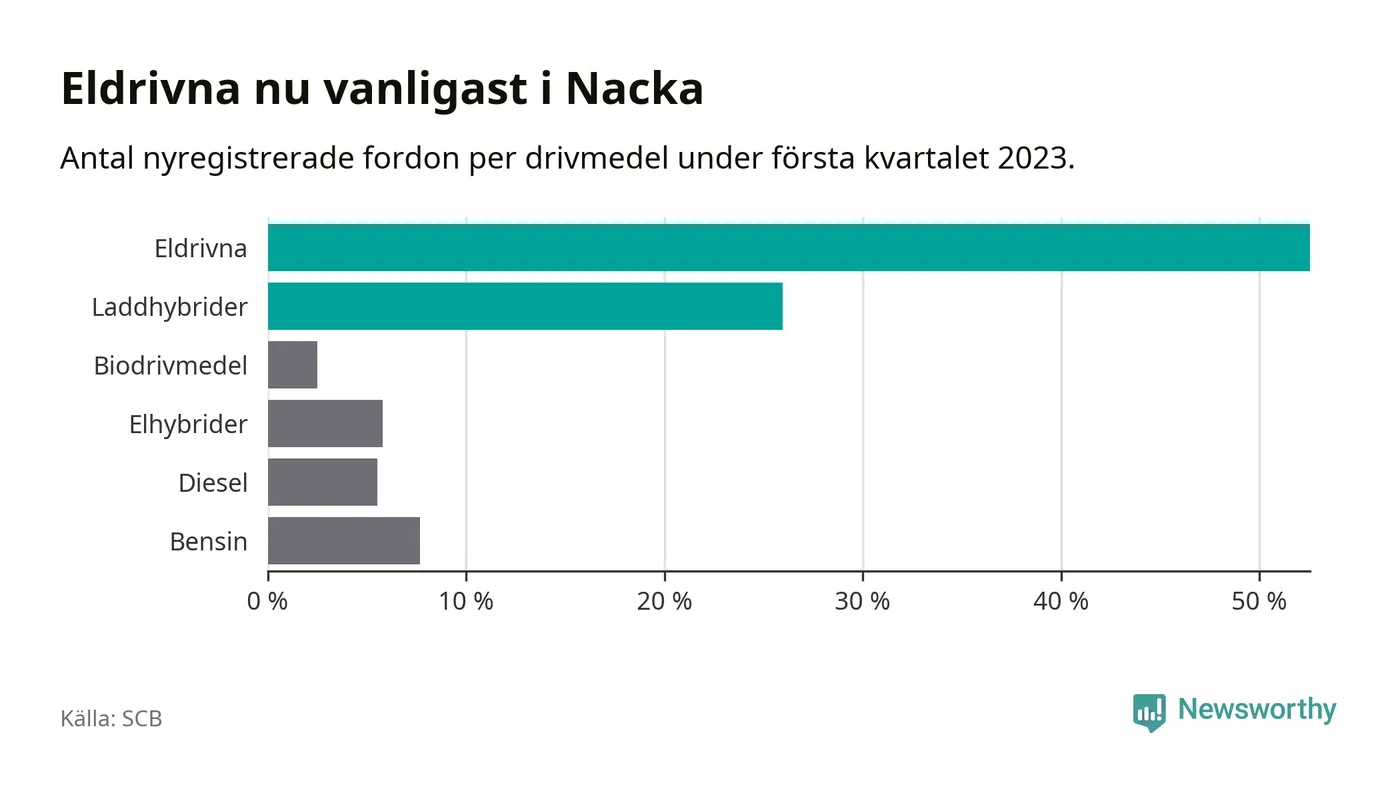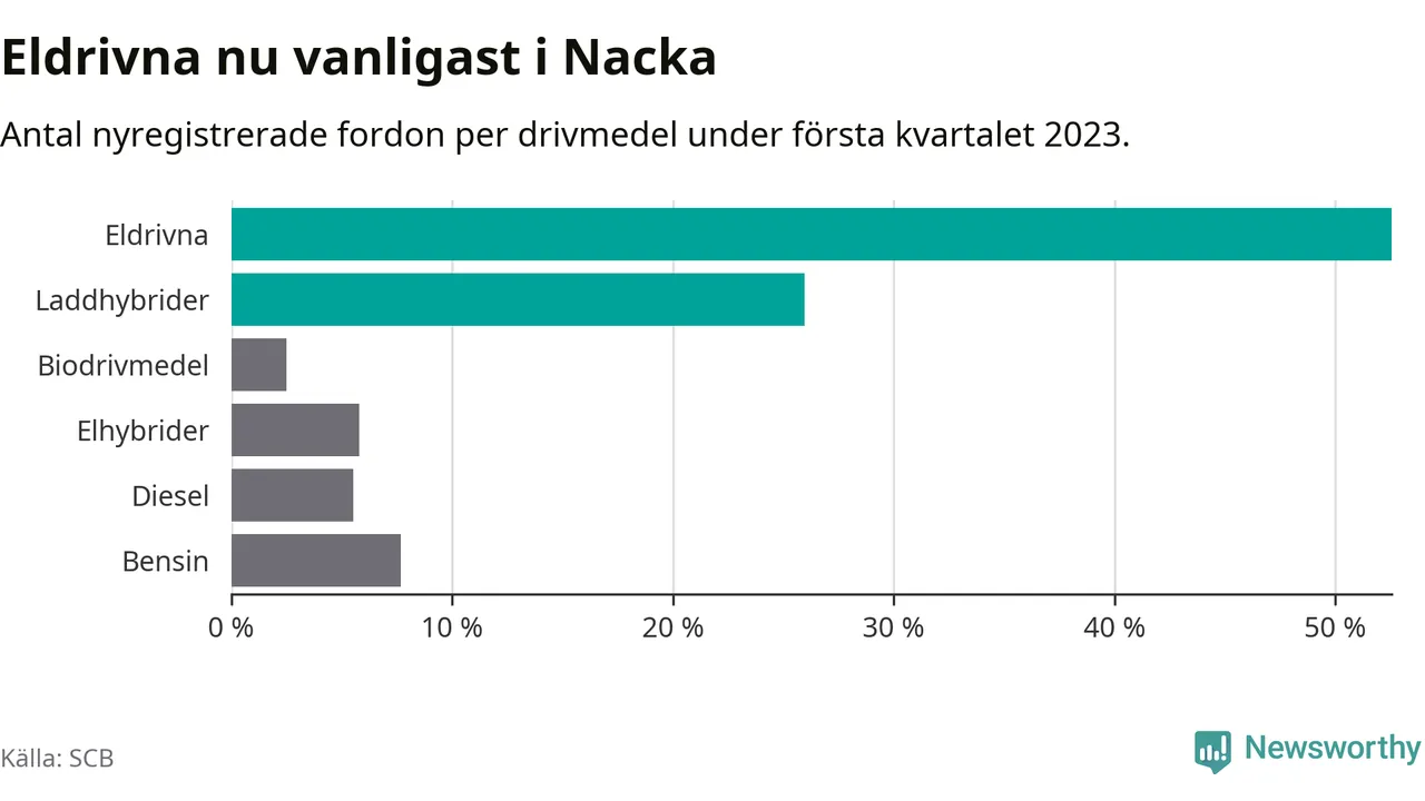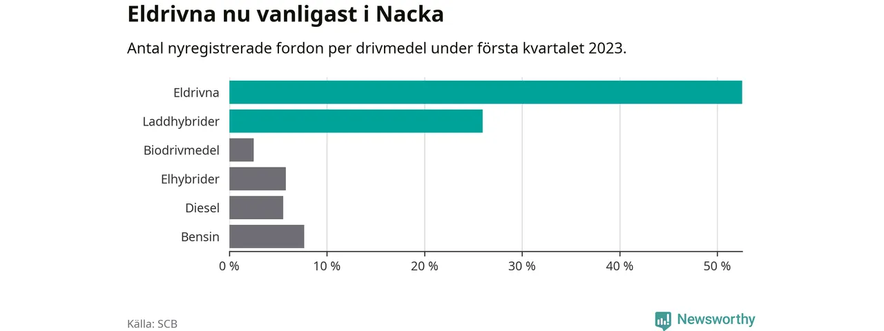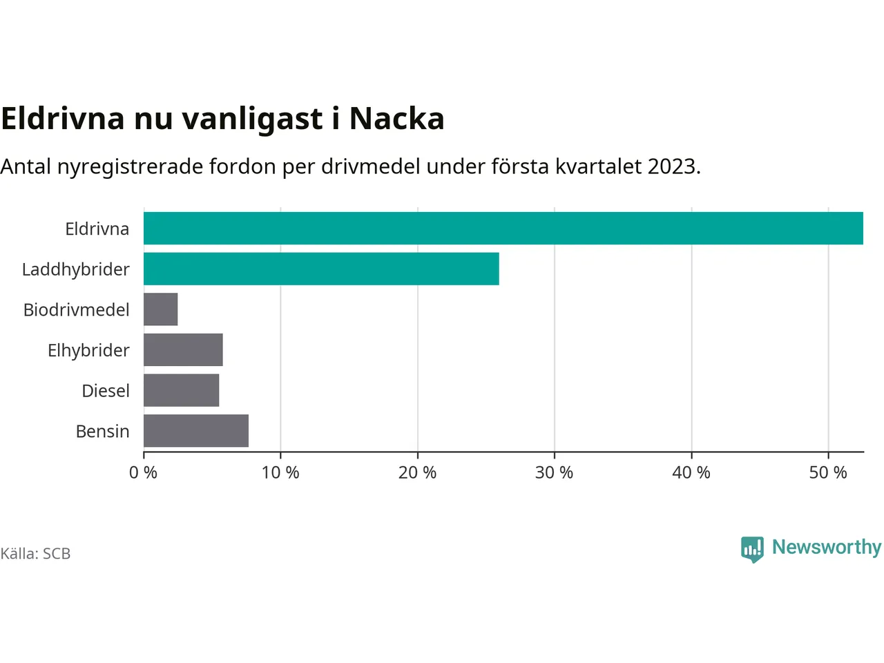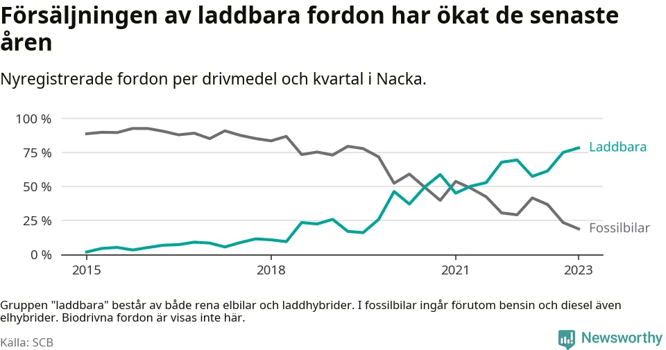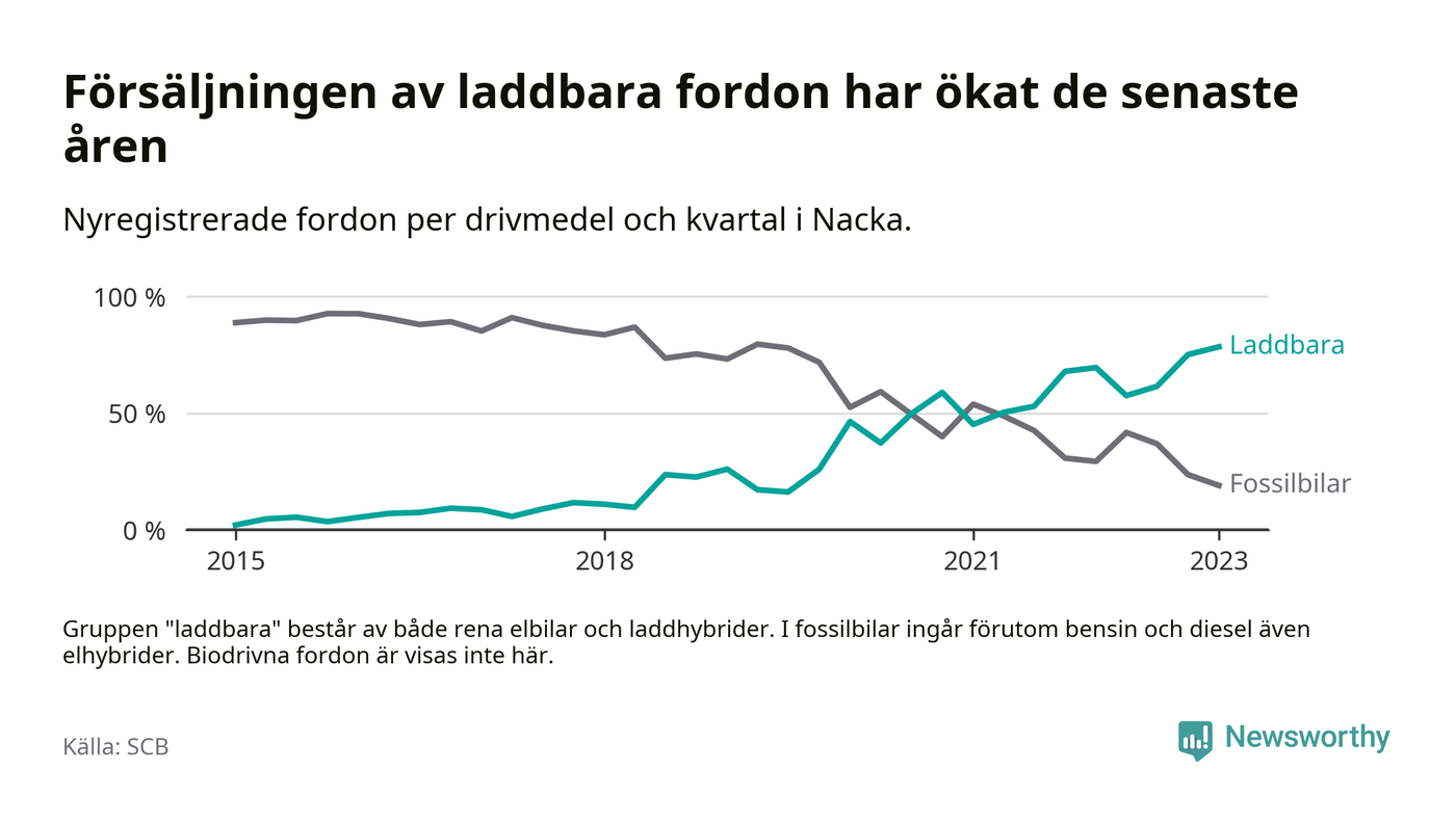 Under första kvartalet 2023 var 78 procent av alla nyregistrerade personbilar i Nacka laddbara (sammanlagt registrerades 1 395 nya bilar). Merparten av de laddbara bilarna var rena elbilar (53 procent av alla).