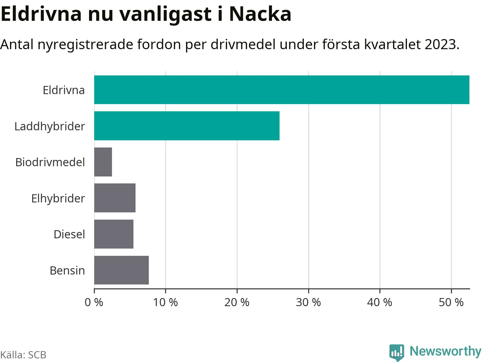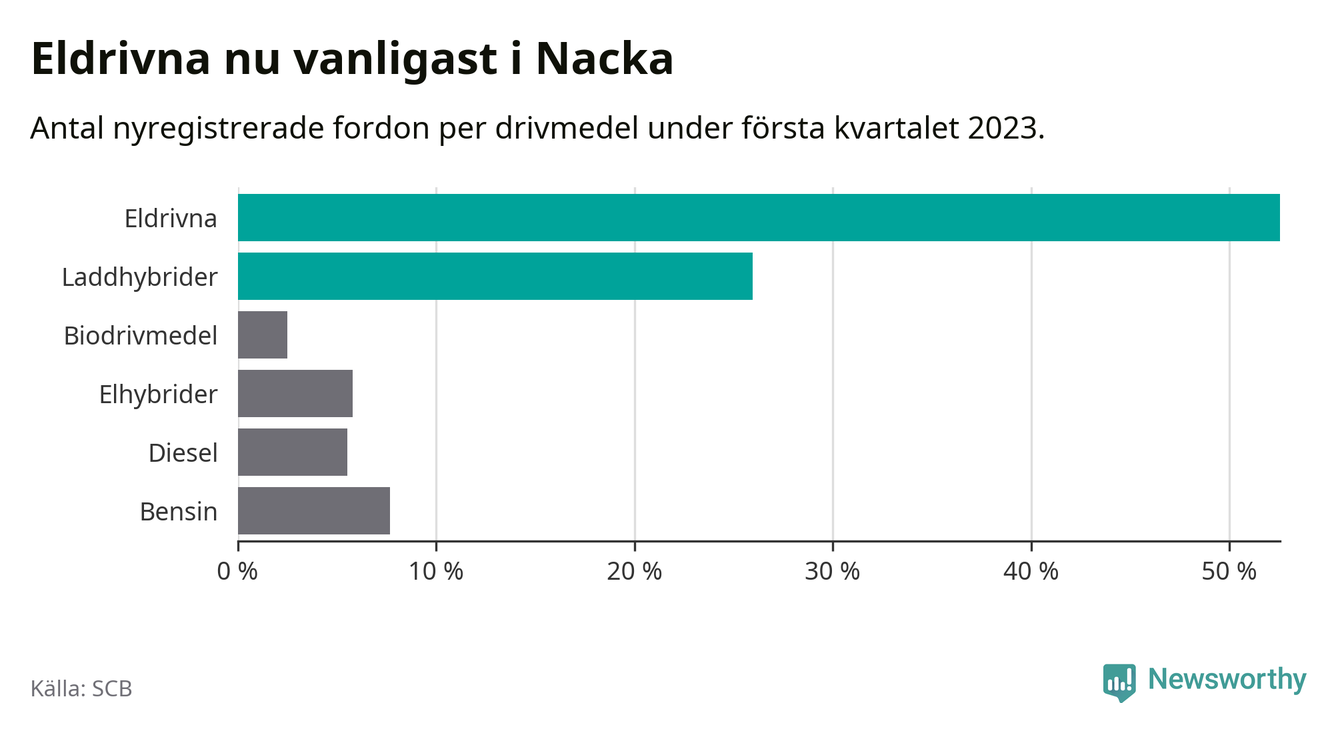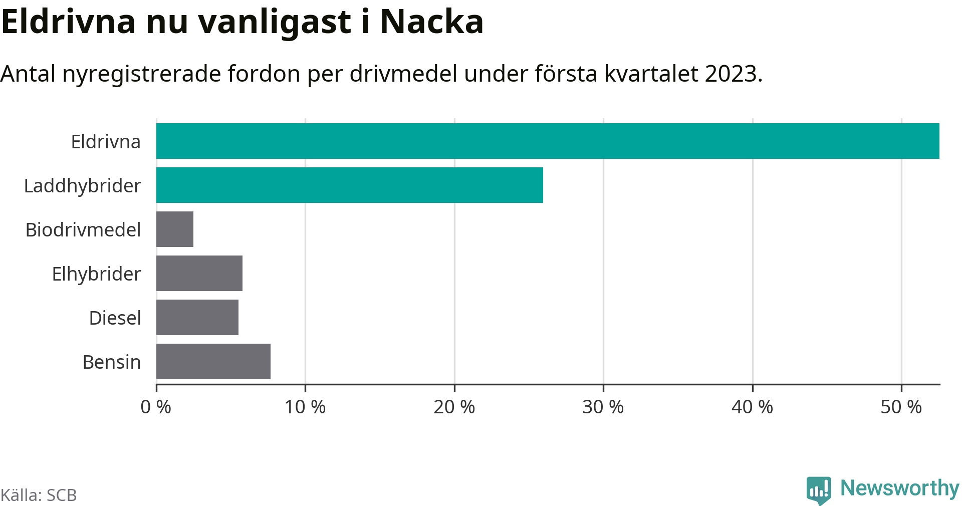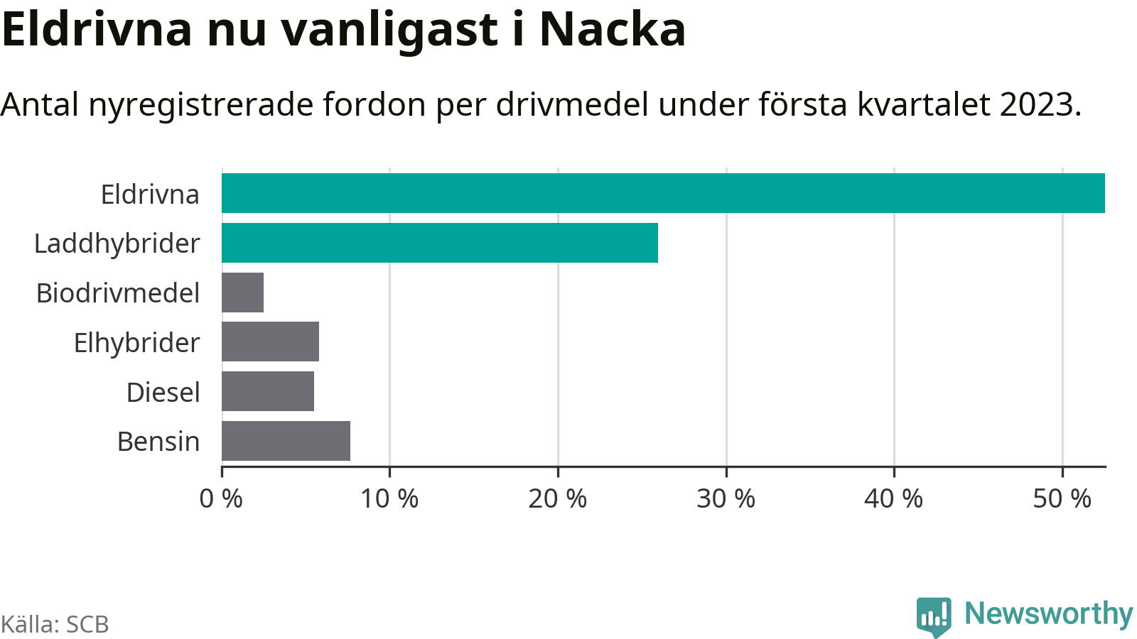 Under första kvartalet 2023 var 78 procent av alla nyregistrerade personbilar i Nacka laddbara (sammanlagt registrerades 1 395 nya bilar). Merparten av de laddbara bilarna var rena elbilar (53 procent av alla).