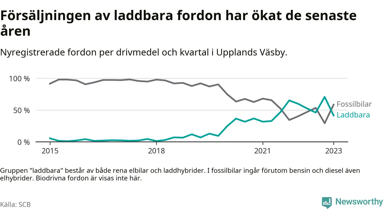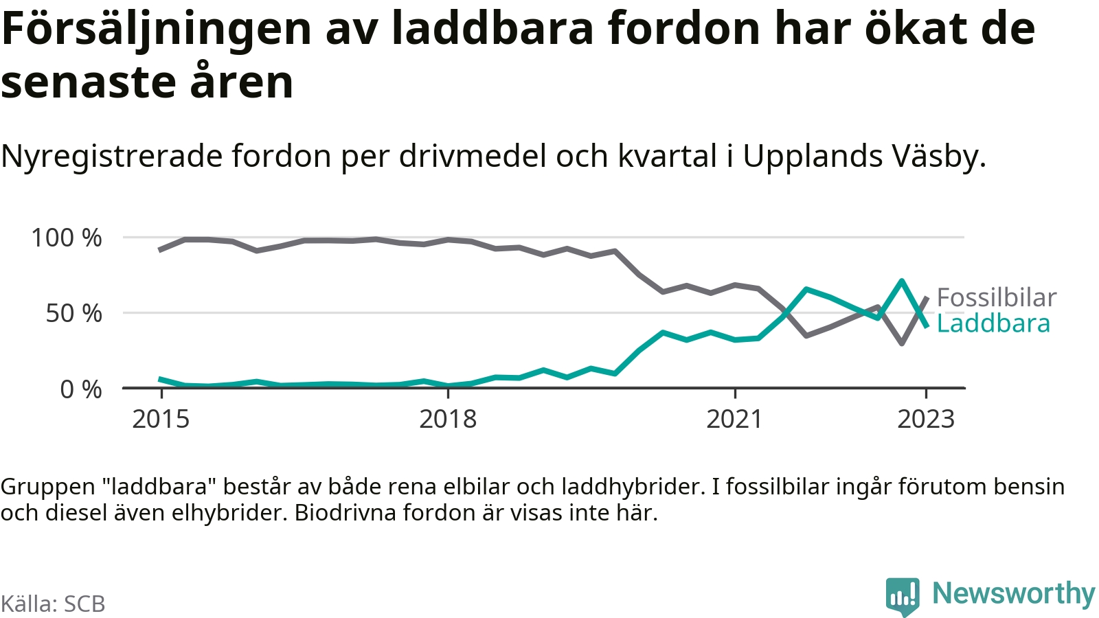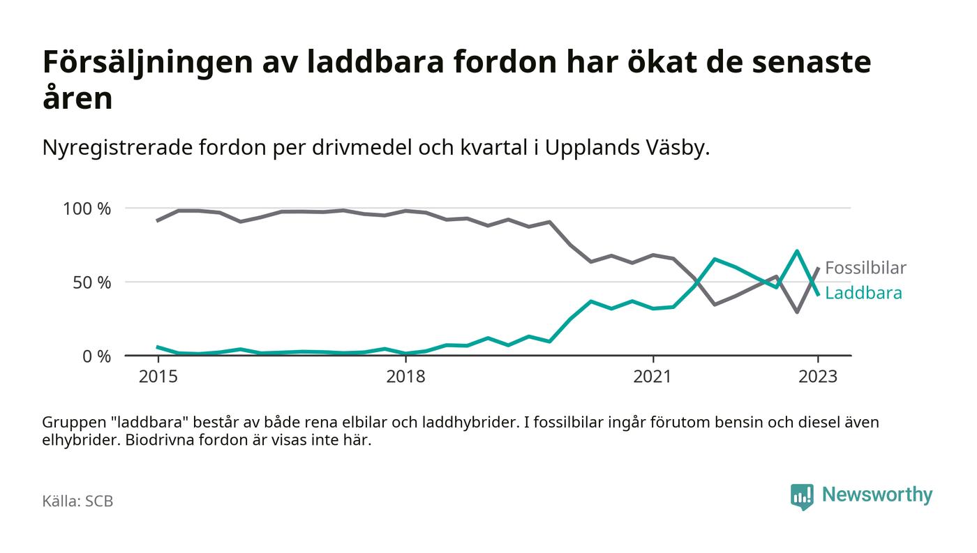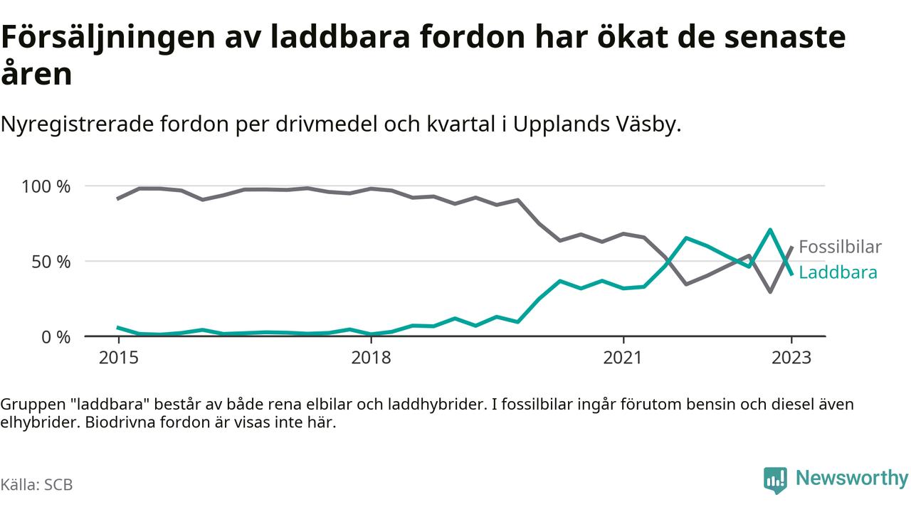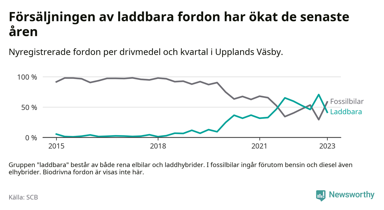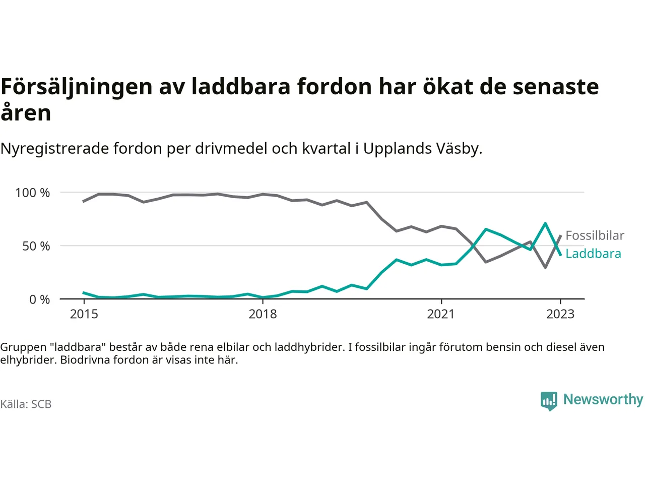 Under första kvartalet 2023 var 42 procent av alla nyregistrerade personbilar i Upplands Väsby laddbara (sammanlagt registrerades 171 nya bilar). Merparten av de laddbara bilarna var rena elbilar (26 procent av alla).