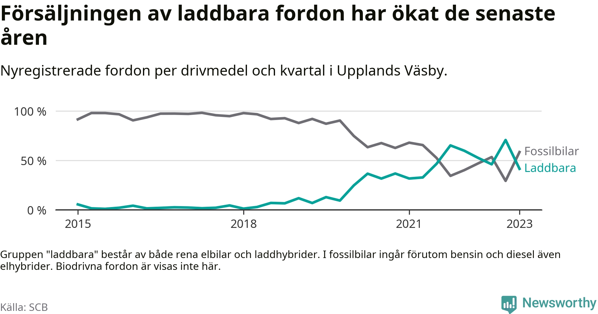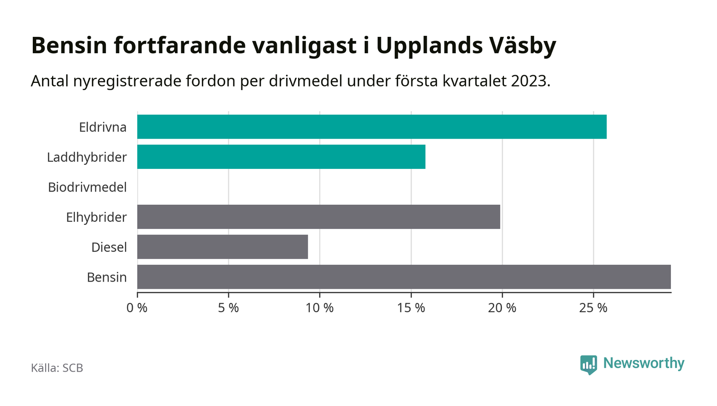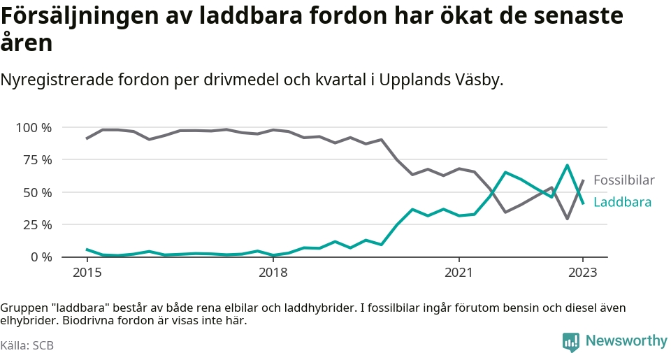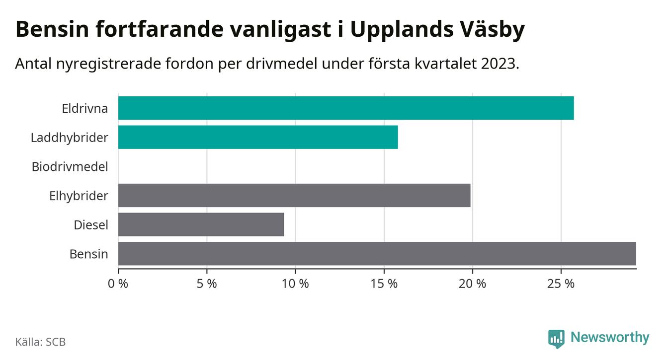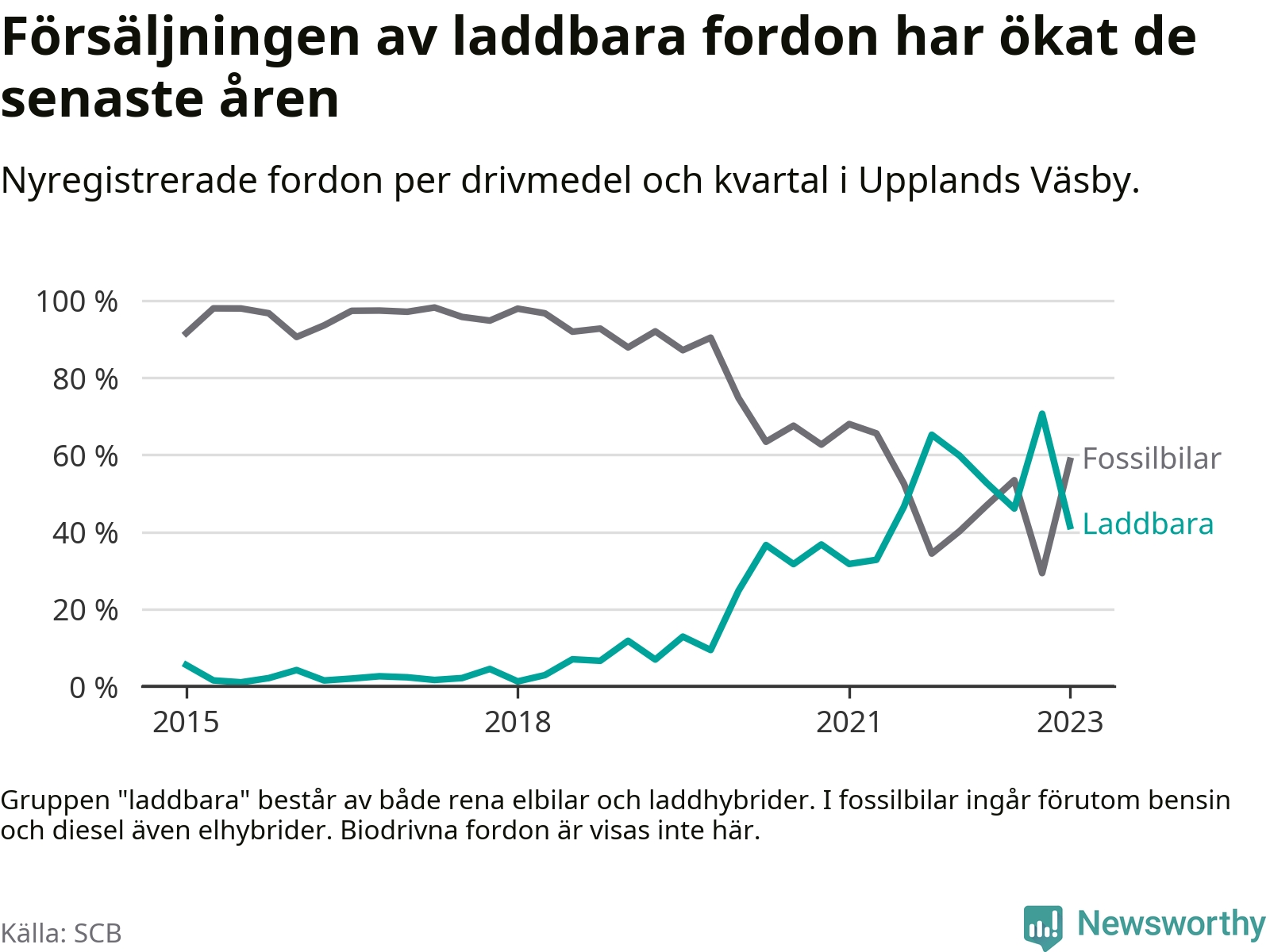 Under första kvartalet 2023 var 42 procent av alla nyregistrerade personbilar i Upplands Väsby laddbara (sammanlagt registrerades 171 nya bilar). Merparten av de laddbara bilarna var rena elbilar (26 procent av alla).