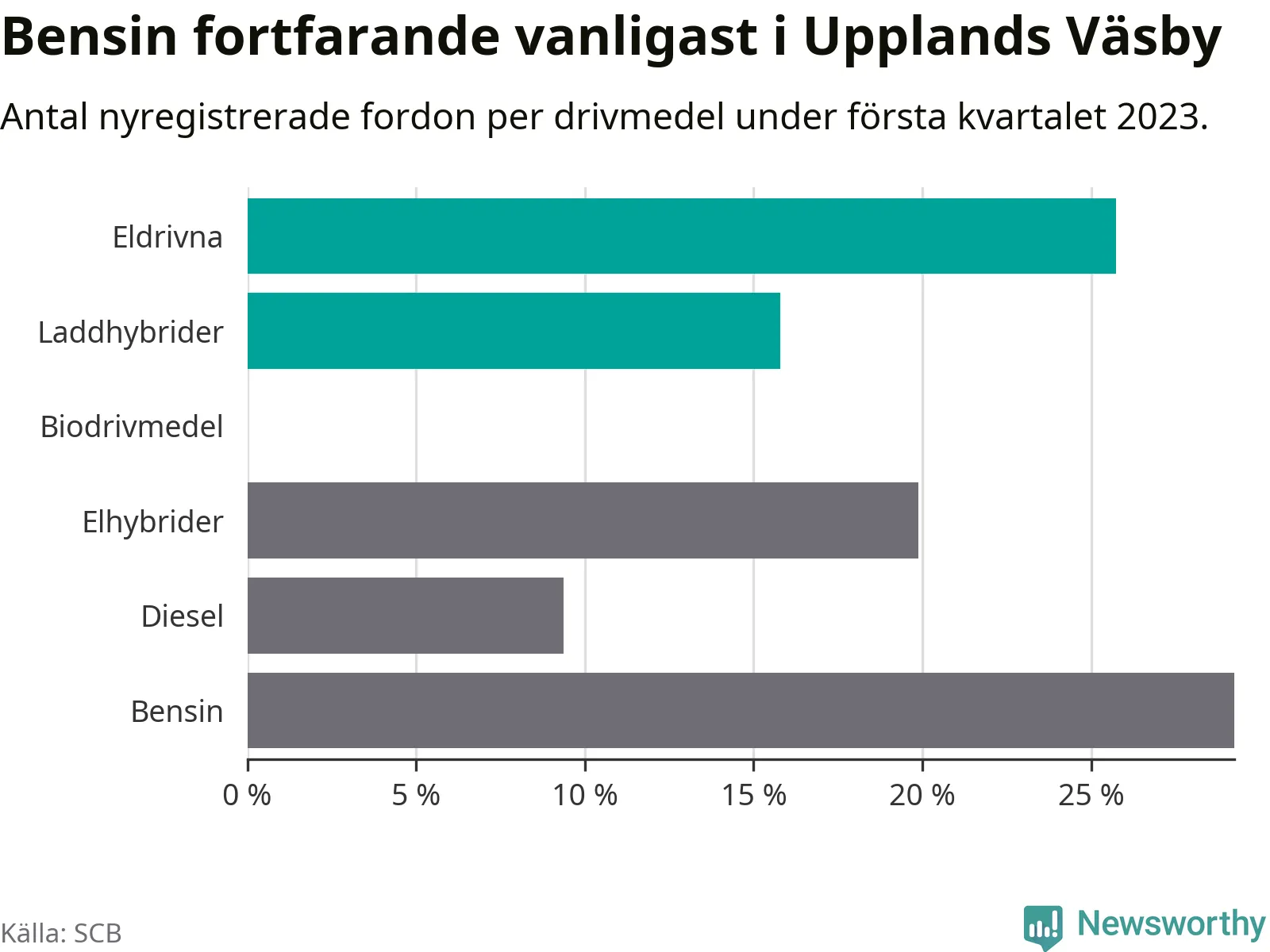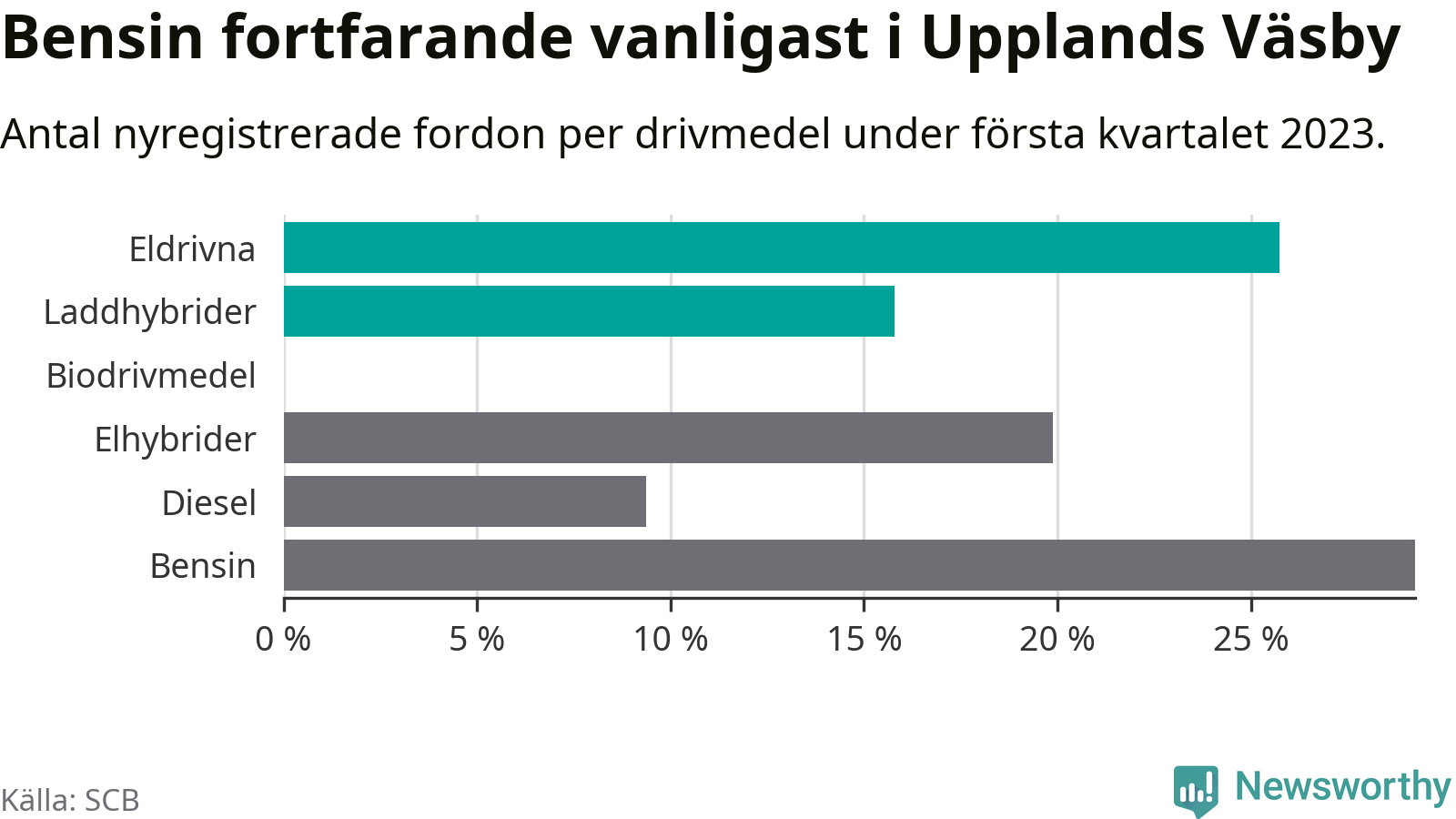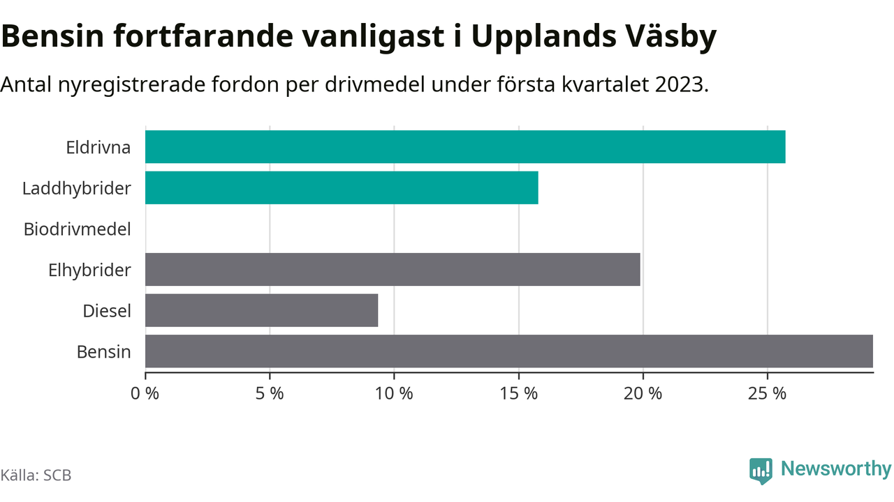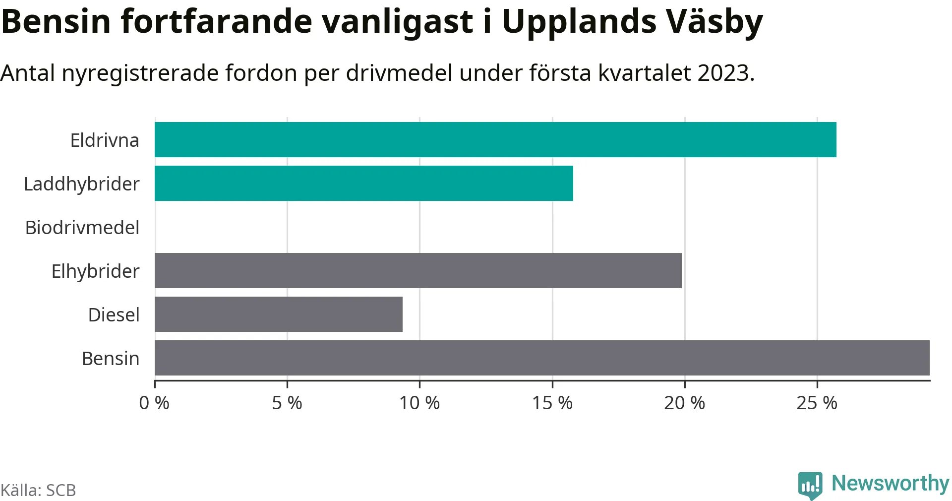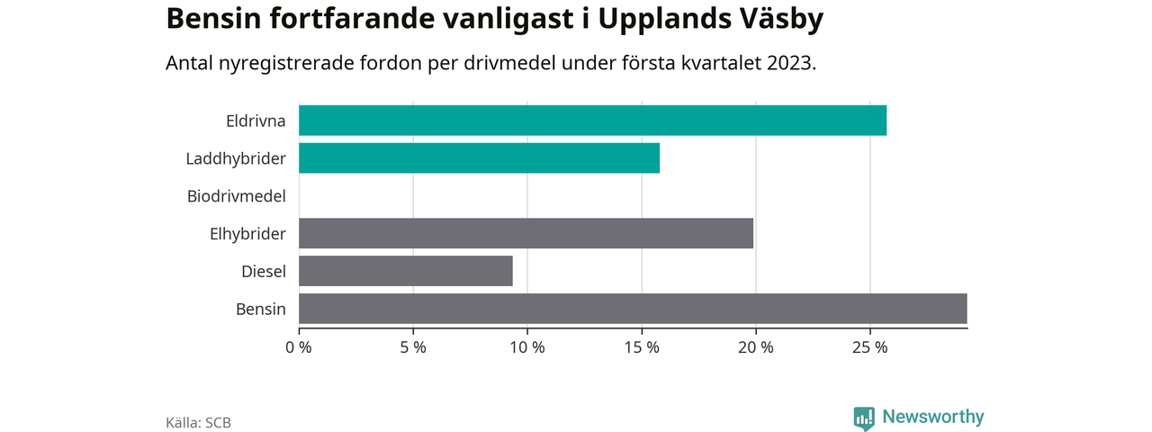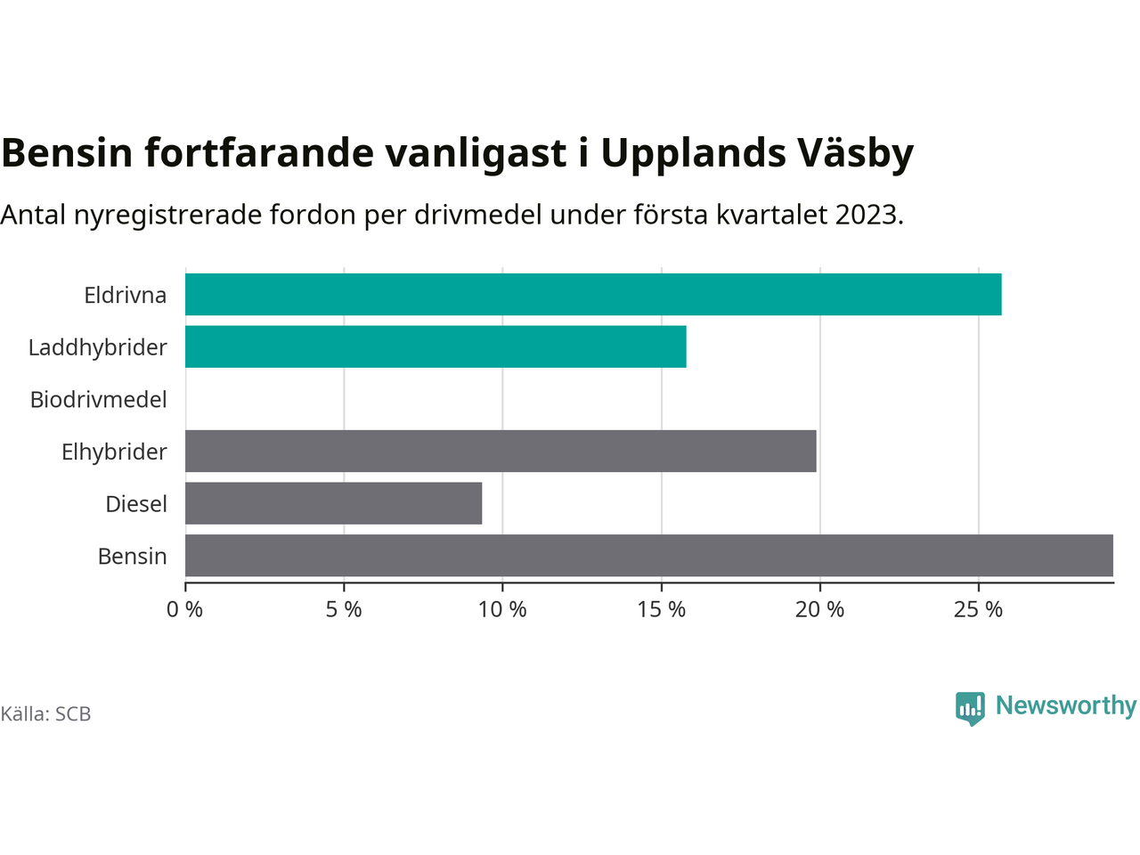 Under första kvartalet 2023 var 42 procent av alla nyregistrerade personbilar i Upplands Väsby laddbara (sammanlagt registrerades 171 nya bilar). Merparten av de laddbara bilarna var rena elbilar (26 procent av alla).