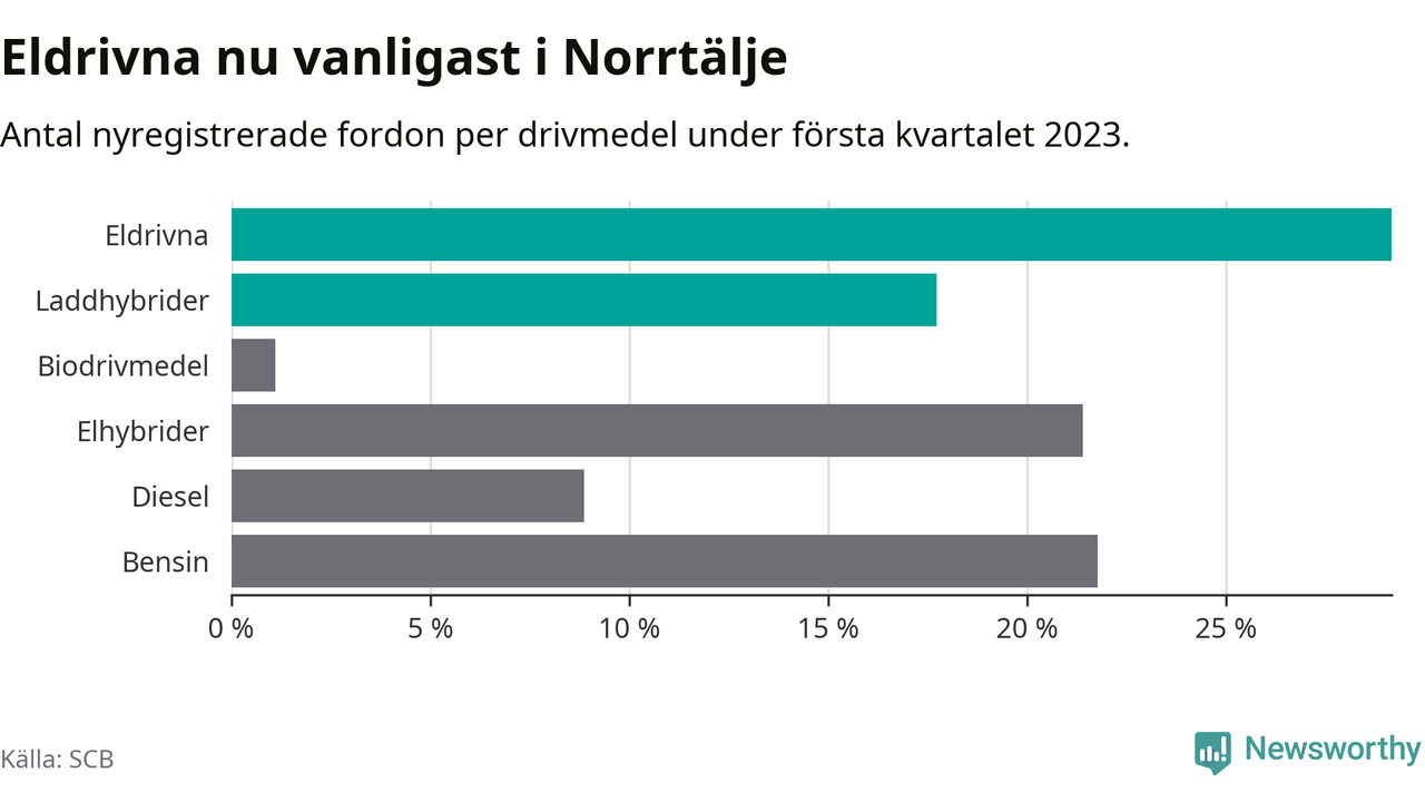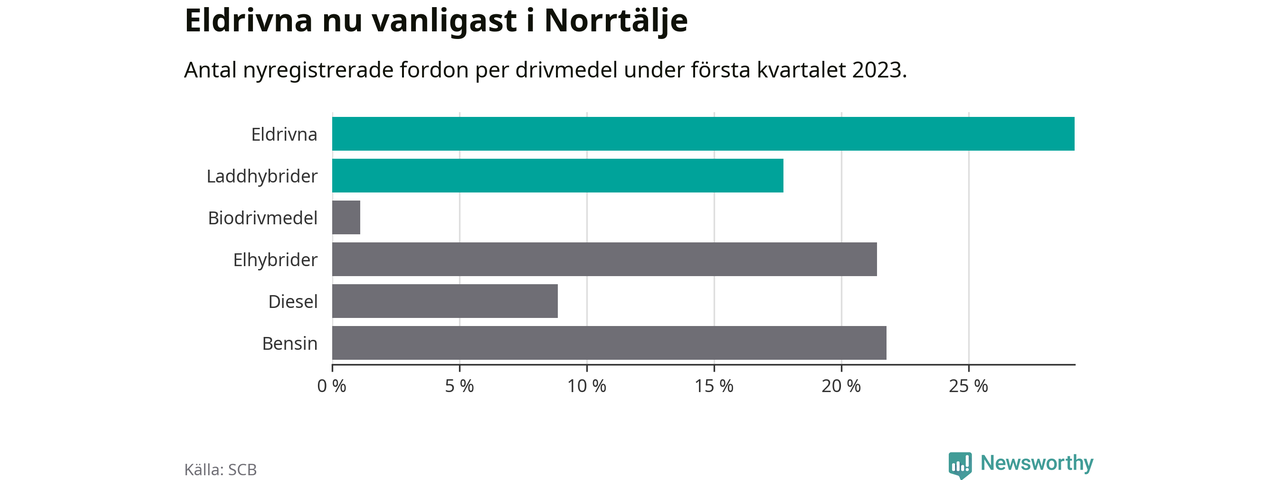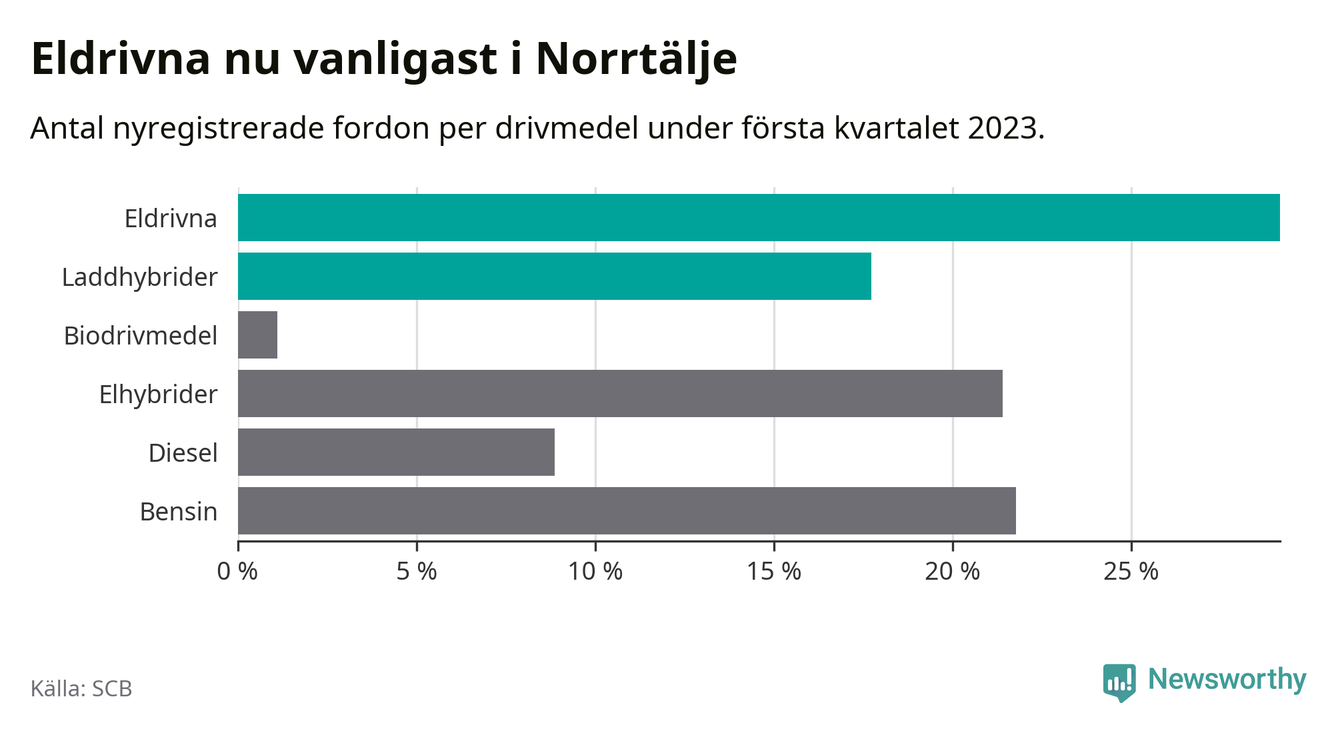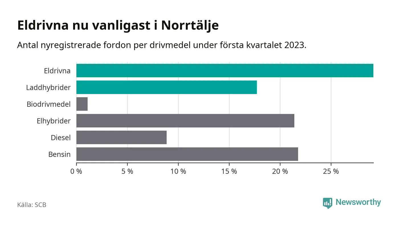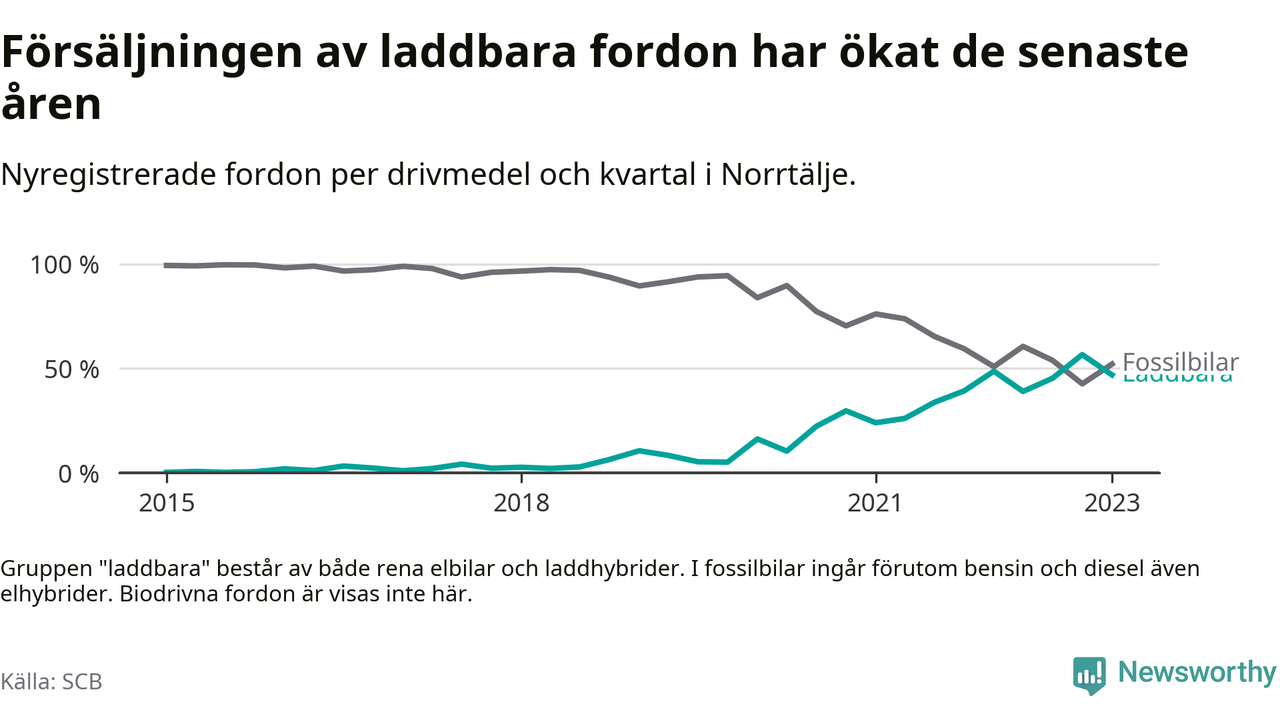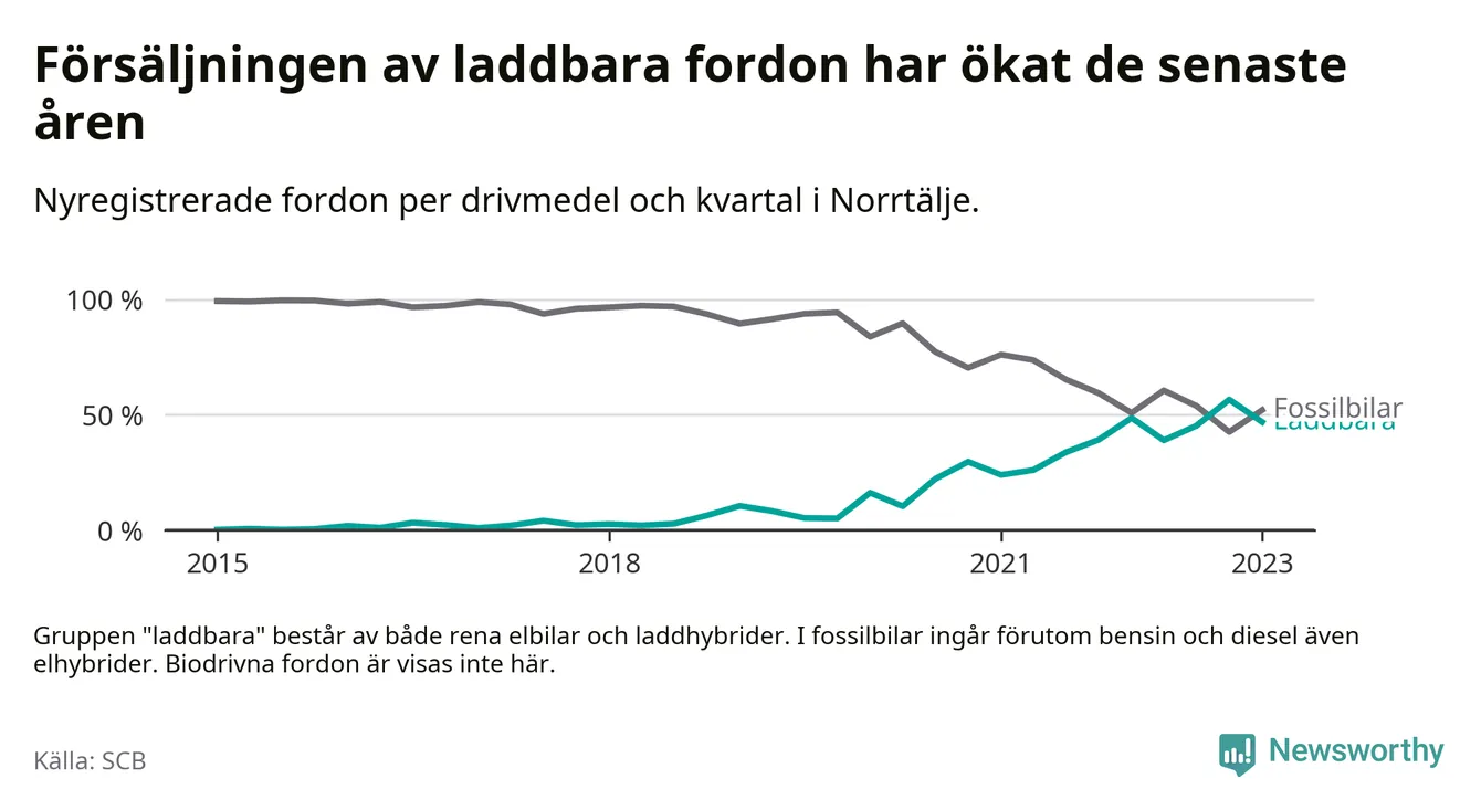 Under första kvartalet 2023 var 47 procent av alla nyregistrerade personbilar i Norrtälje laddbara (sammanlagt registrerades 271 nya bilar). Merparten av de laddbara bilarna var rena elbilar (29 procent av alla).