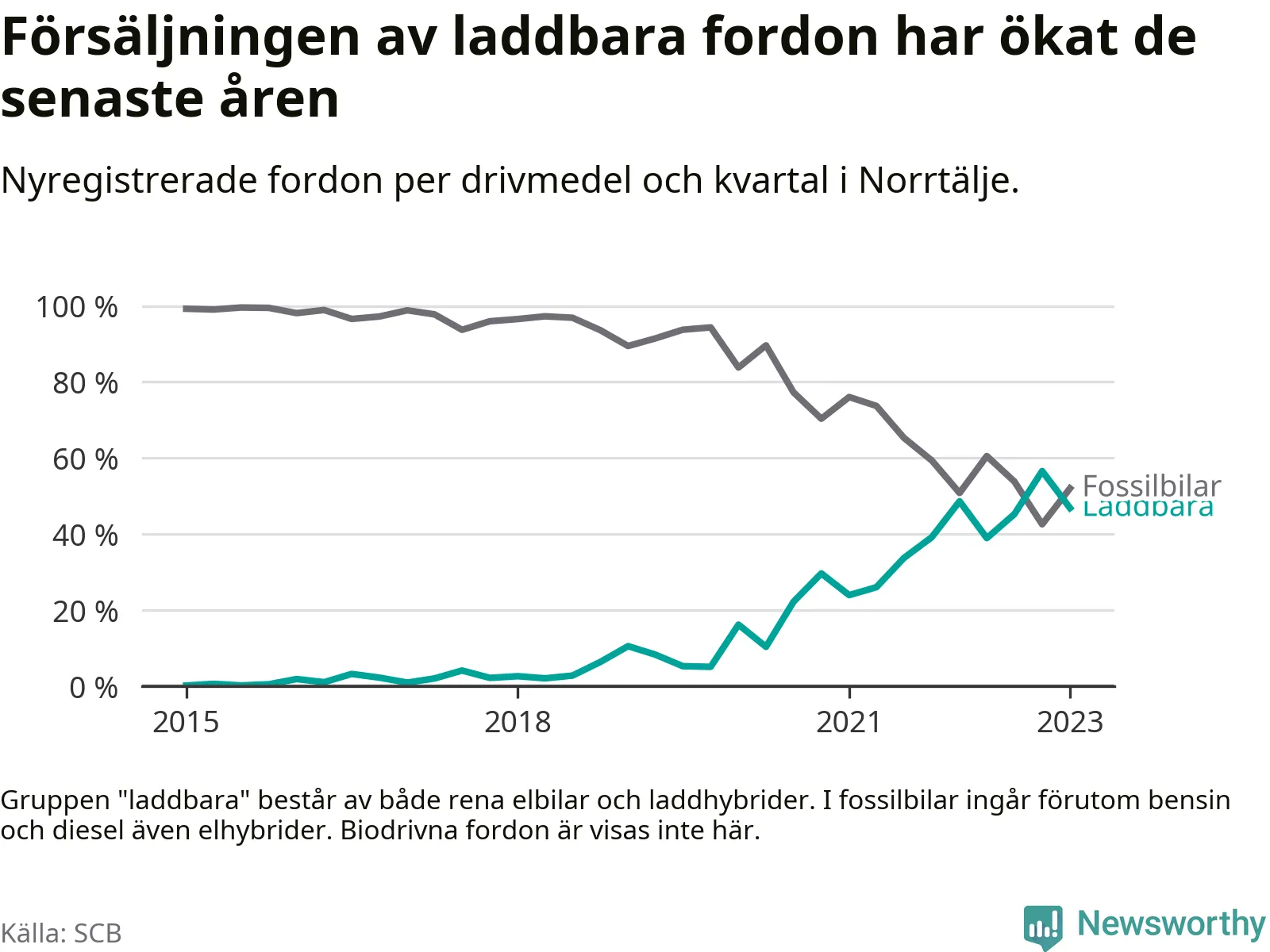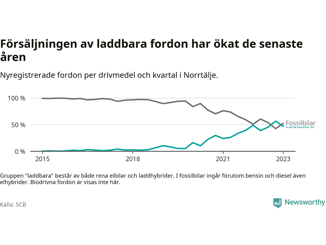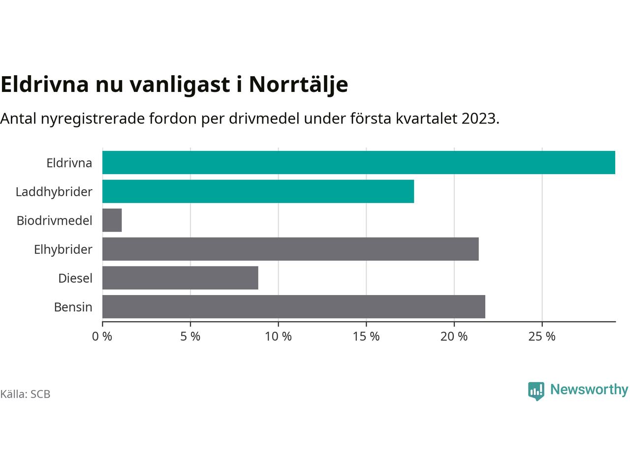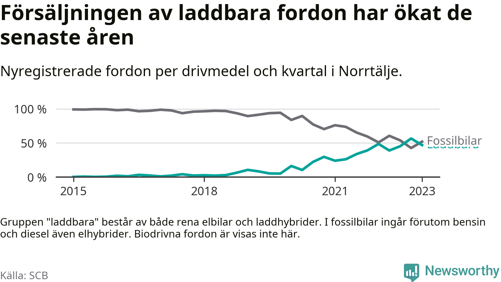 Under första kvartalet 2023 var 47 procent av alla nyregistrerade personbilar i Norrtälje laddbara (sammanlagt registrerades 271 nya bilar). Merparten av de laddbara bilarna var rena elbilar (29 procent av alla).
