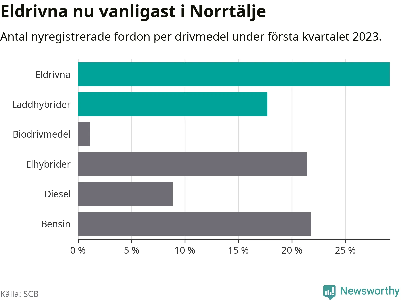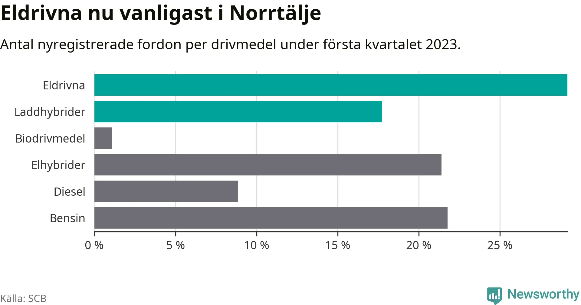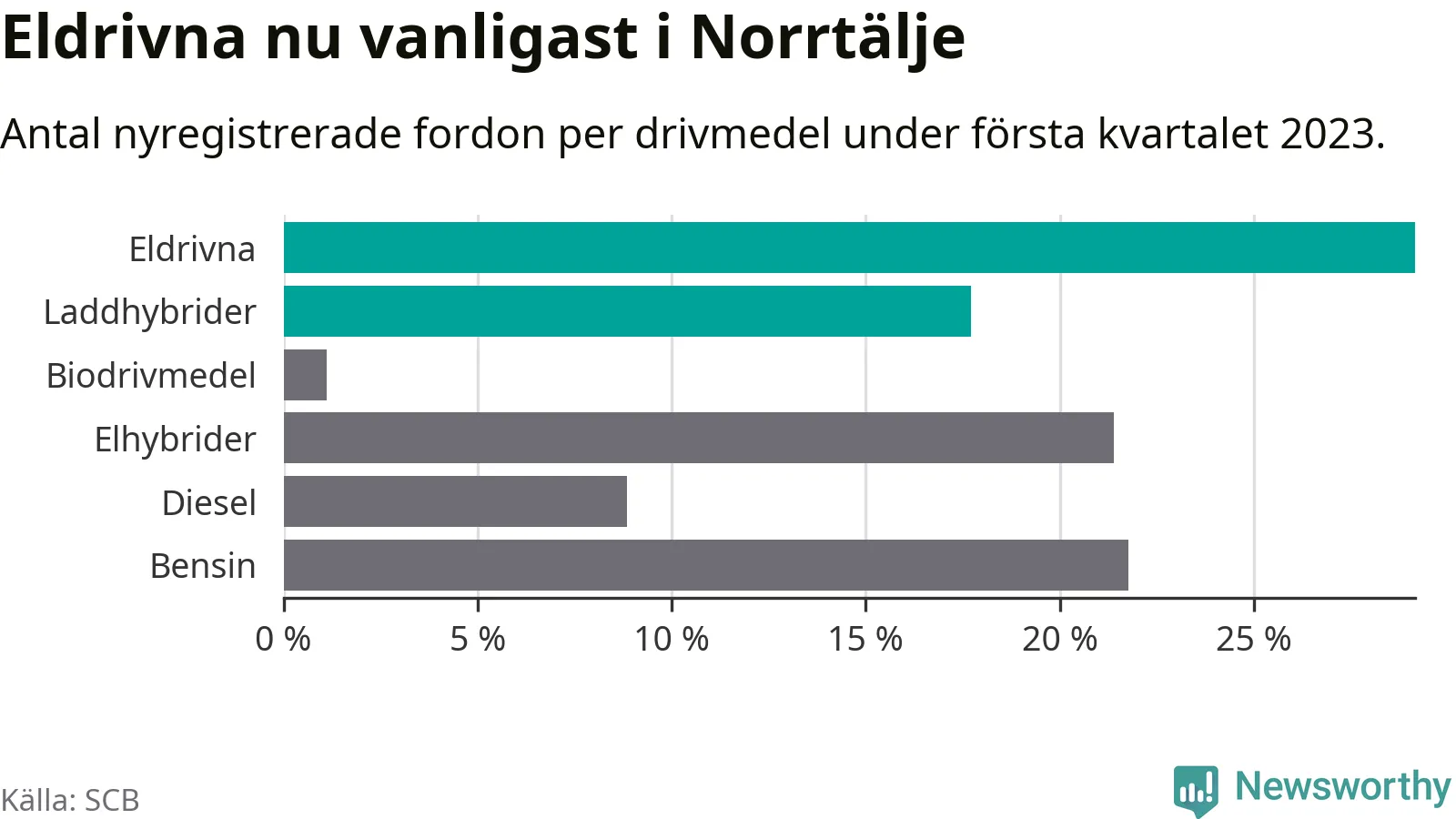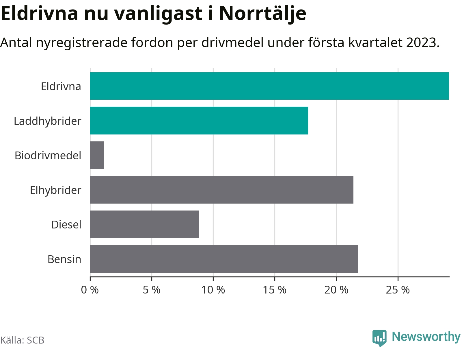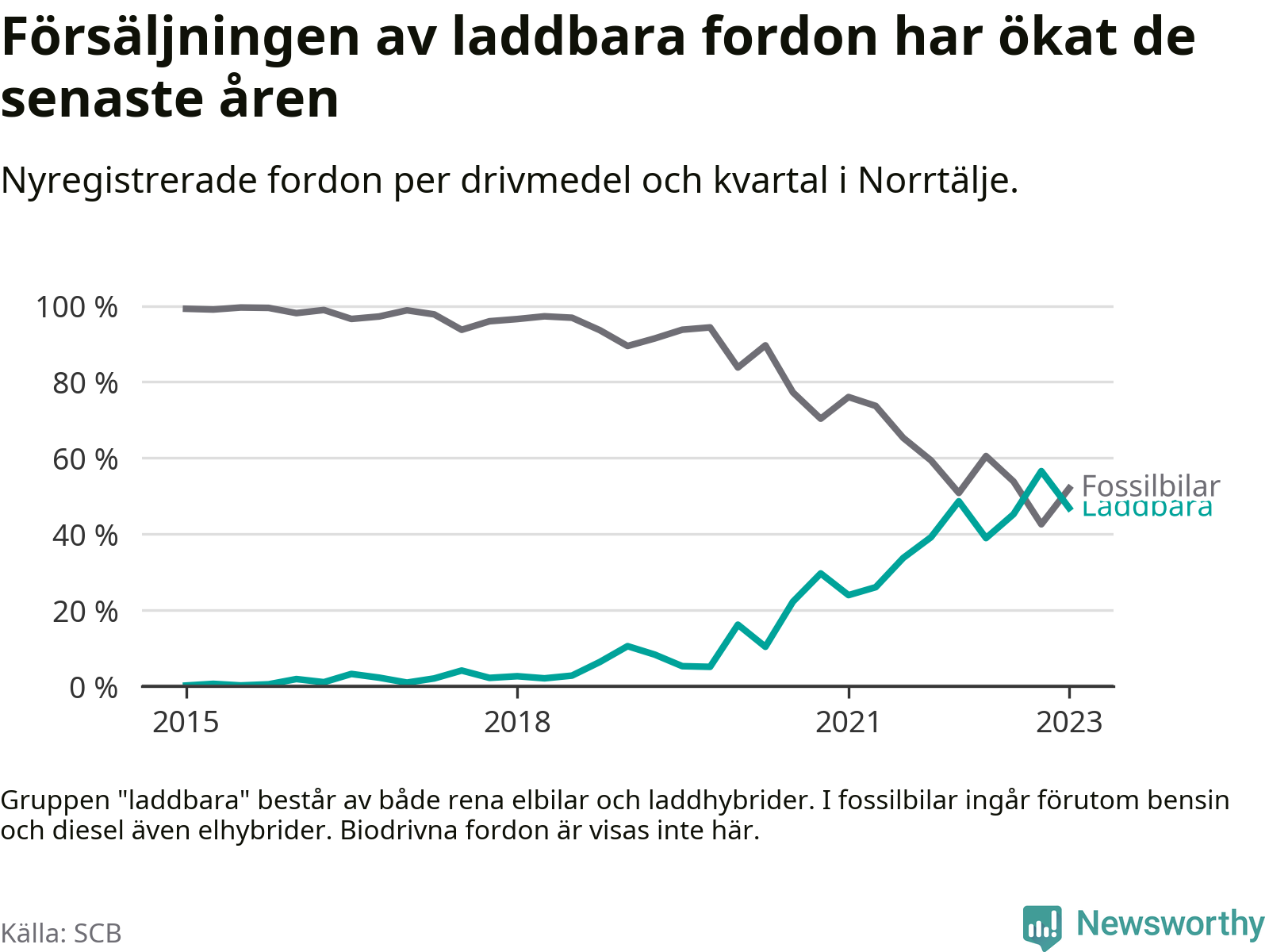 Under första kvartalet 2023 var 47 procent av alla nyregistrerade personbilar i Norrtälje laddbara (sammanlagt registrerades 271 nya bilar). Merparten av de laddbara bilarna var rena elbilar (29 procent av alla).