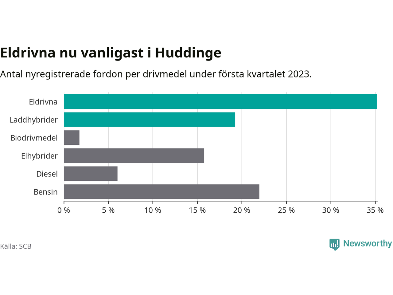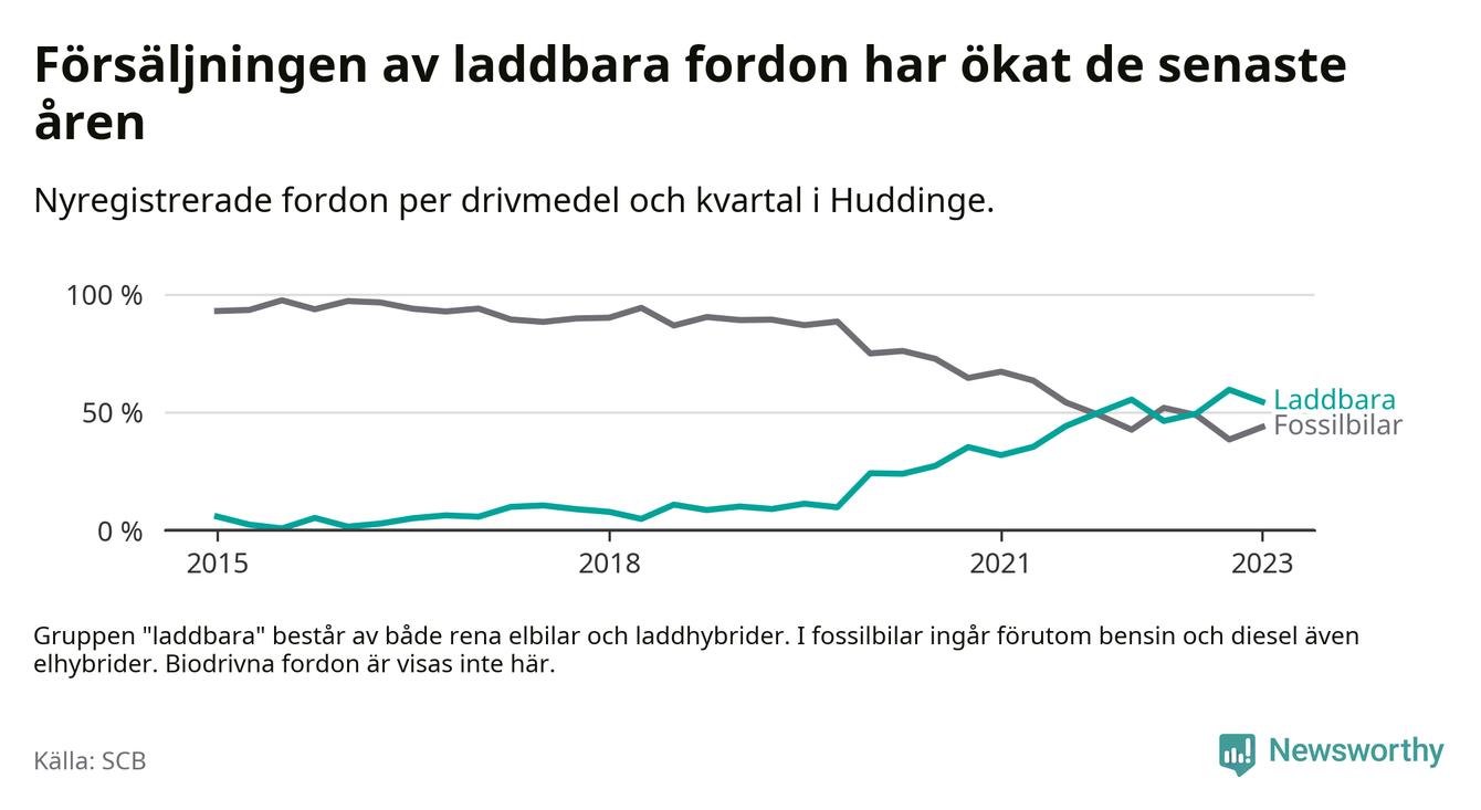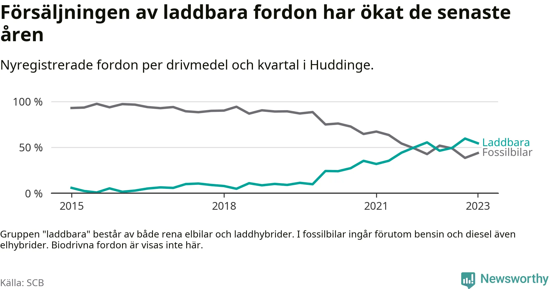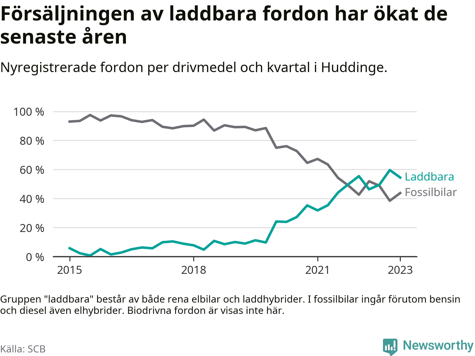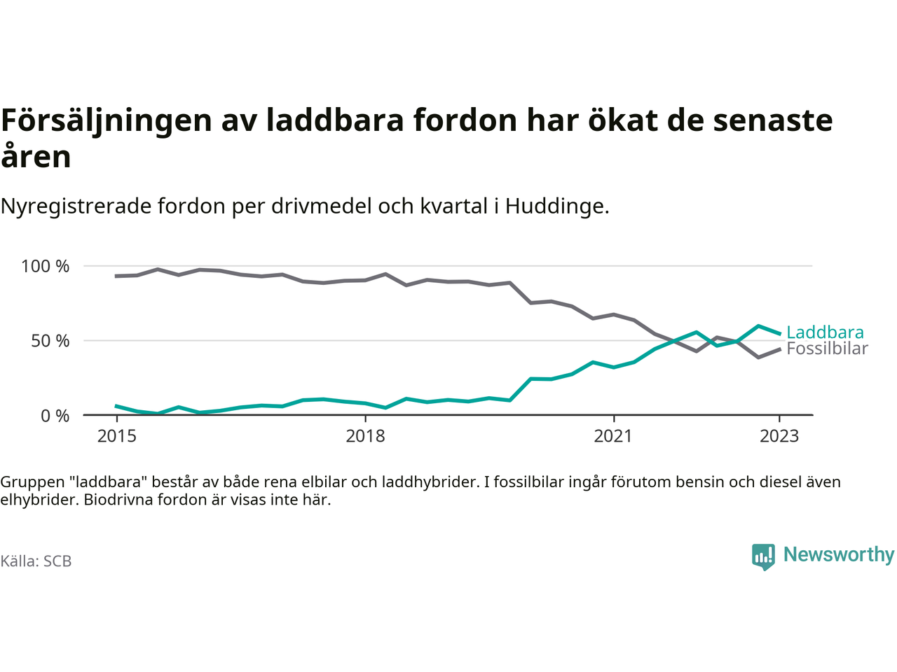 Under första kvartalet 2023 var 54 procent av alla nyregistrerade personbilar i Huddinge laddbara (sammanlagt registrerades 514 nya bilar). Merparten av de laddbara bilarna var rena elbilar (35 procent av alla).