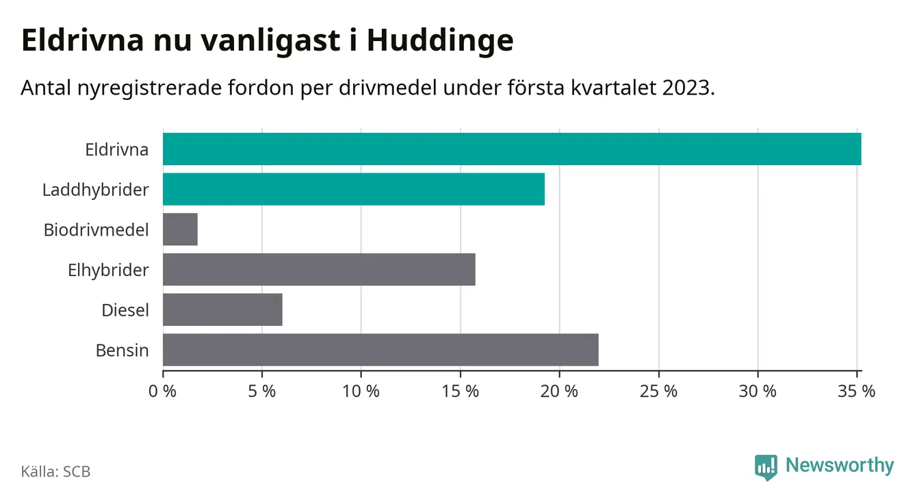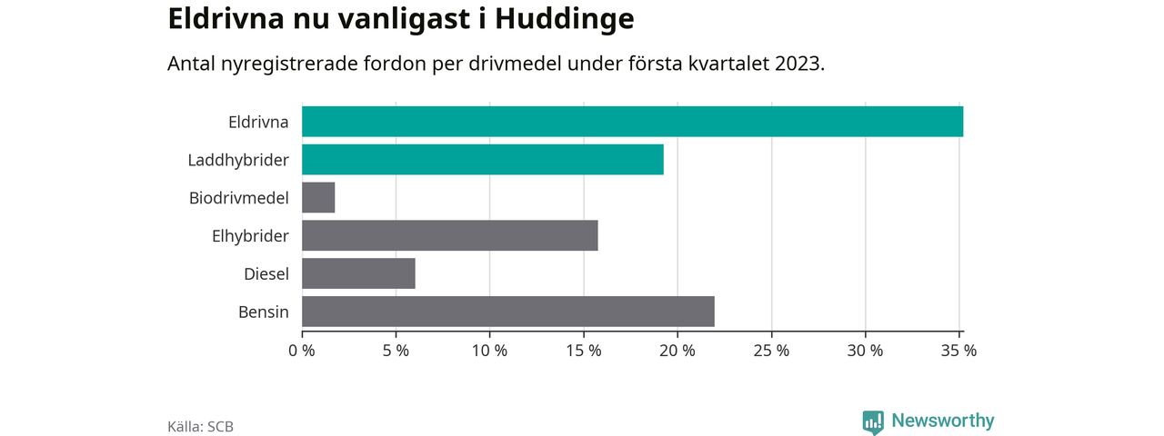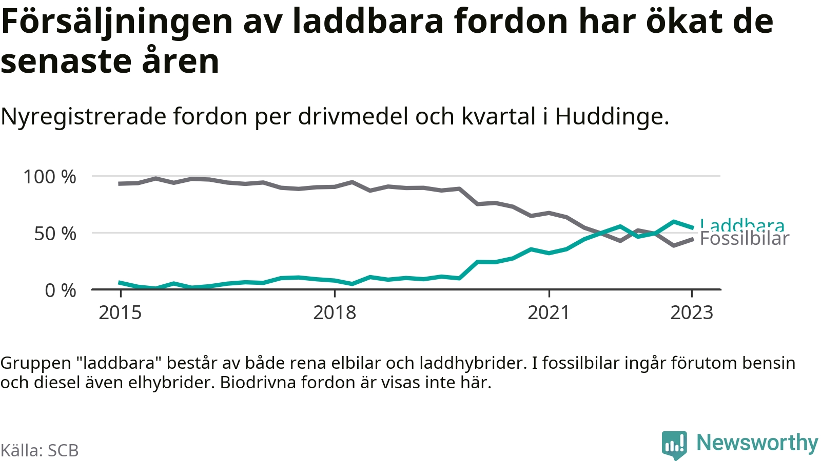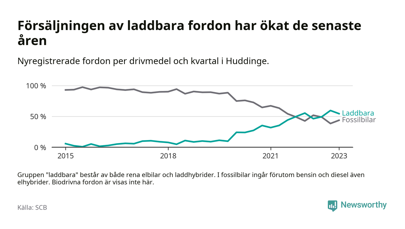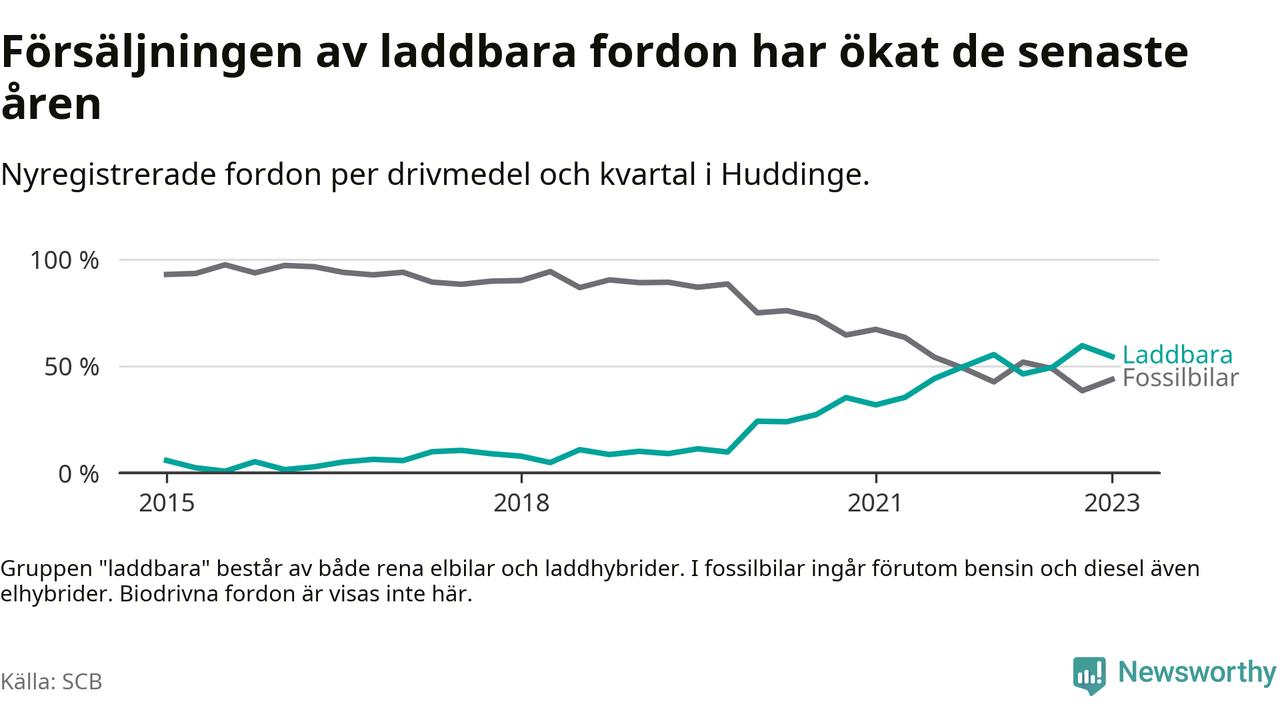 Under första kvartalet 2023 var 54 procent av alla nyregistrerade personbilar i Huddinge laddbara (sammanlagt registrerades 514 nya bilar). Merparten av de laddbara bilarna var rena elbilar (35 procent av alla).