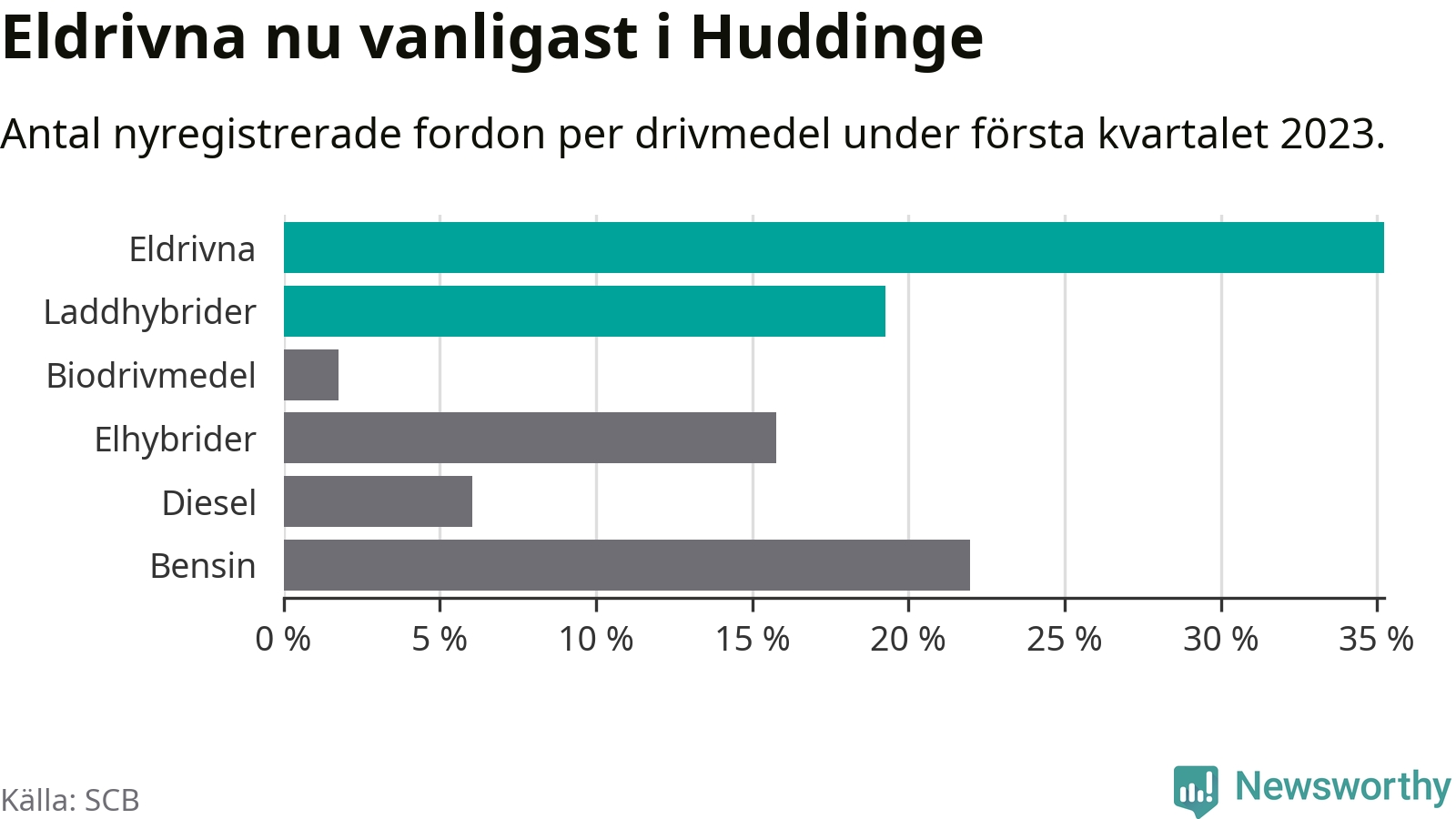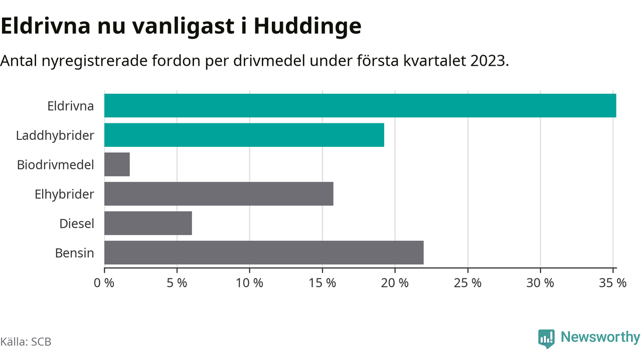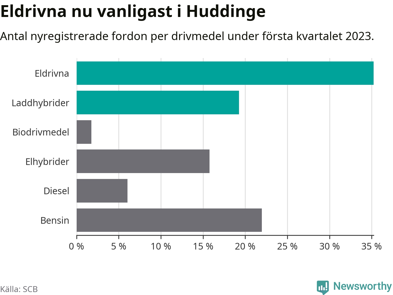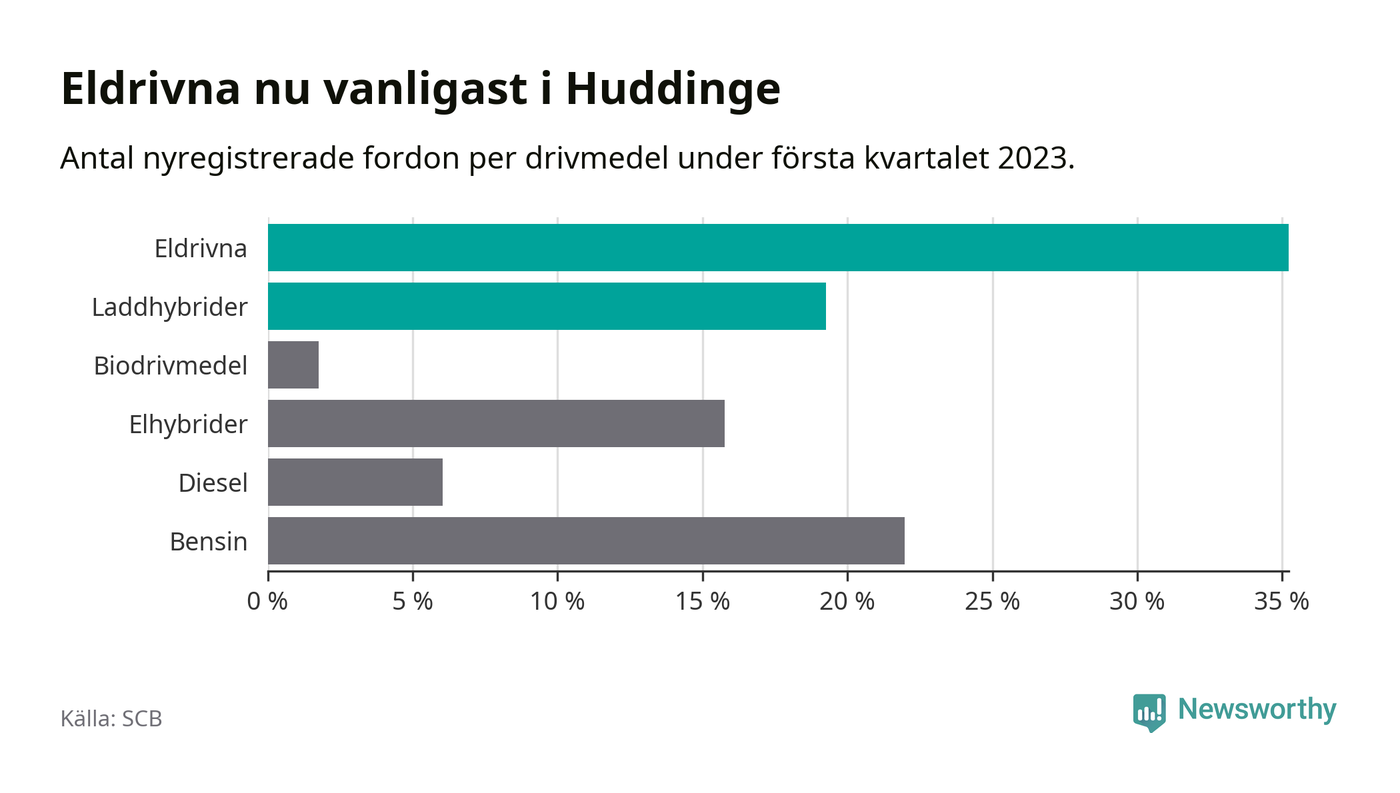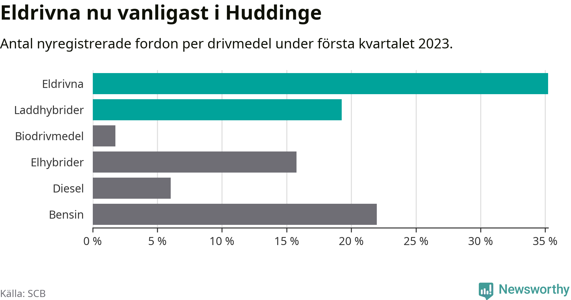 Under första kvartalet 2023 var 54 procent av alla nyregistrerade personbilar i Huddinge laddbara (sammanlagt registrerades 514 nya bilar). Merparten av de laddbara bilarna var rena elbilar (35 procent av alla).