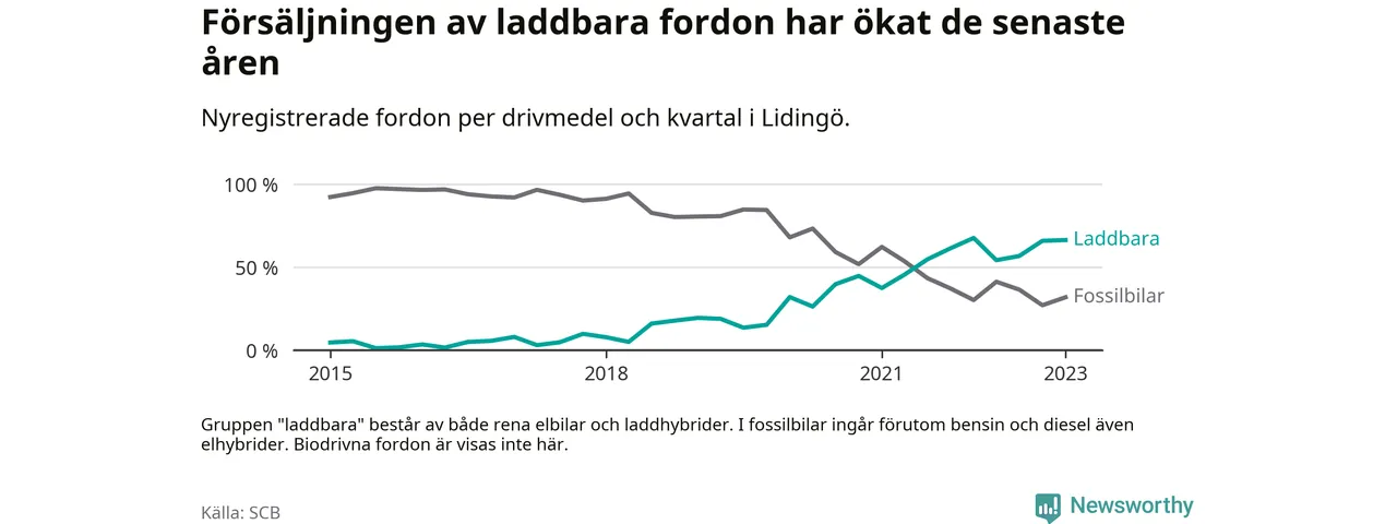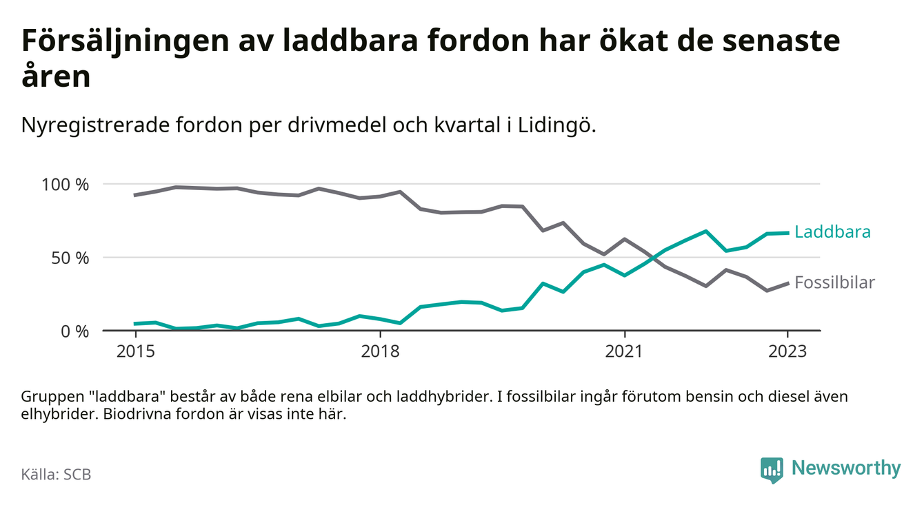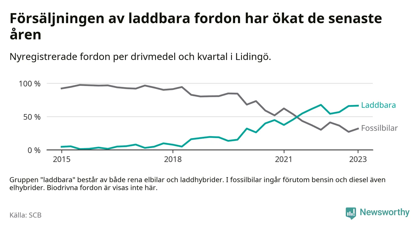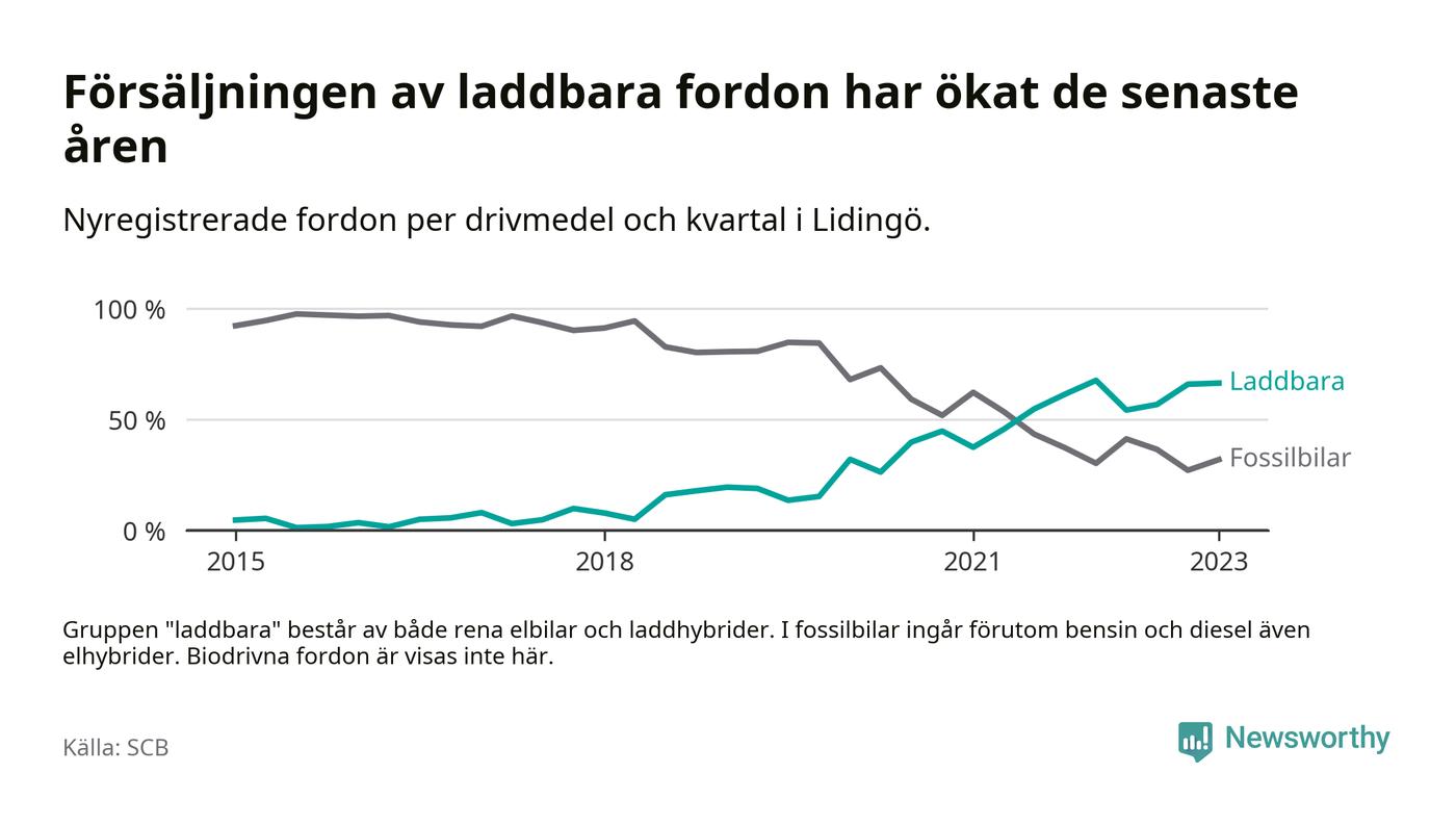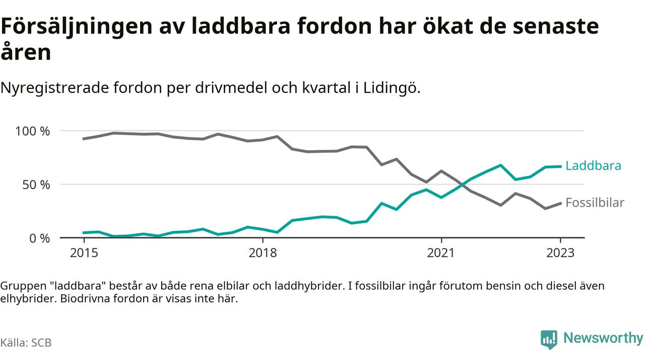 Under första kvartalet 2023 var 66 procent av alla nyregistrerade personbilar i Lidingö laddbara (sammanlagt registrerades 232 nya bilar). Merparten av de laddbara bilarna var rena elbilar (47 procent av alla).