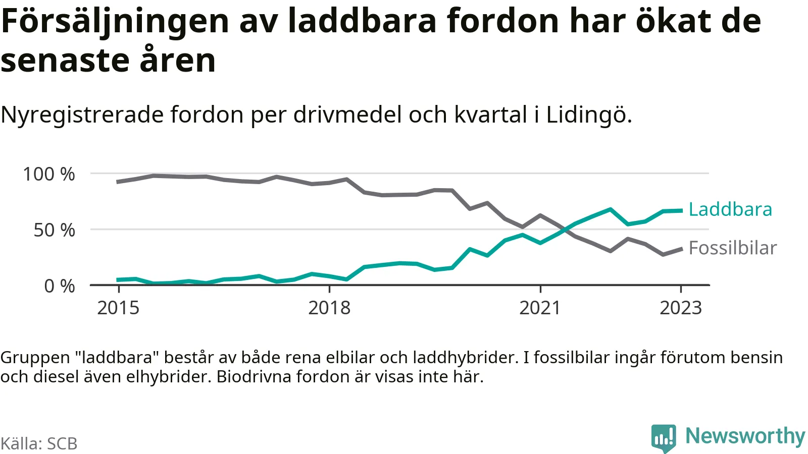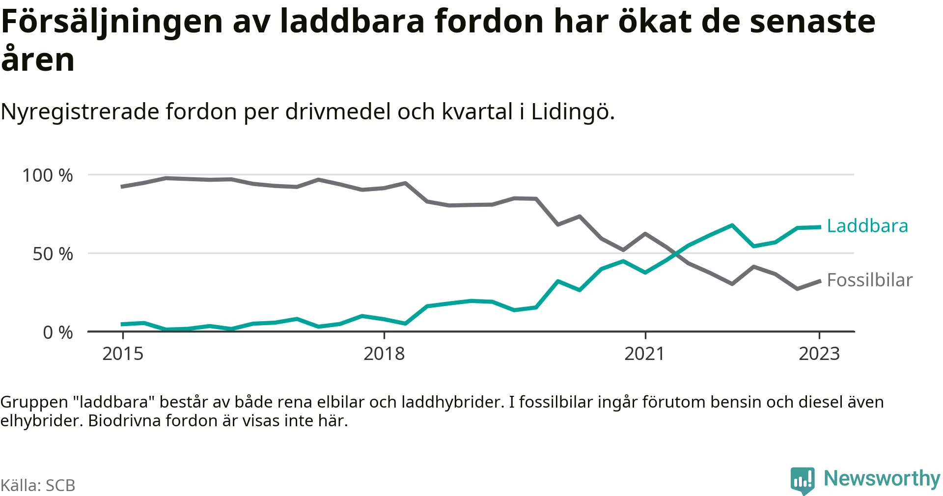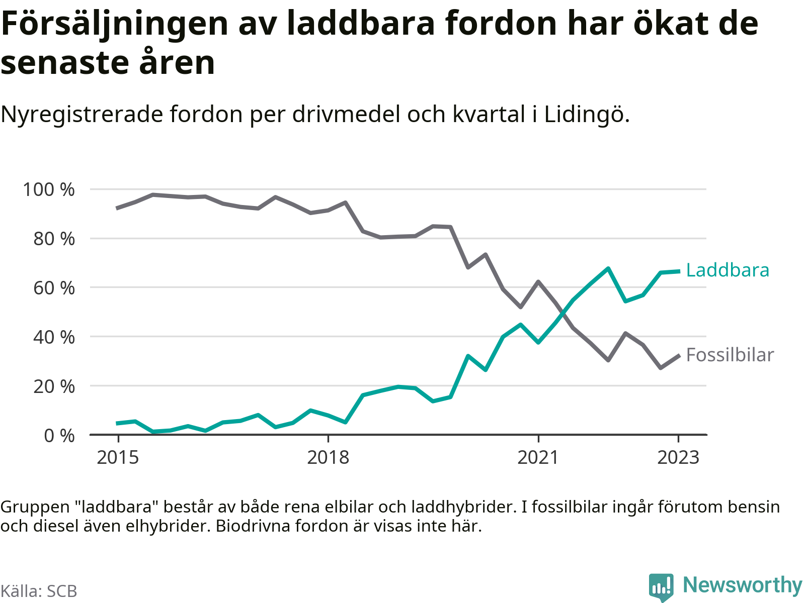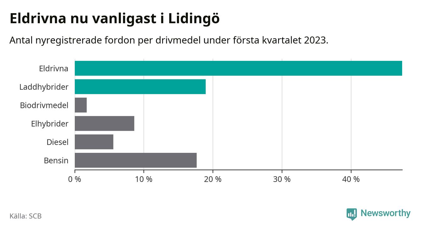 Under första kvartalet 2023 var 66 procent av alla nyregistrerade personbilar i Lidingö laddbara (sammanlagt registrerades 232 nya bilar). Merparten av de laddbara bilarna var rena elbilar (47 procent av alla).