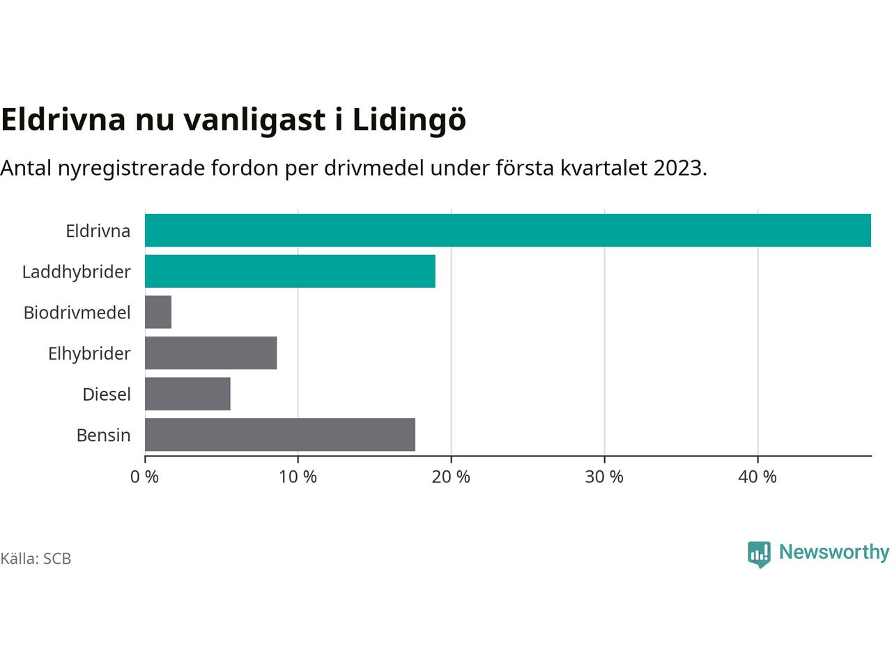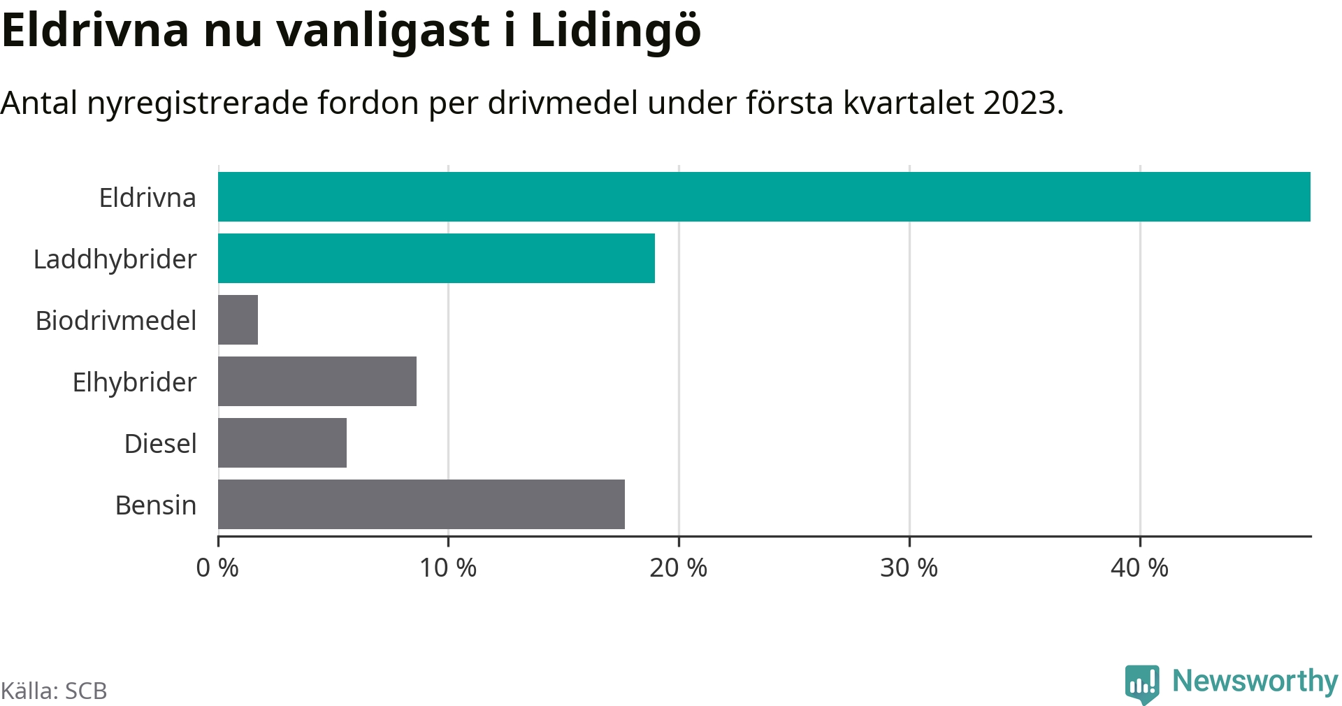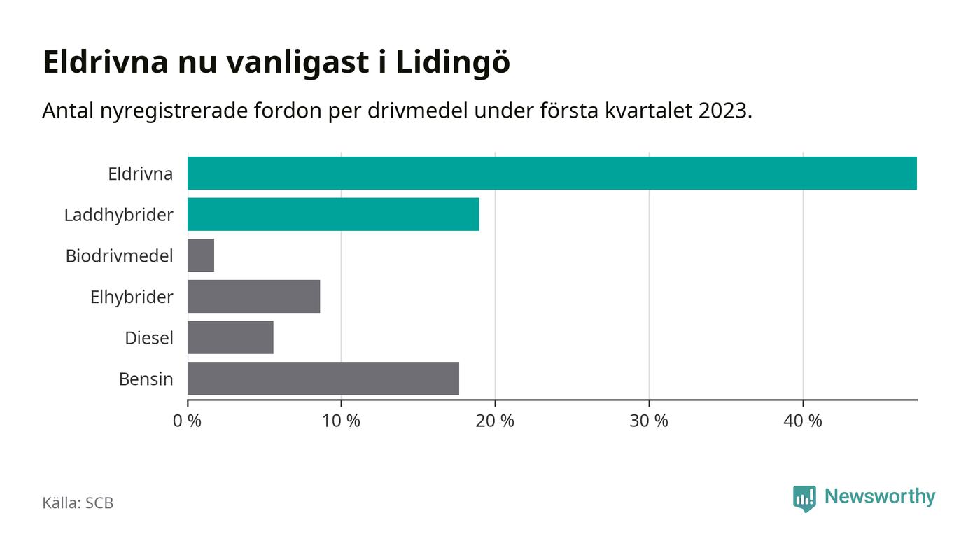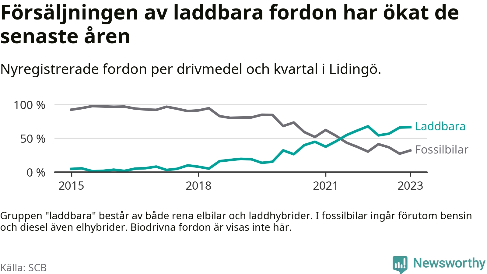 Under första kvartalet 2023 var 66 procent av alla nyregistrerade personbilar i Lidingö laddbara (sammanlagt registrerades 232 nya bilar). Merparten av de laddbara bilarna var rena elbilar (47 procent av alla).