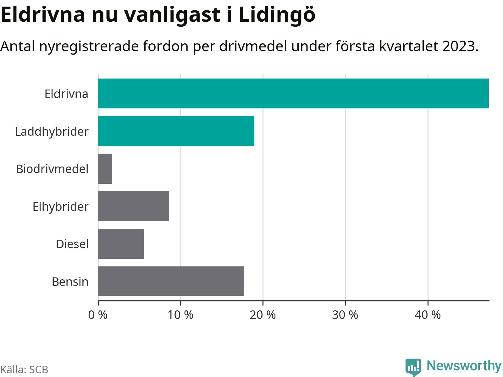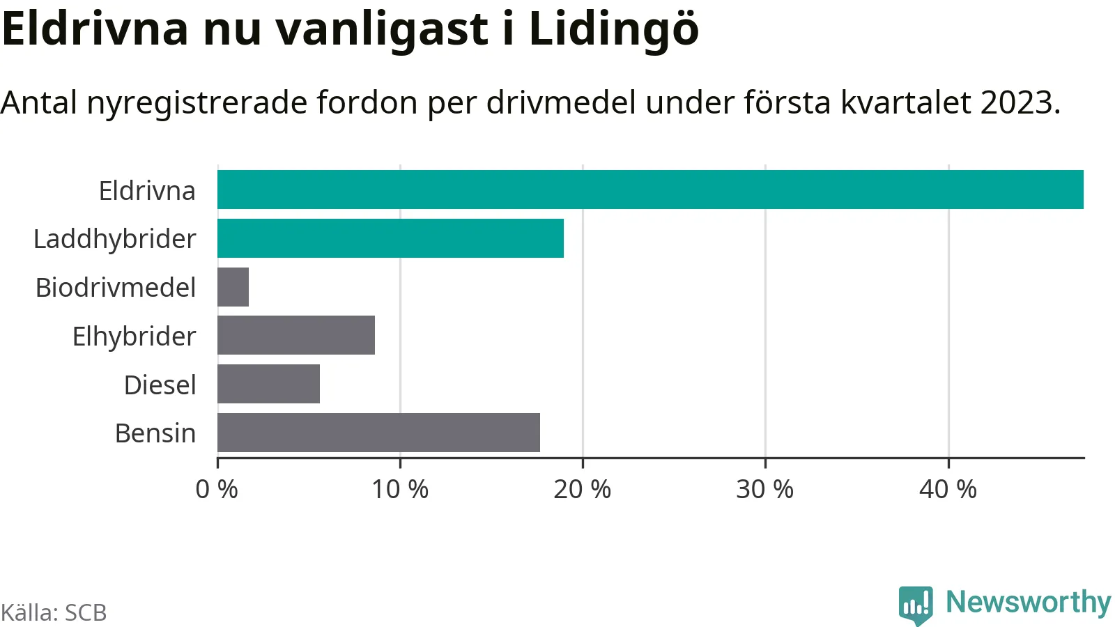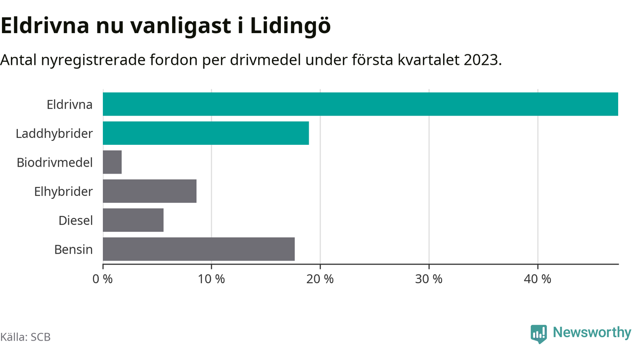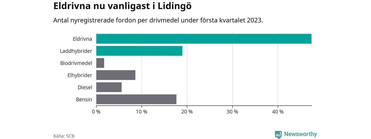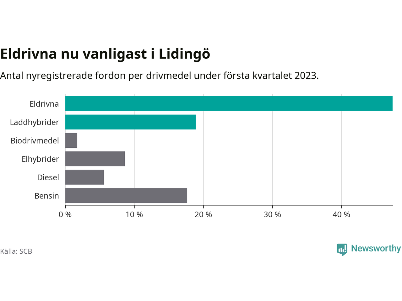 Under första kvartalet 2023 var 66 procent av alla nyregistrerade personbilar i Lidingö laddbara (sammanlagt registrerades 232 nya bilar). Merparten av de laddbara bilarna var rena elbilar (47 procent av alla).