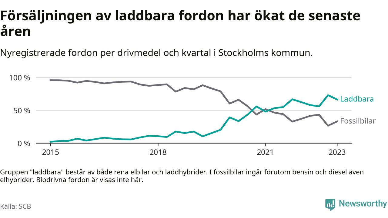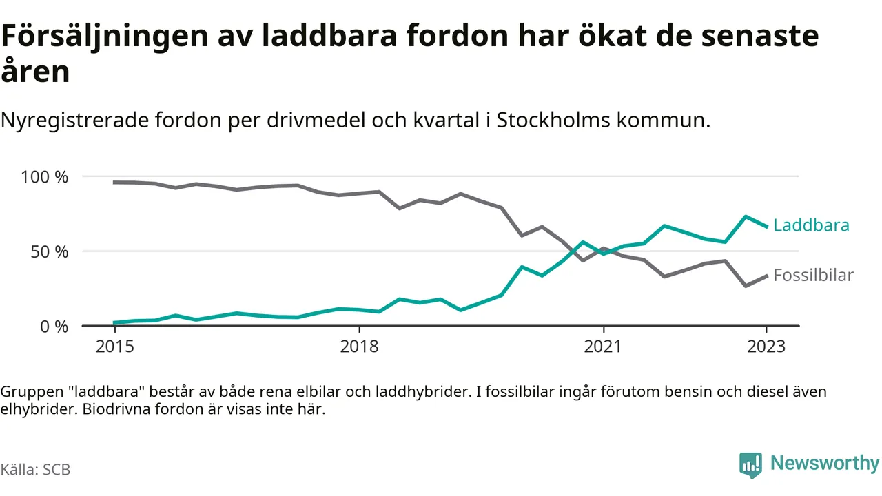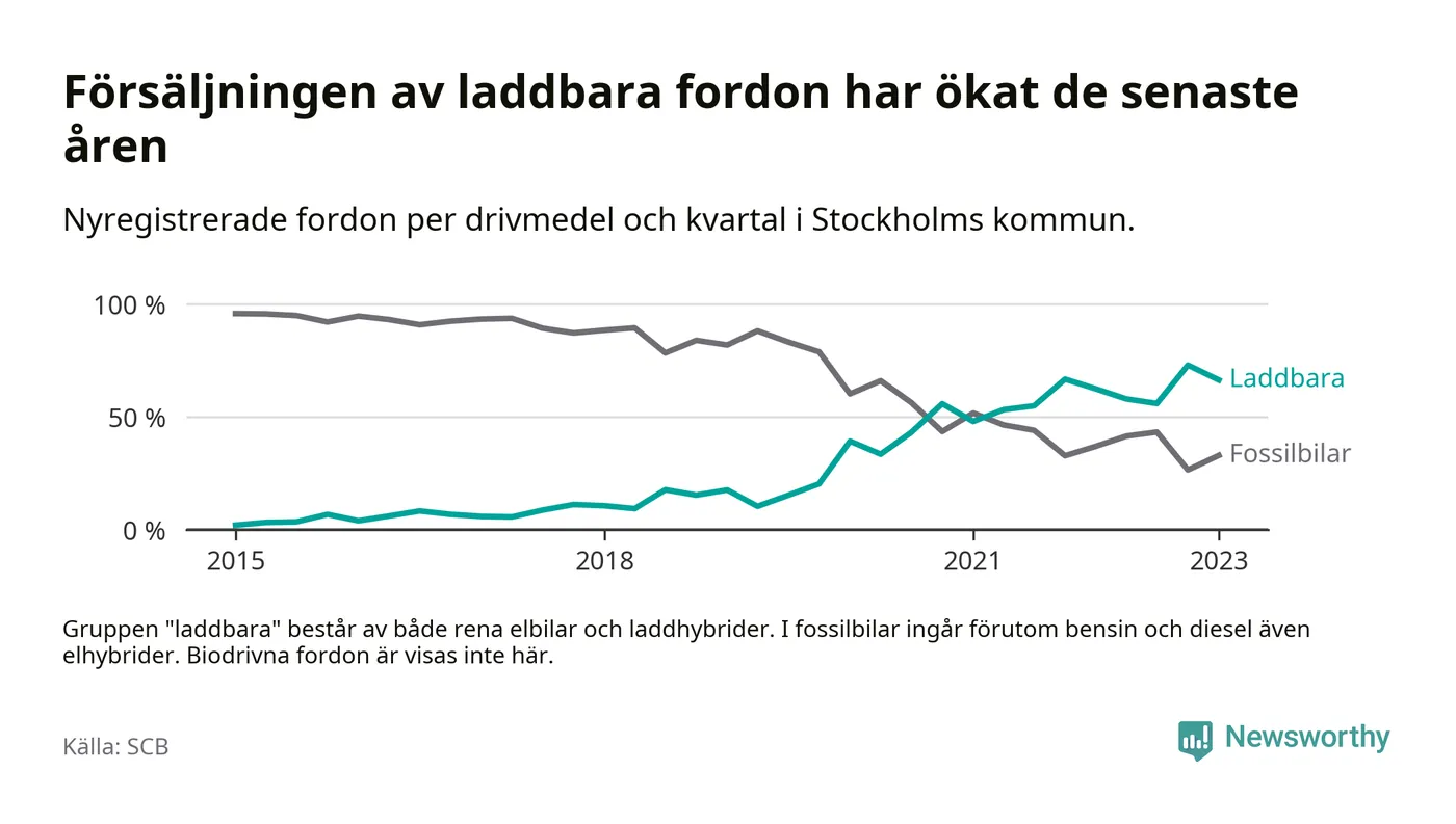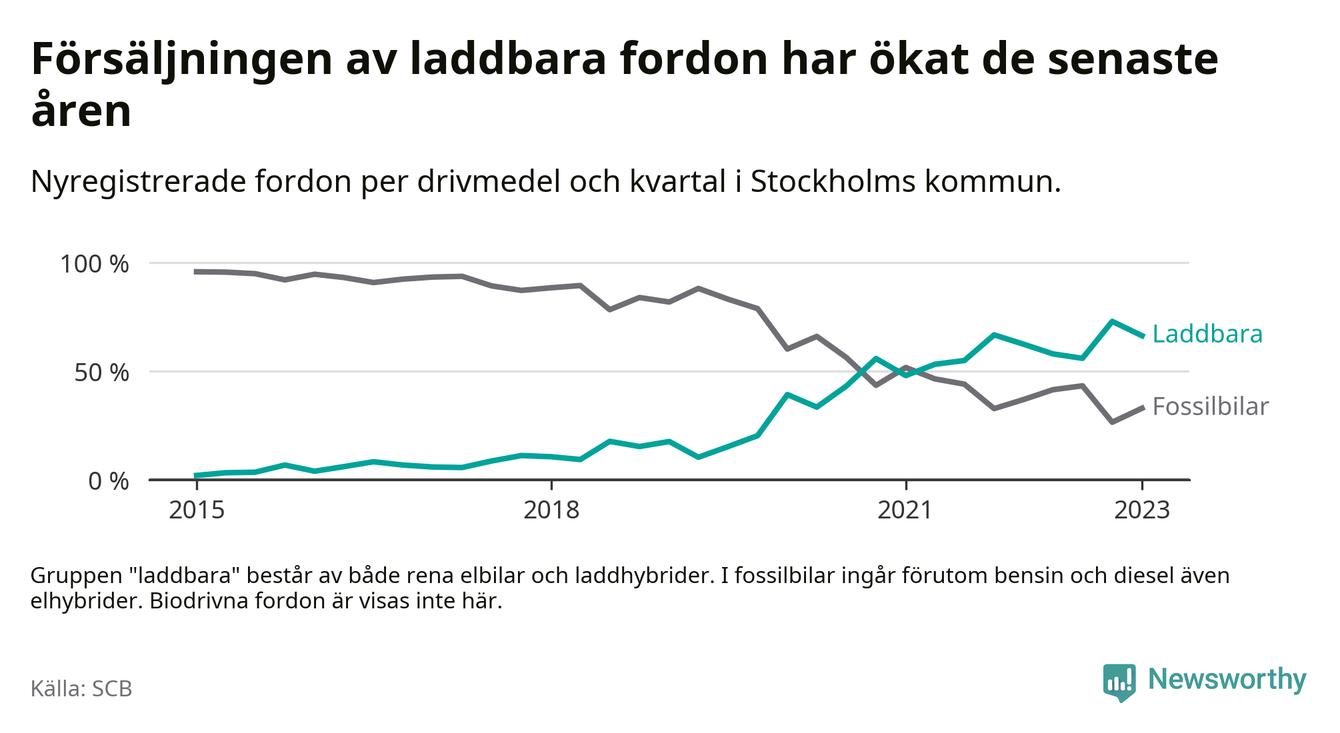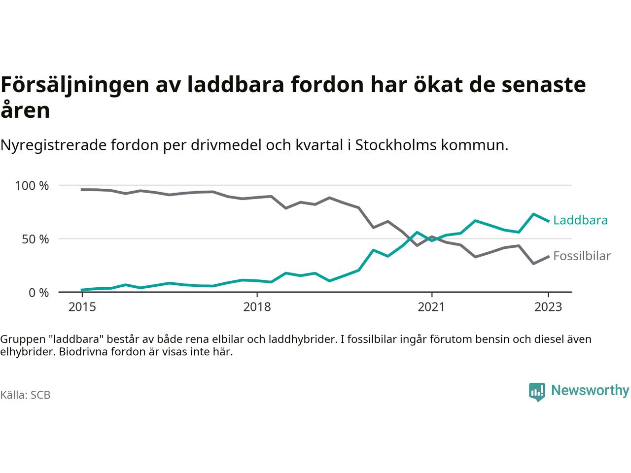 Under första kvartalet 2023 var 66 procent av alla nyregistrerade personbilar i Stockholms kommun laddbara (sammanlagt registrerades 12 134 nya bilar). Merparten av de laddbara bilarna var rena elbilar (40 procent av alla).