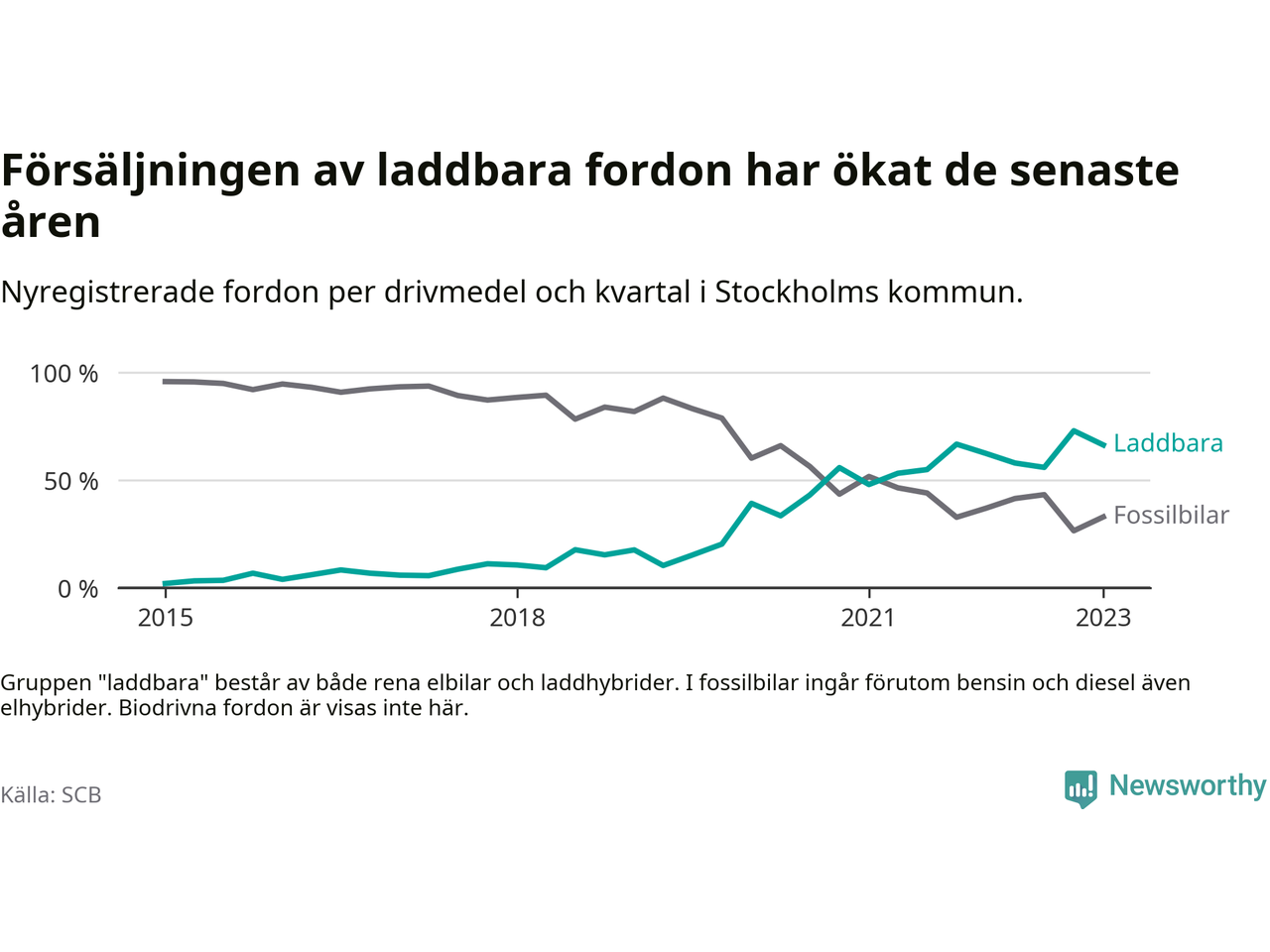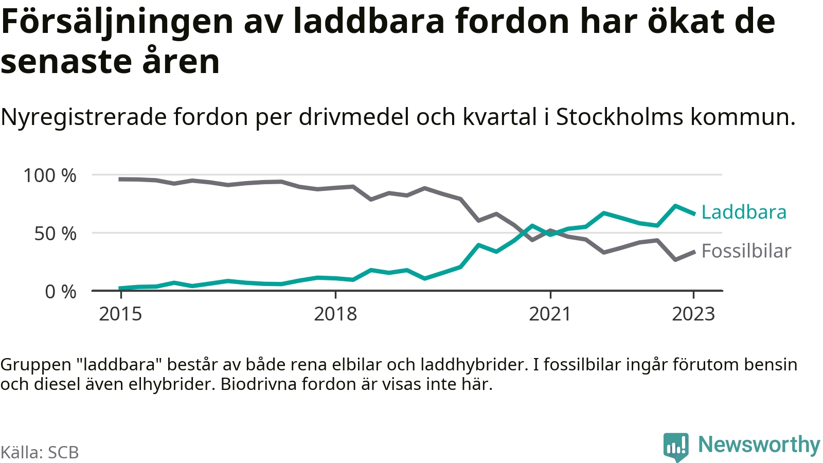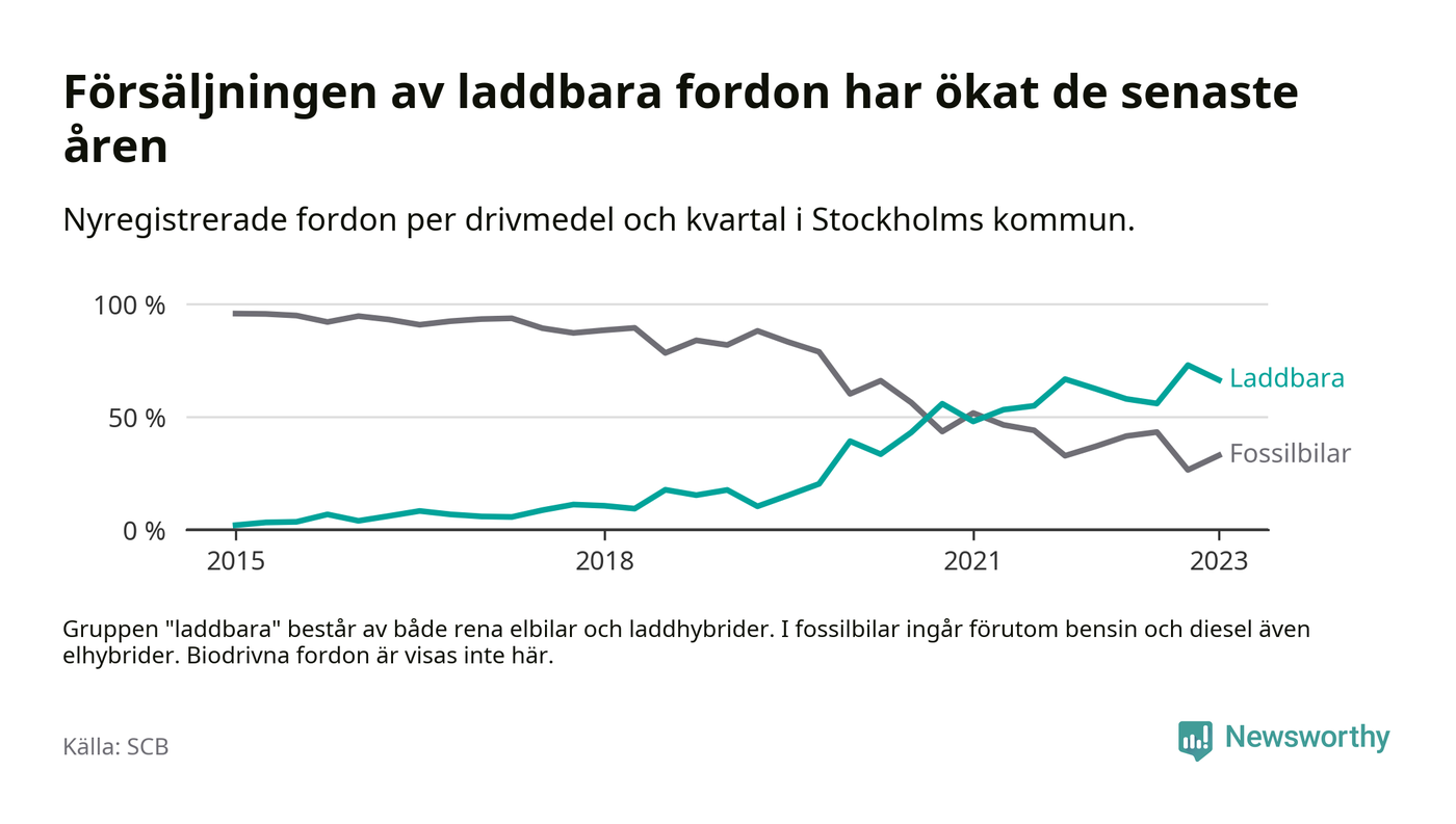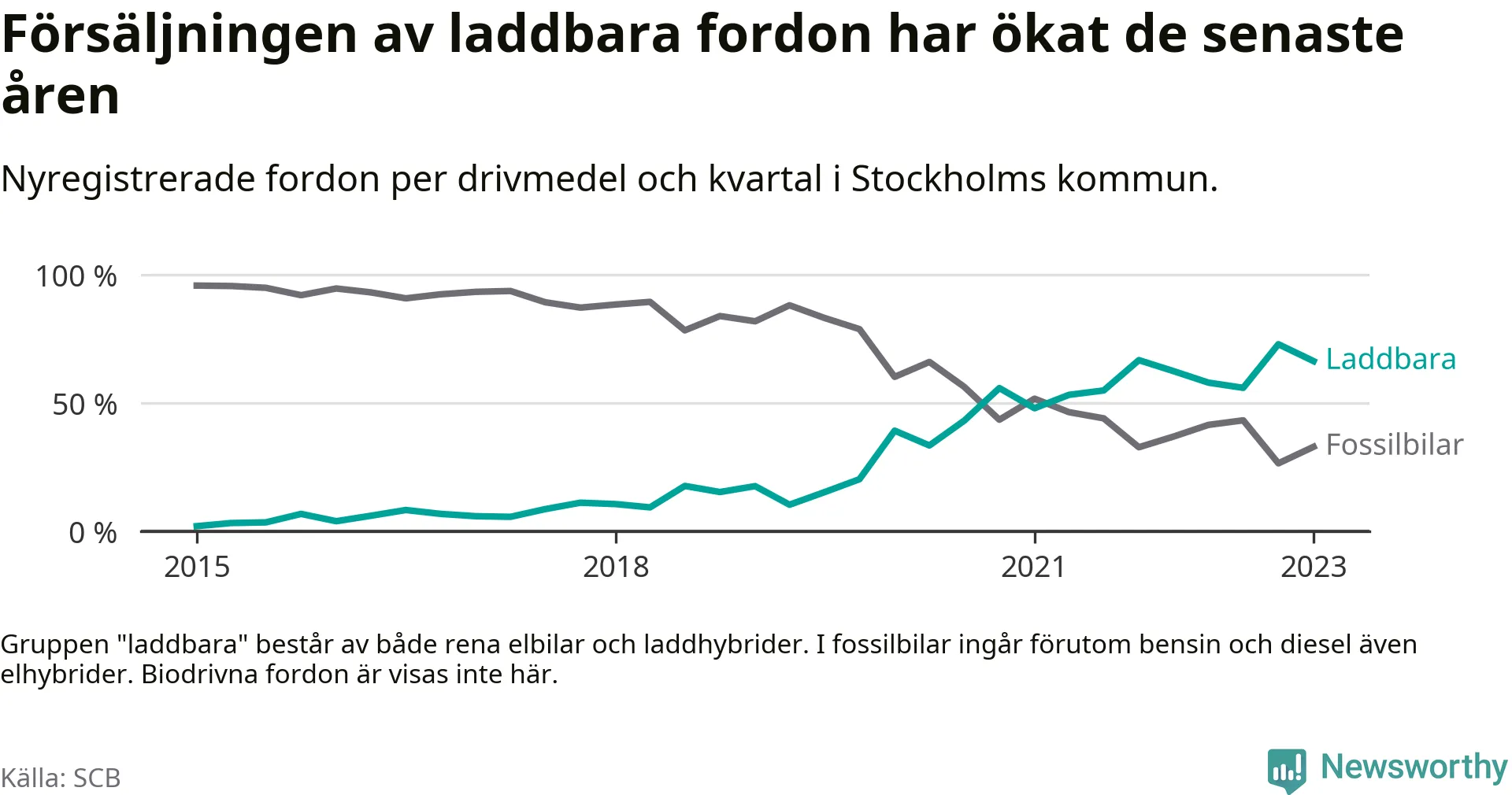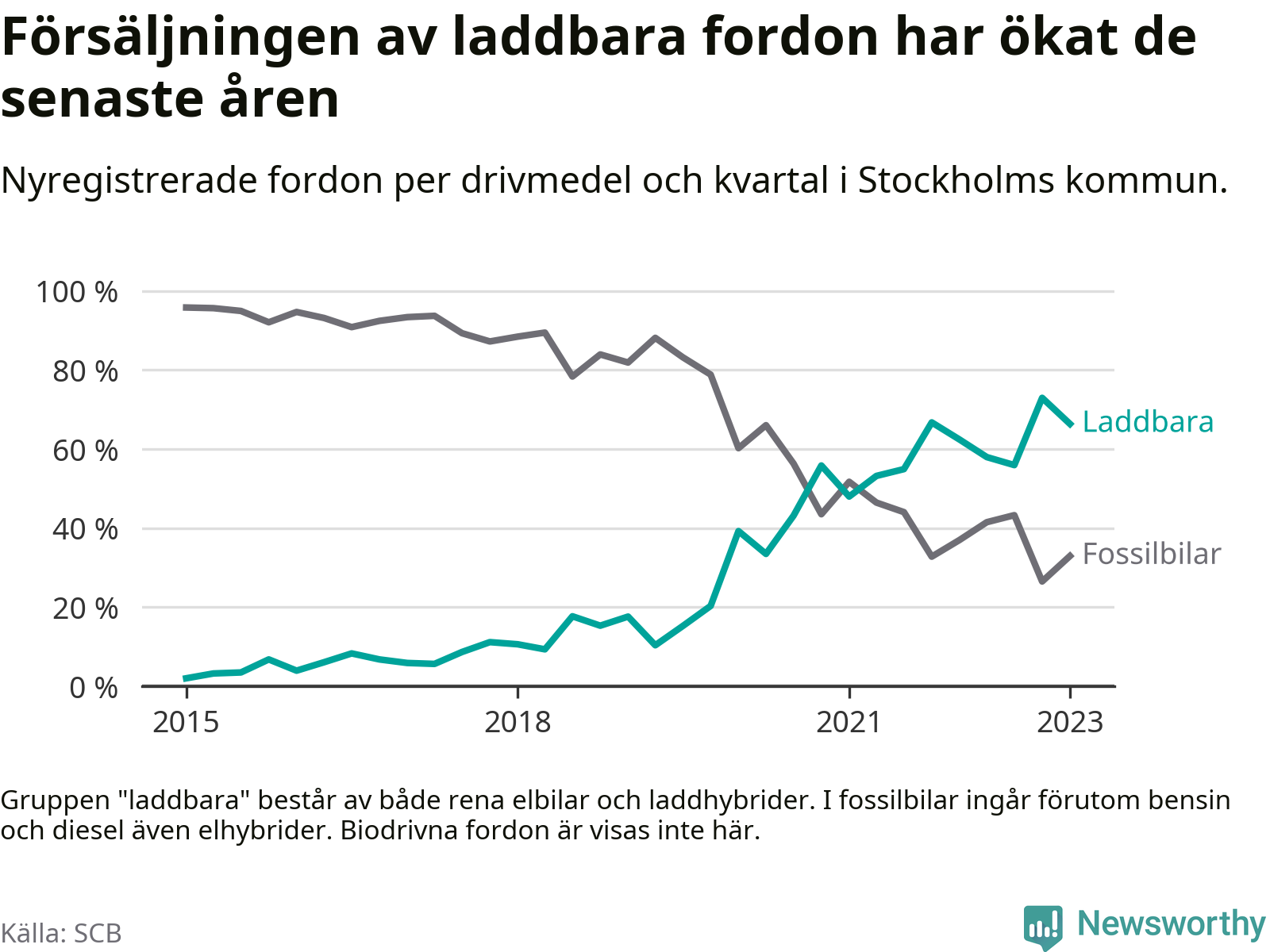 Under första kvartalet 2023 var 66 procent av alla nyregistrerade personbilar i Stockholms kommun laddbara (sammanlagt registrerades 12 134 nya bilar). Merparten av de laddbara bilarna var rena elbilar (40 procent av alla).