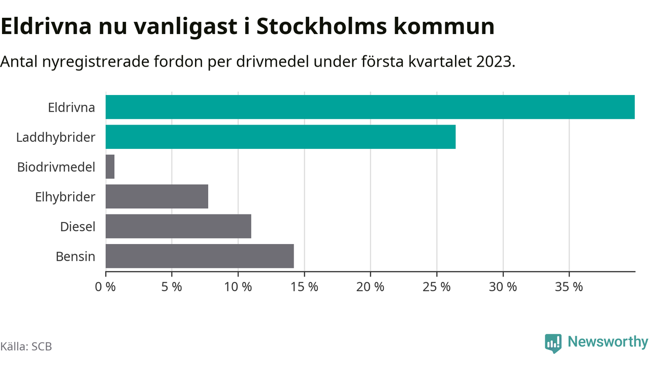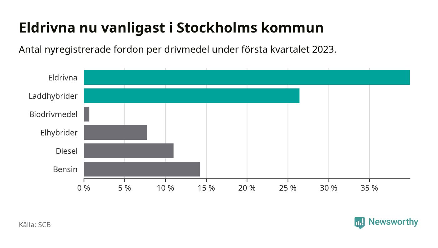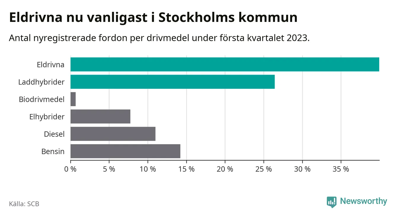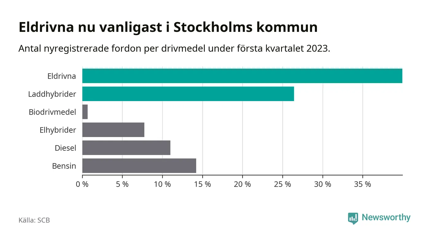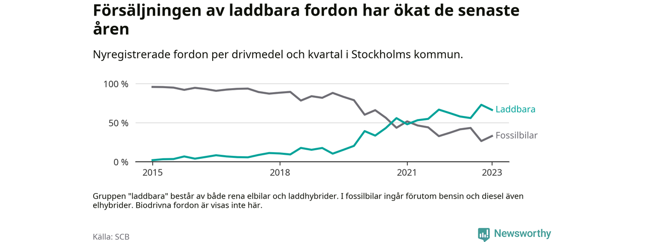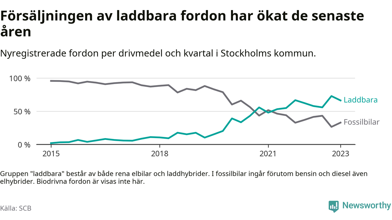 Under första kvartalet 2023 var 66 procent av alla nyregistrerade personbilar i Stockholms kommun laddbara (sammanlagt registrerades 12 134 nya bilar). Merparten av de laddbara bilarna var rena elbilar (40 procent av alla).
