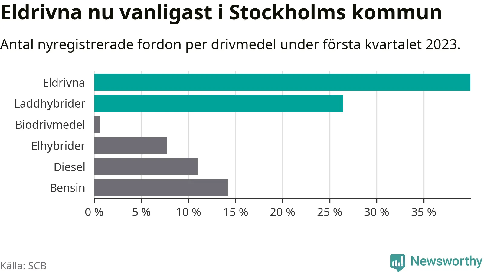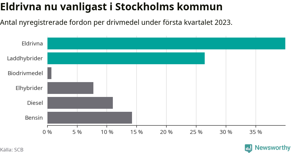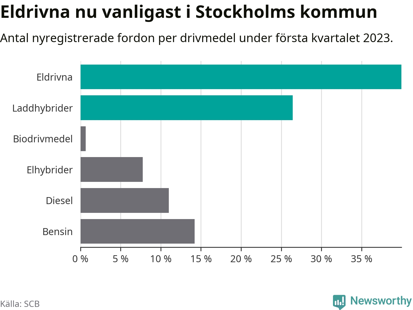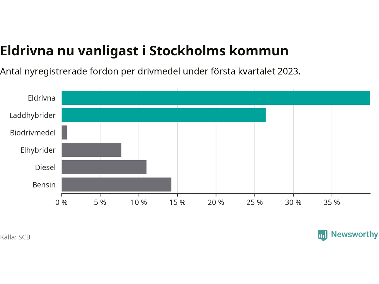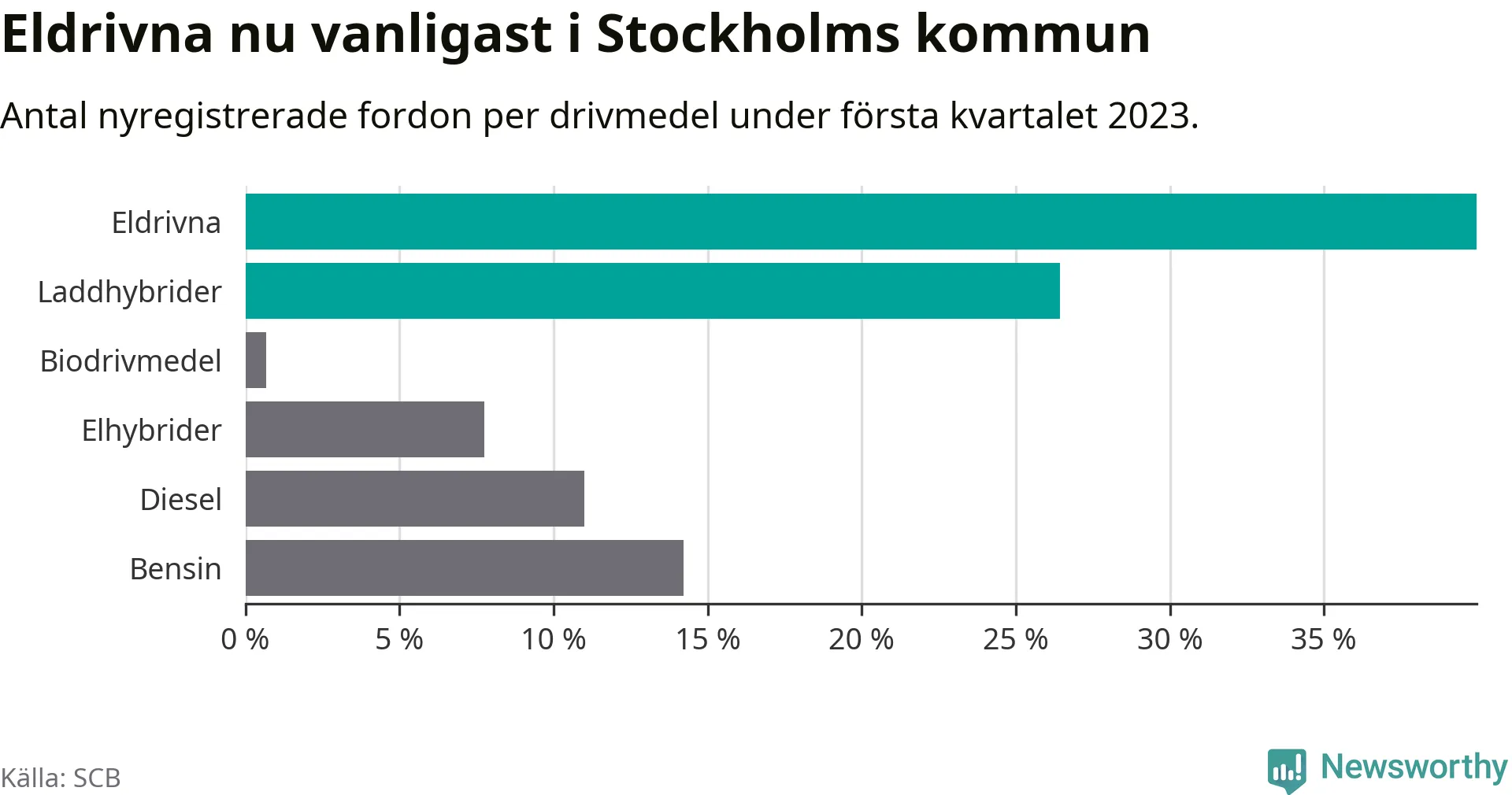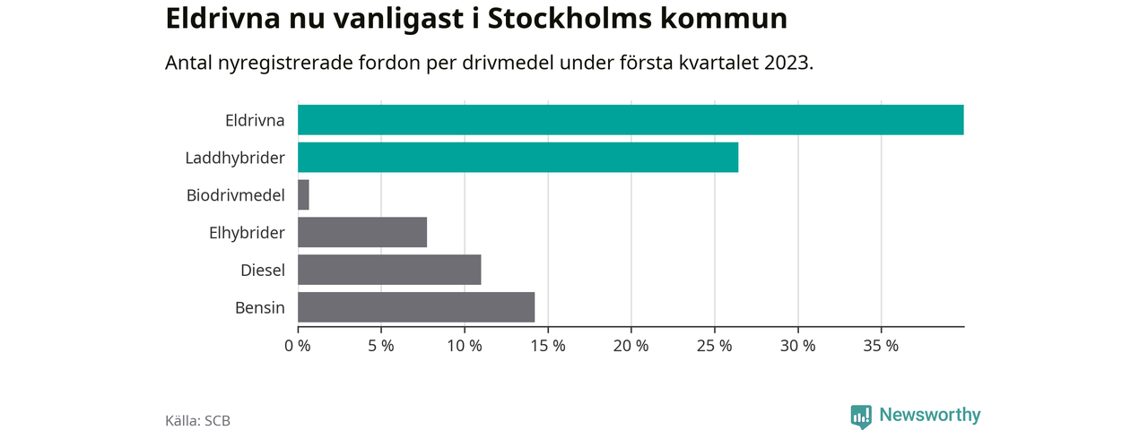 Under första kvartalet 2023 var 66 procent av alla nyregistrerade personbilar i Stockholms kommun laddbara (sammanlagt registrerades 12 134 nya bilar). Merparten av de laddbara bilarna var rena elbilar (40 procent av alla).