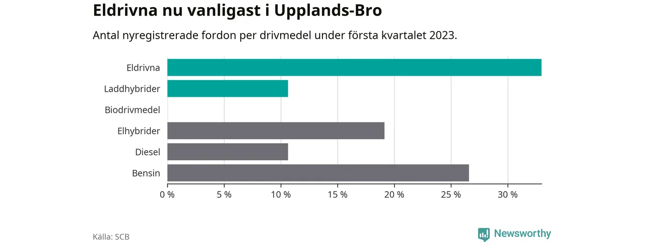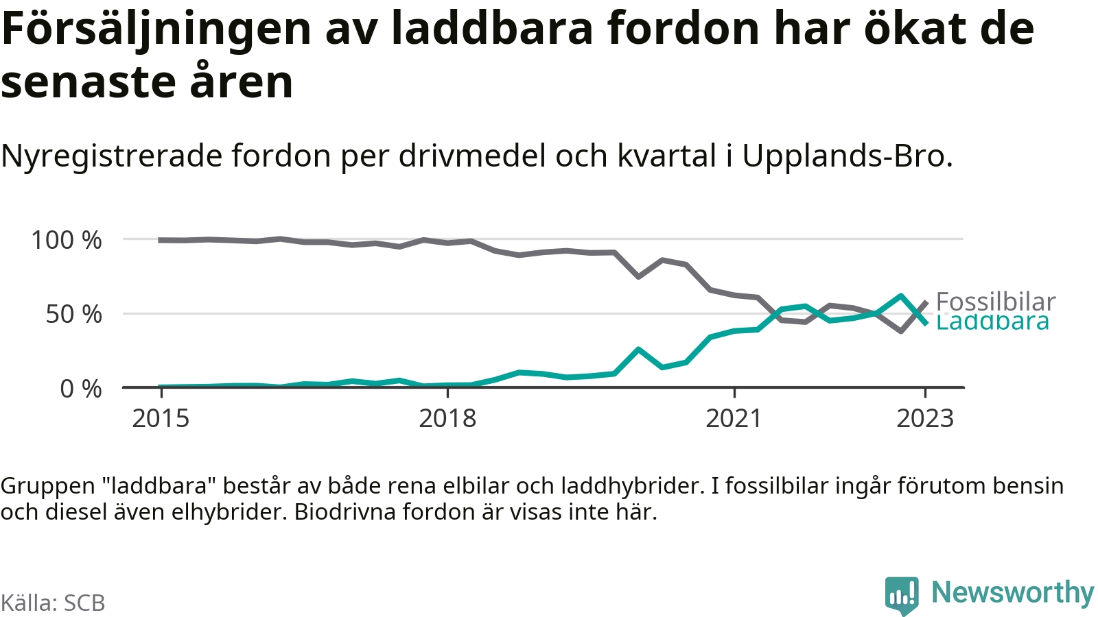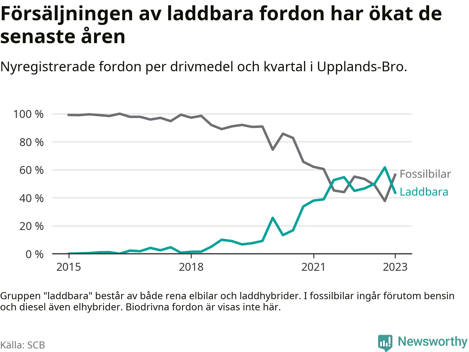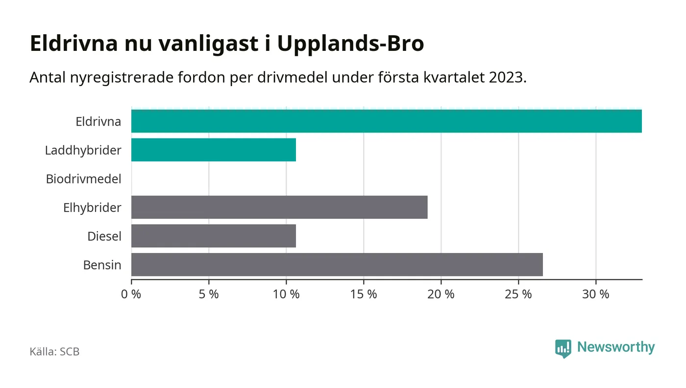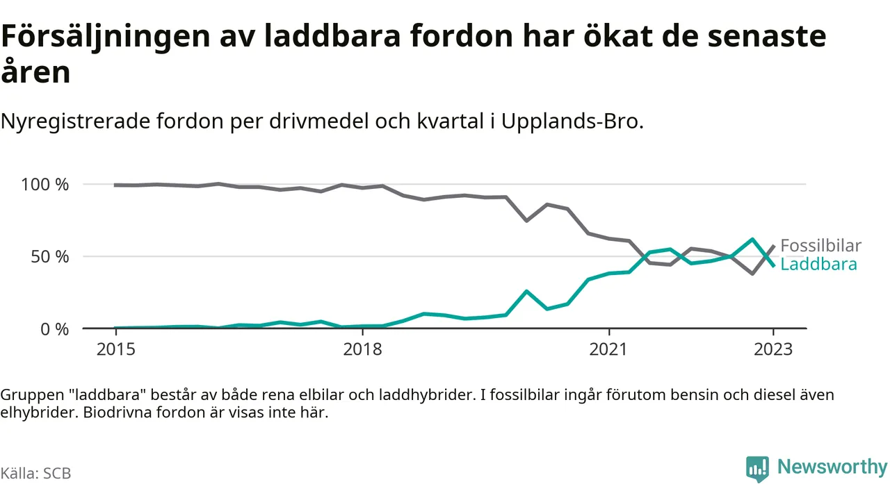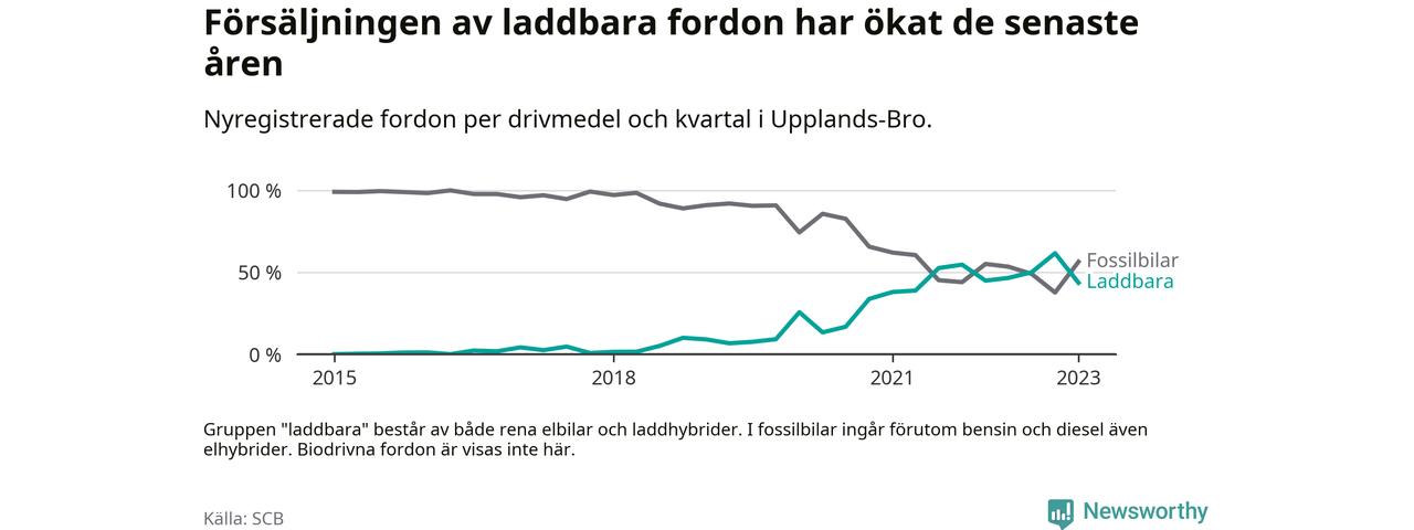 Under första kvartalet 2023 var 44 procent av alla nyregistrerade personbilar i Upplands-Bro laddbara (sammanlagt registrerades 94 nya bilar). Merparten av de laddbara bilarna var rena elbilar (33 procent av alla).
