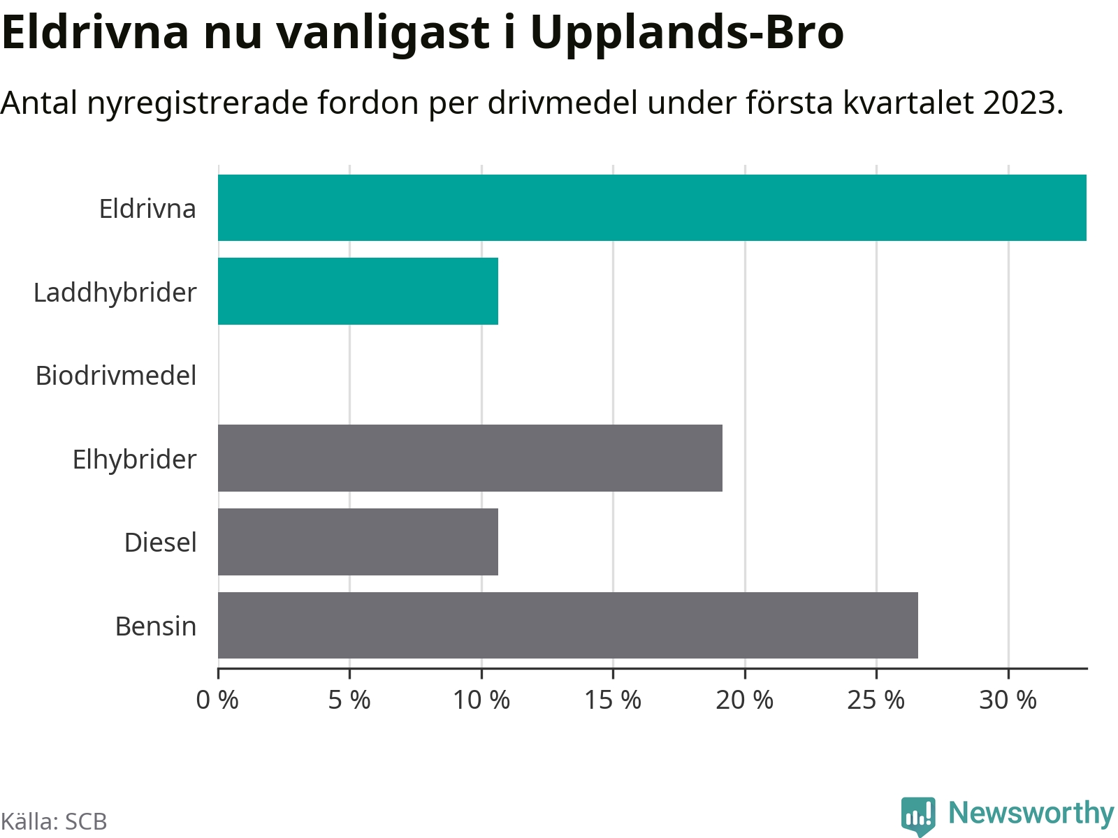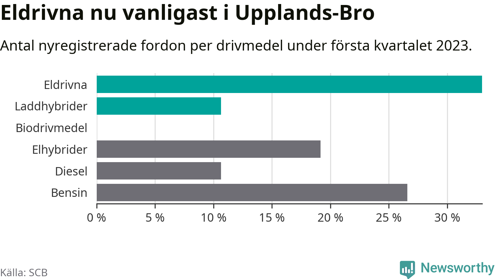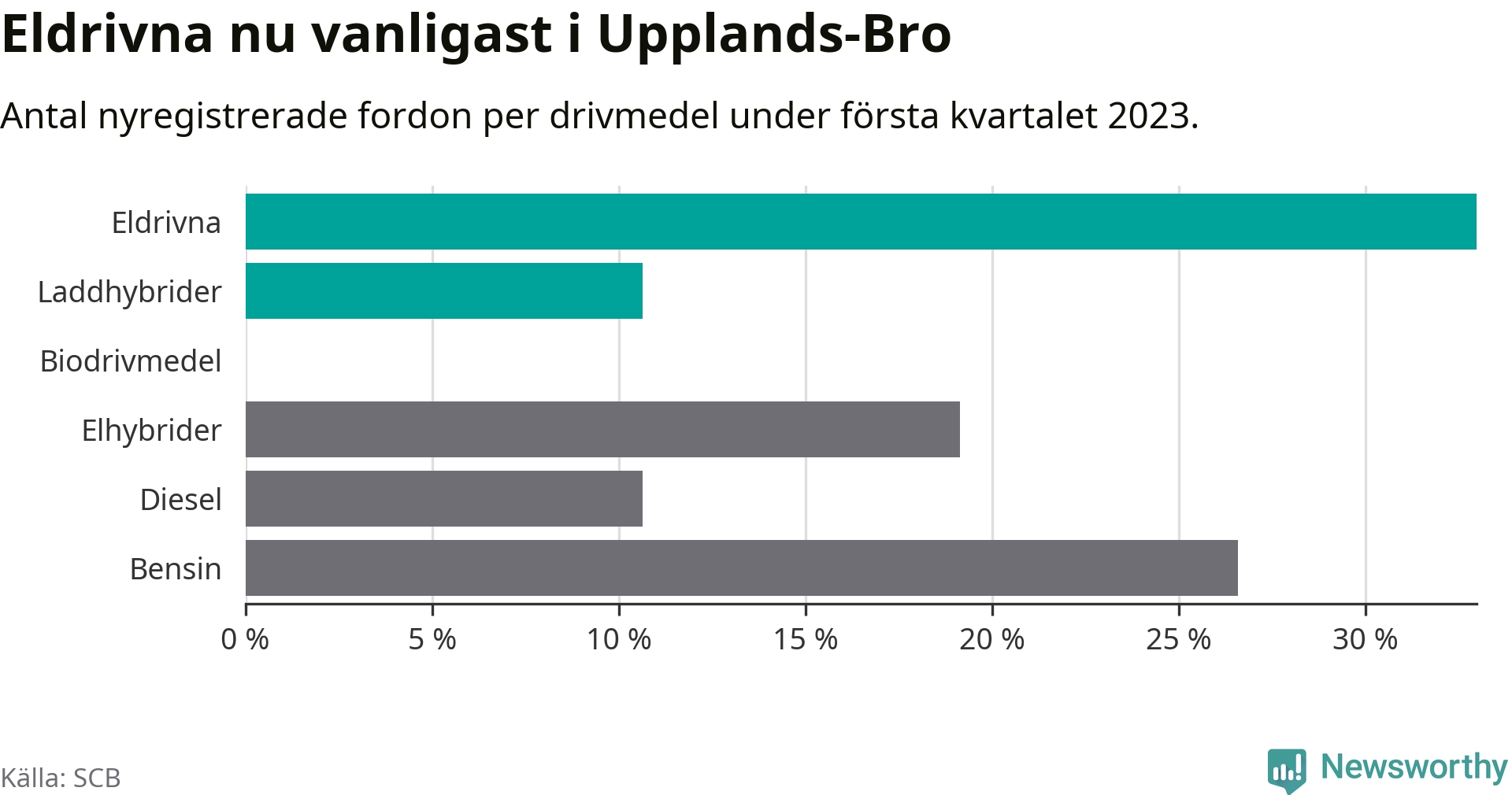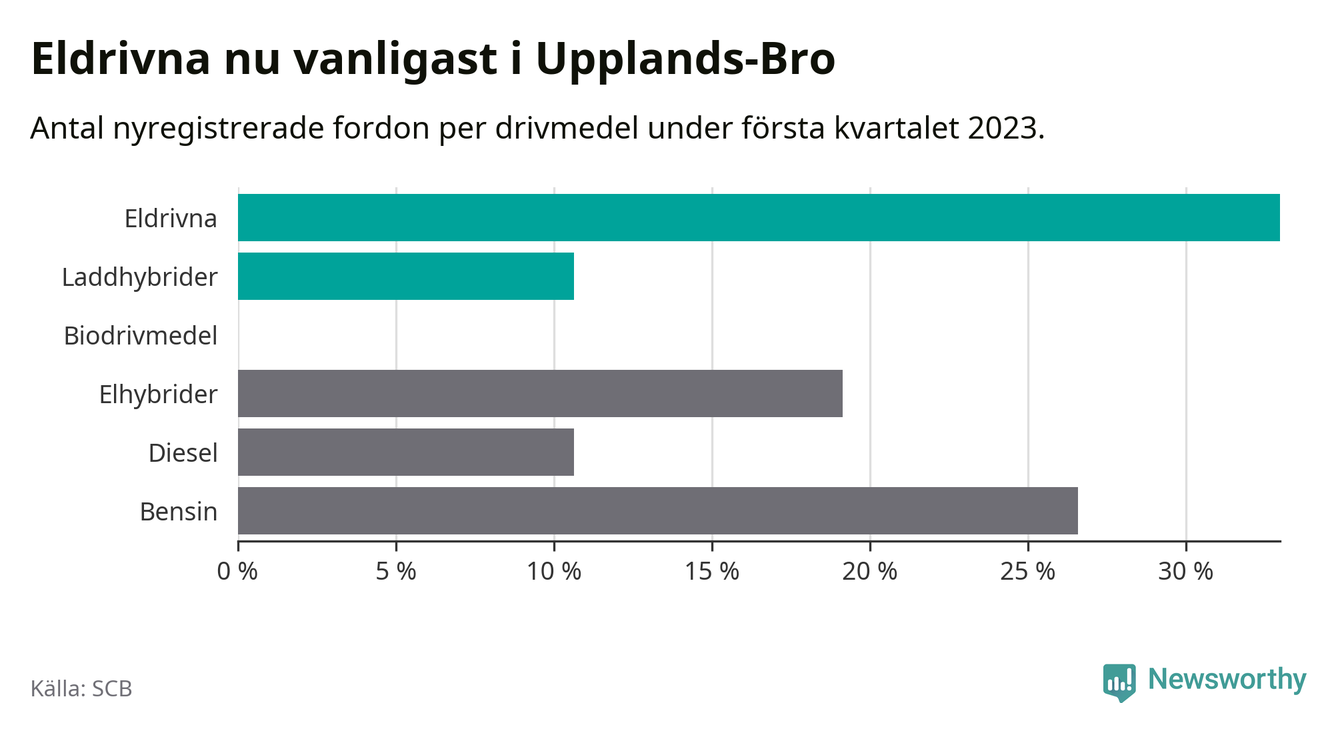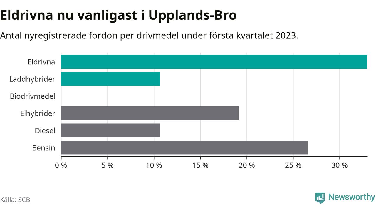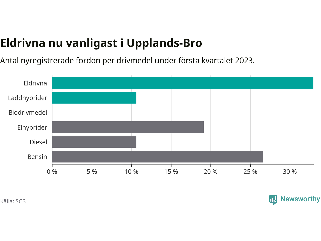 Under första kvartalet 2023 var 44 procent av alla nyregistrerade personbilar i Upplands-Bro laddbara (sammanlagt registrerades 94 nya bilar). Merparten av de laddbara bilarna var rena elbilar (33 procent av alla).