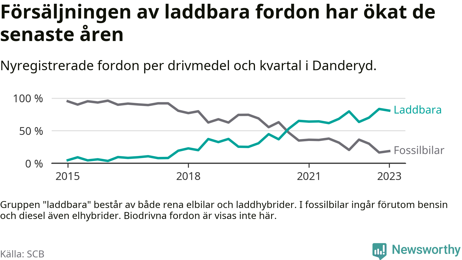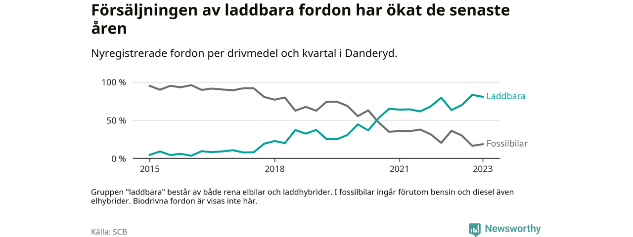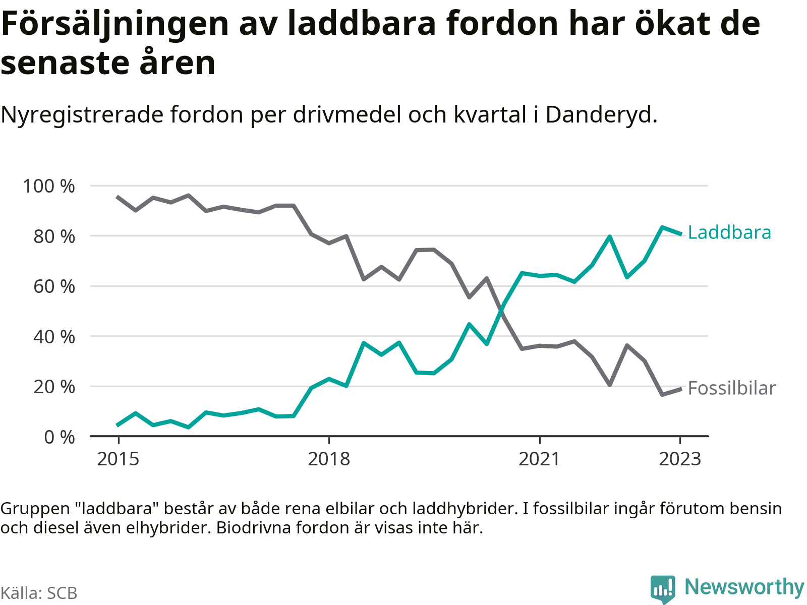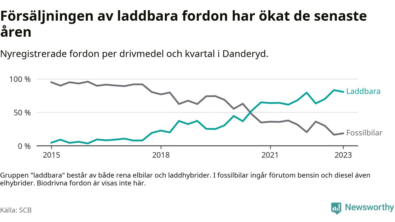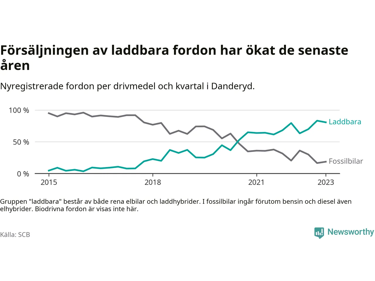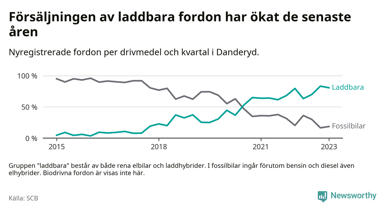 Under första kvartalet 2023 var 81 procent av alla nyregistrerade personbilar i Danderyd laddbara (sammanlagt registrerades 473 nya bilar). Merparten av de laddbara bilarna var rena elbilar (52 procent av alla).