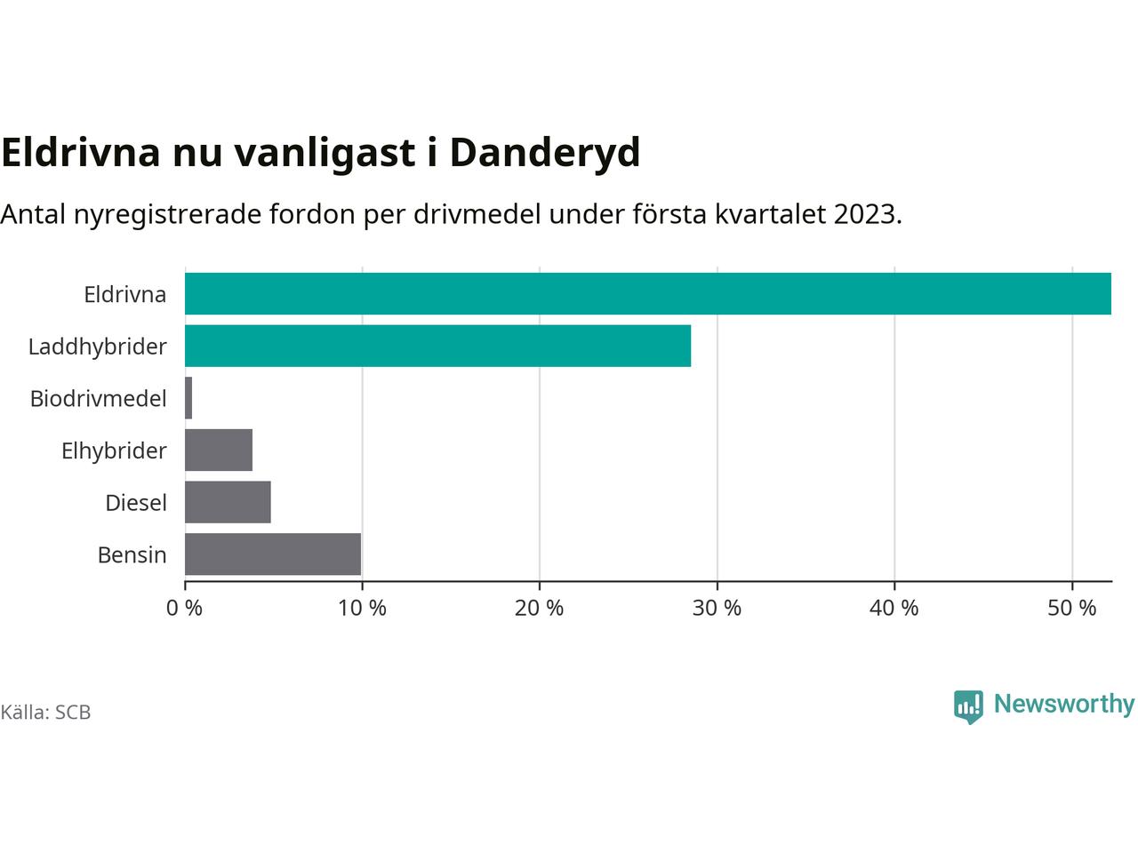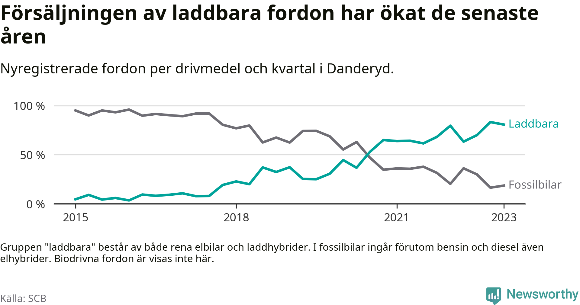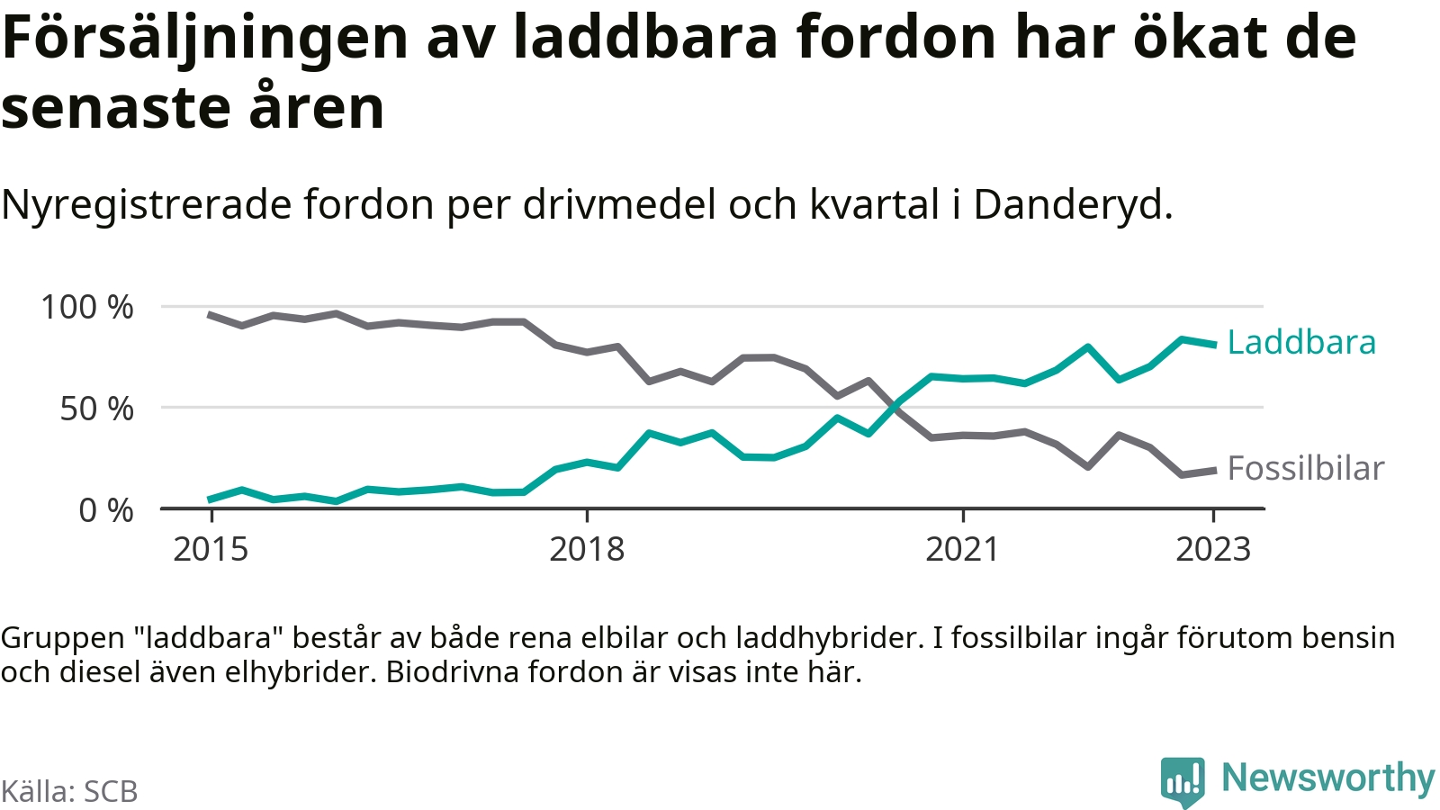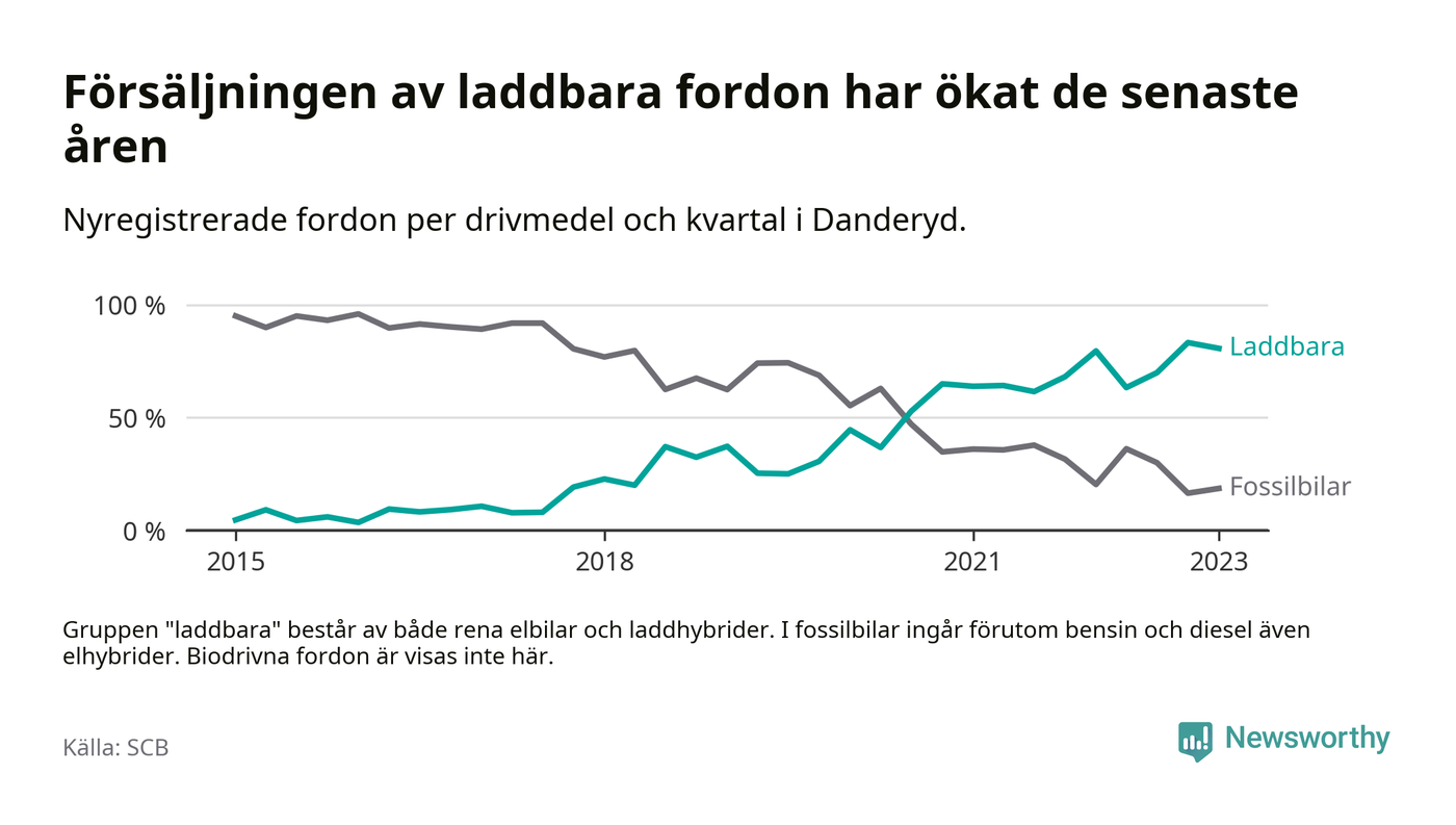 Under första kvartalet 2023 var 81 procent av alla nyregistrerade personbilar i Danderyd laddbara (sammanlagt registrerades 473 nya bilar). Merparten av de laddbara bilarna var rena elbilar (52 procent av alla).