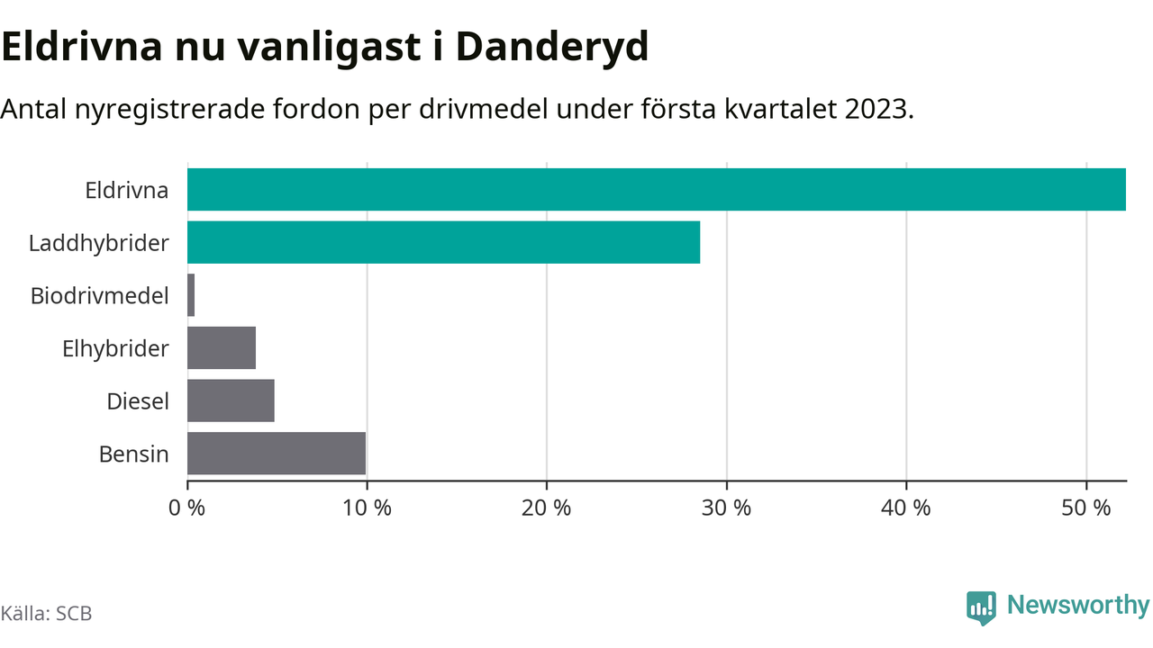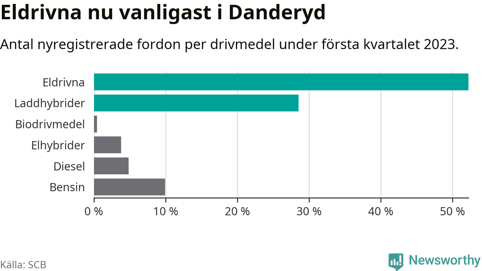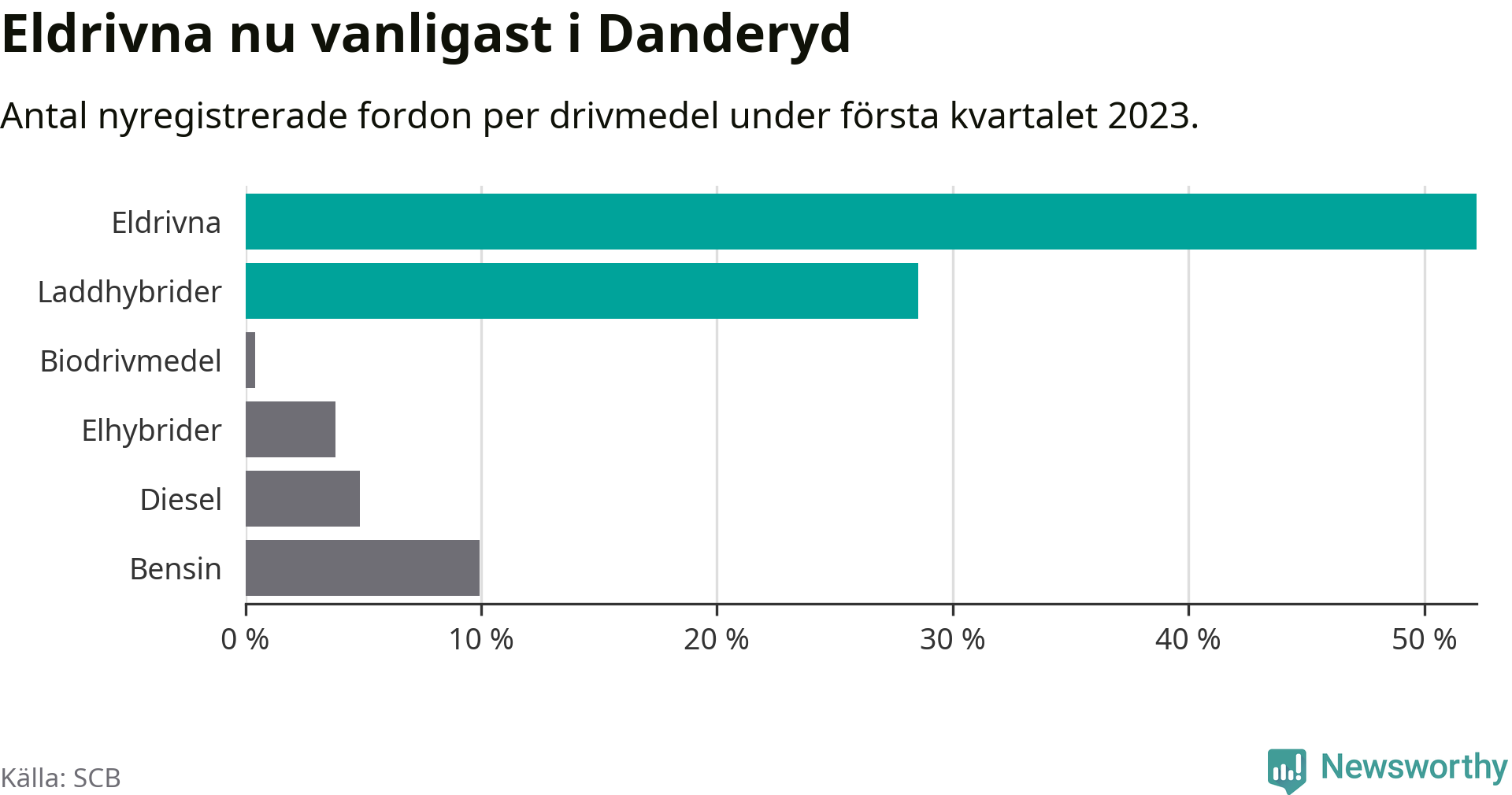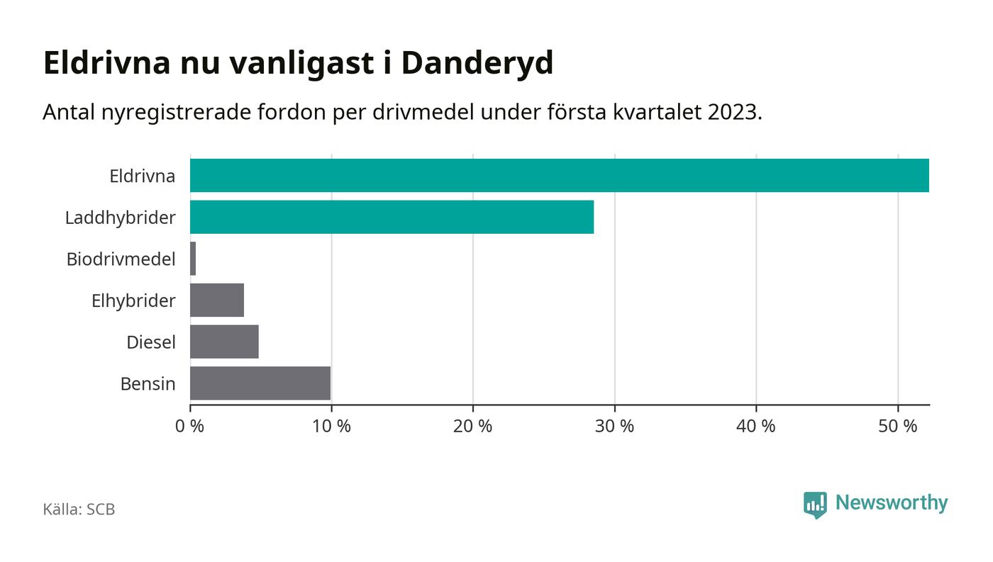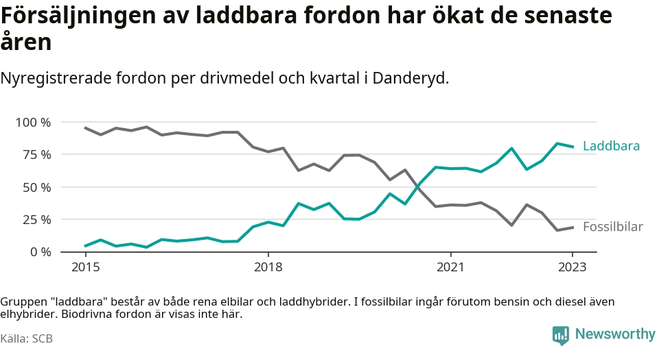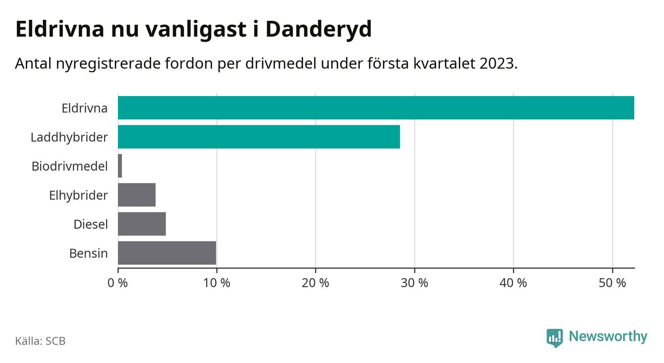 Under första kvartalet 2023 var 81 procent av alla nyregistrerade personbilar i Danderyd laddbara (sammanlagt registrerades 473 nya bilar). Merparten av de laddbara bilarna var rena elbilar (52 procent av alla).