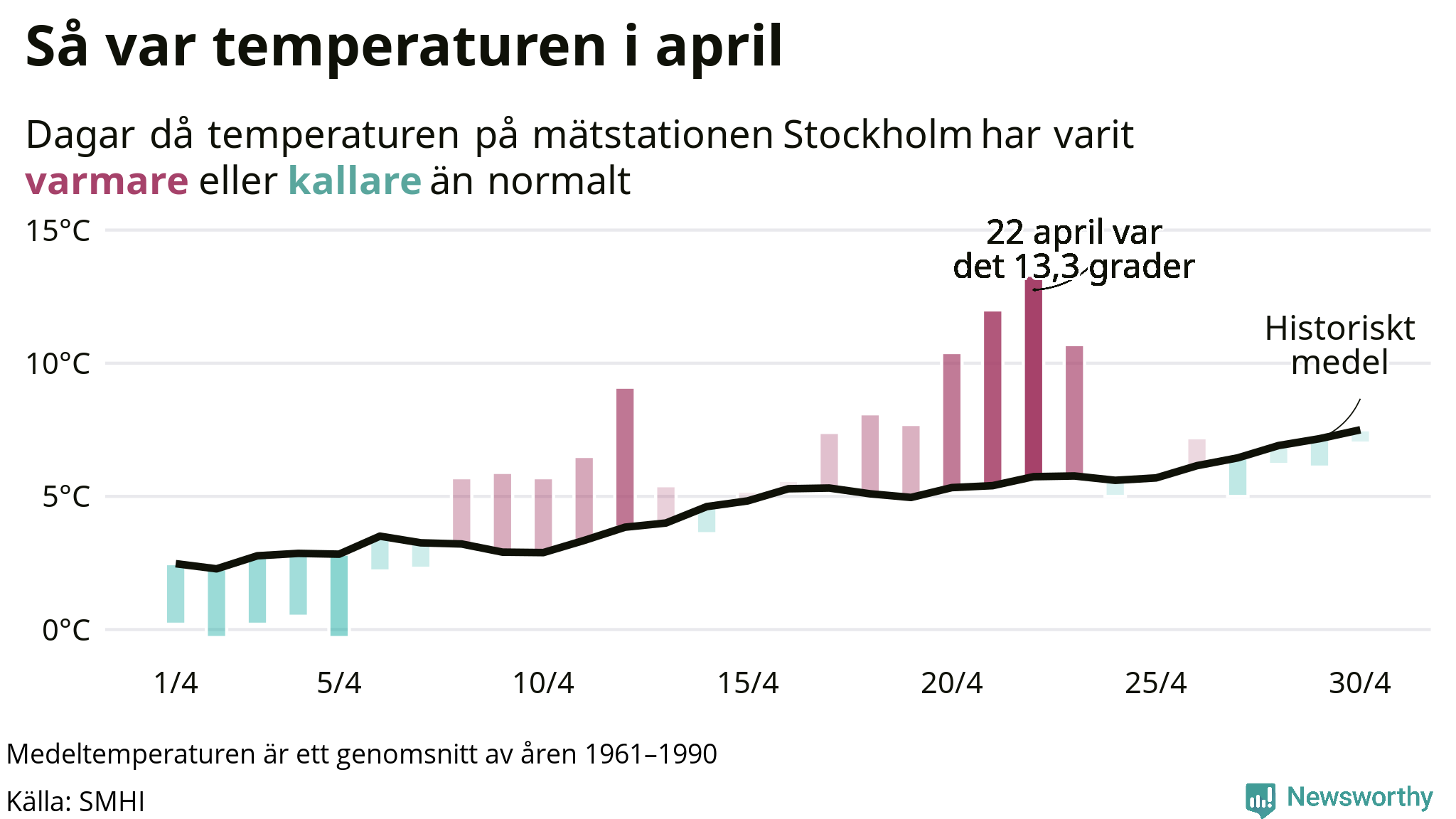 April var varmare än normalt i Stockholms kommun. Under 17 av 30 dagar låg dygnsmedeltemperaturen över det historiska snittet.