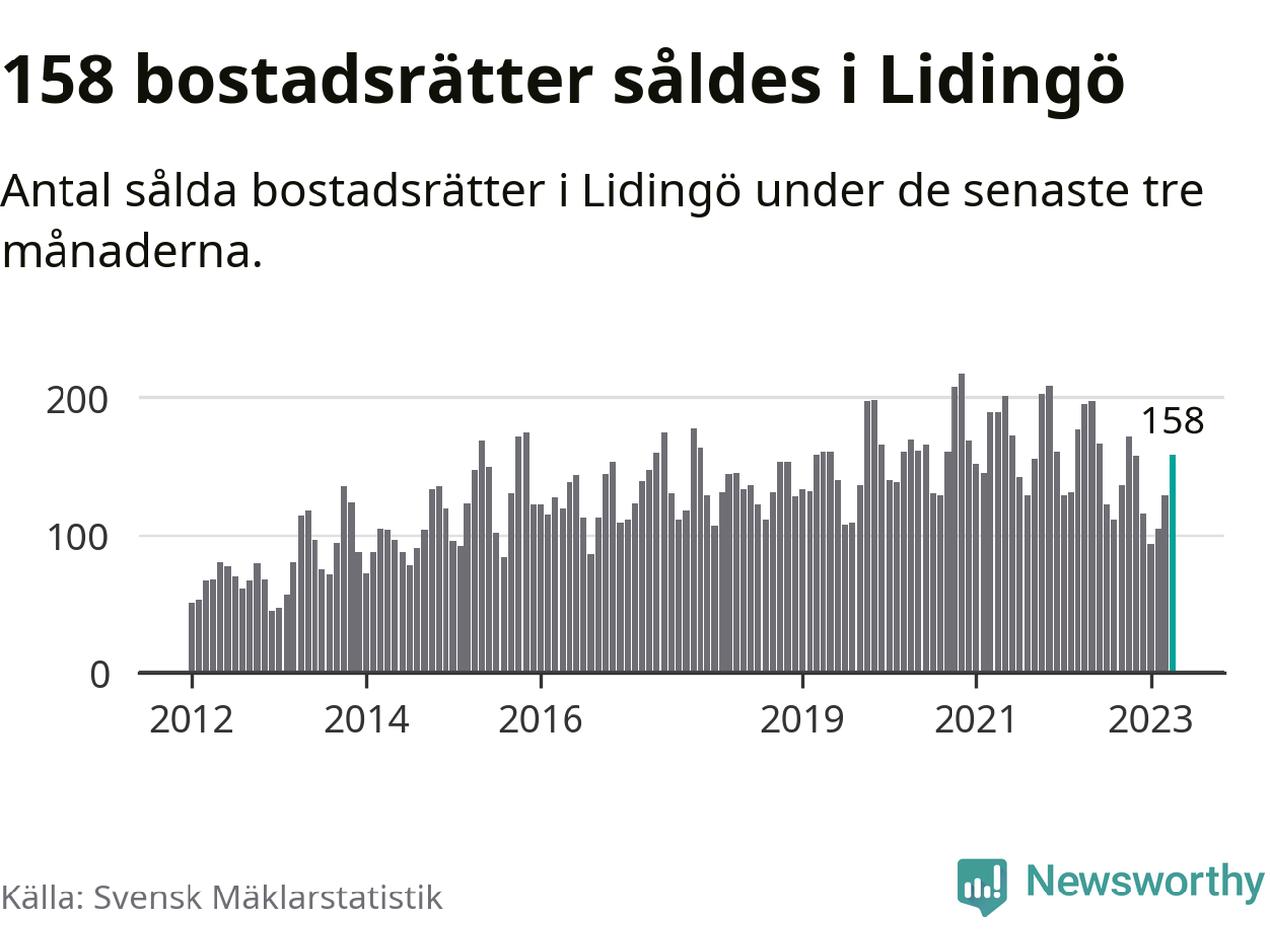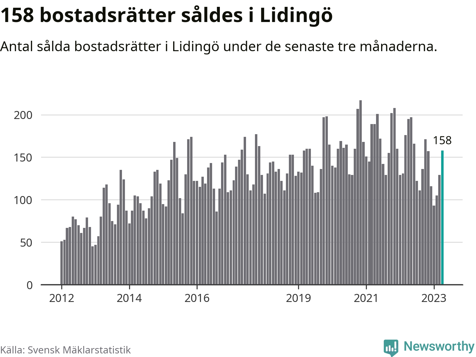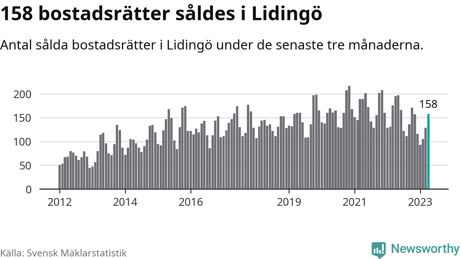 Sammanlagt såldes 158 bostadsrätter i Lidingö kommun mellan februari och april till ett genomsnittligt pris på 4,3 miljoner kronor. I fjol gjordes 195 affärer vid den här tiden på året.