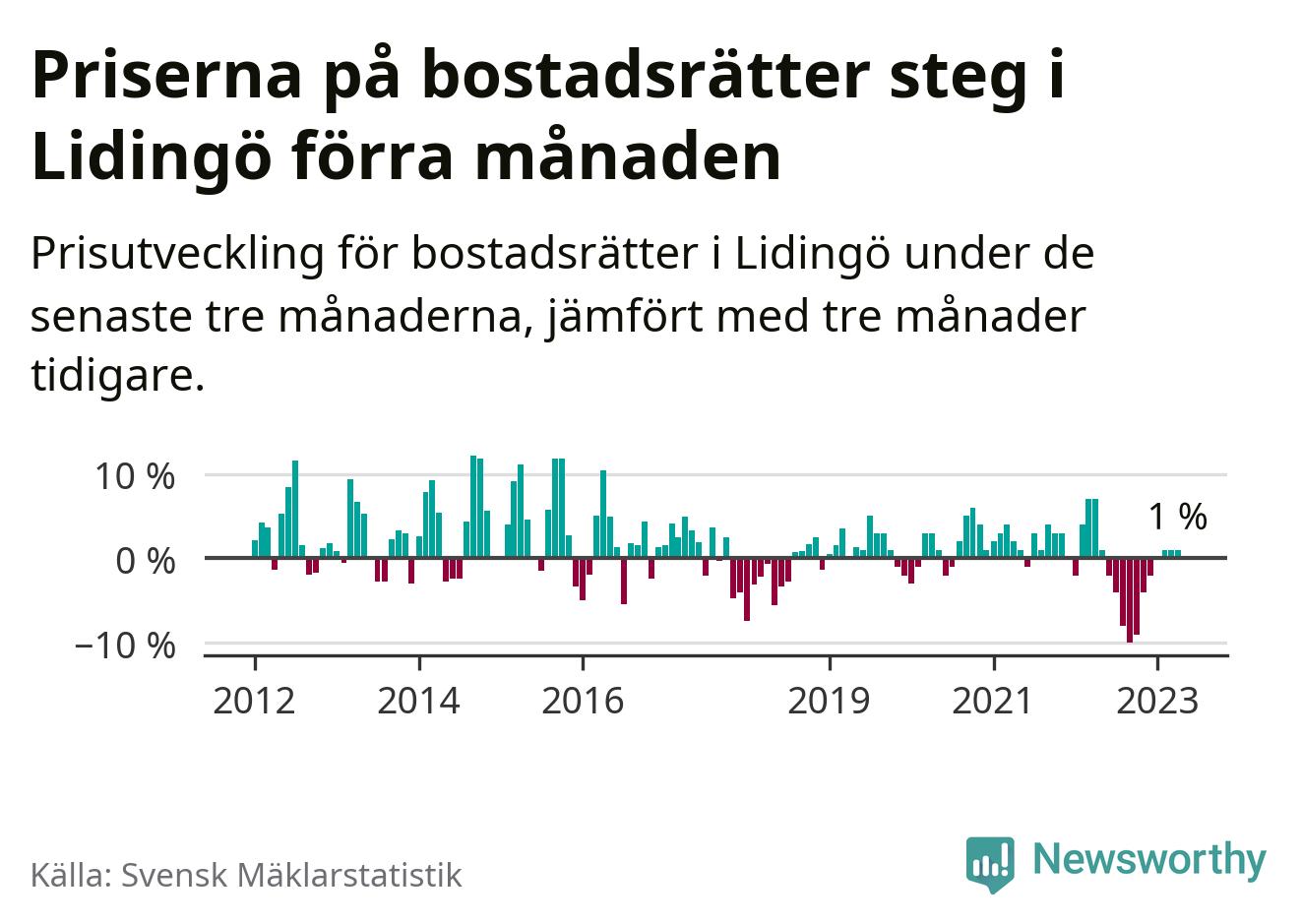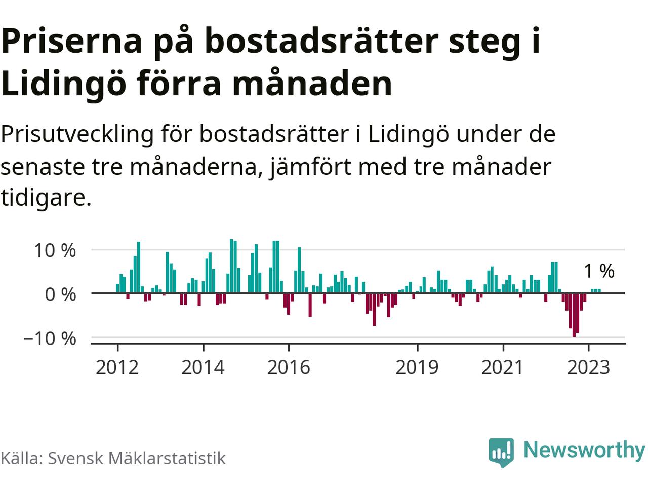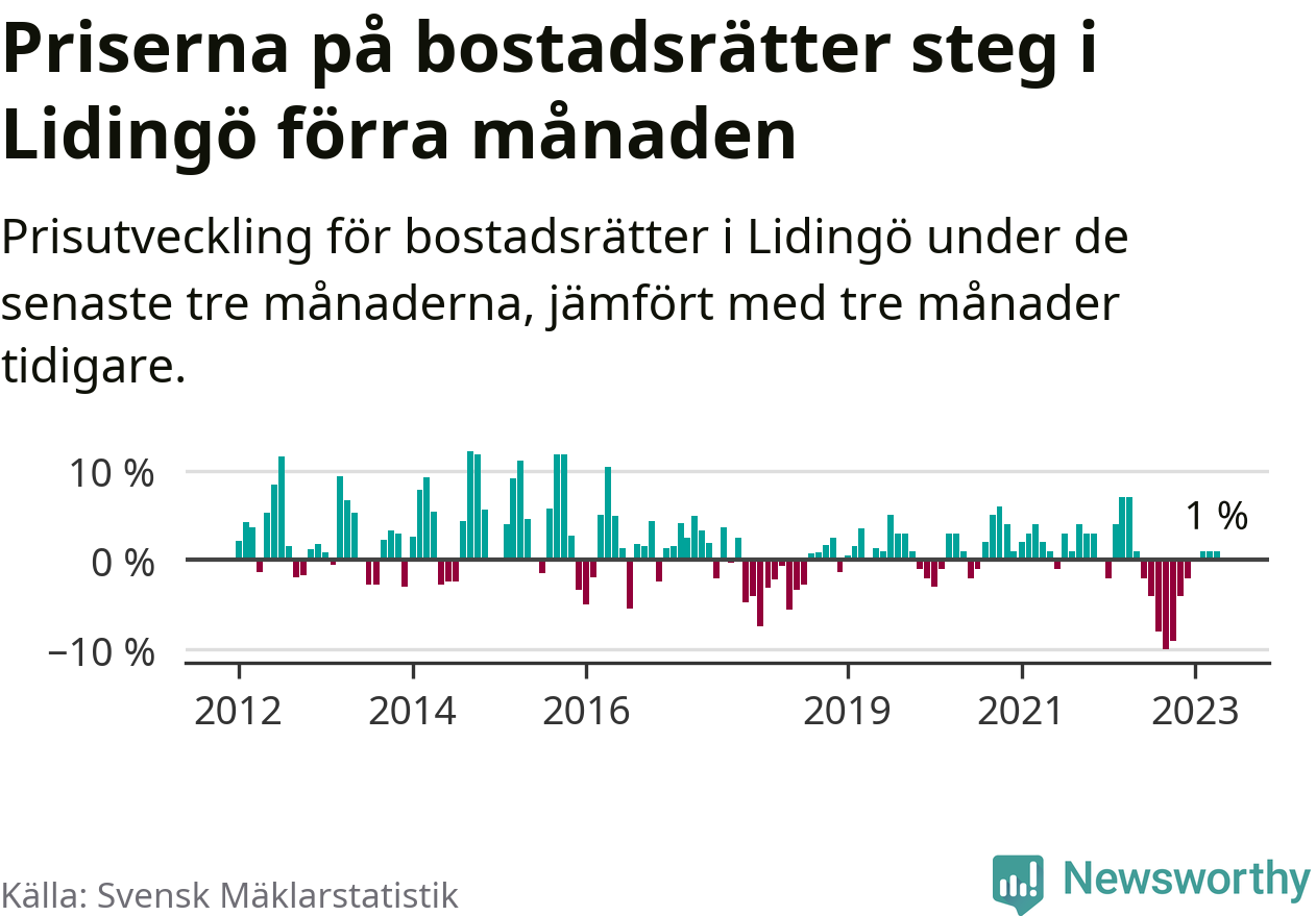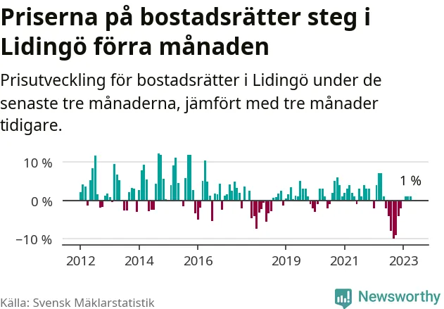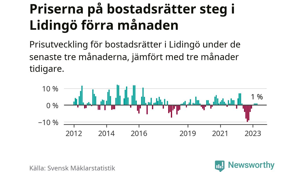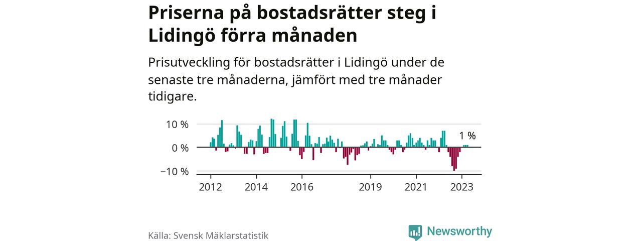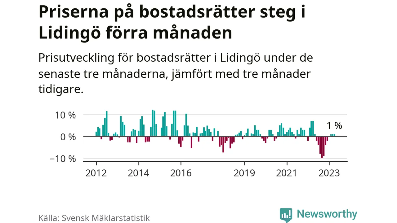Priserna på bostadsrätter har gått upp i Lidingö kommun. Medelpriset på försäljningarna under de senaste tre månaderna visar på en uppgång med 1 procent.
