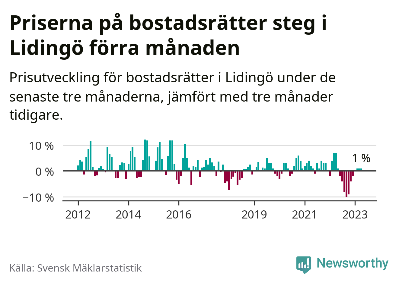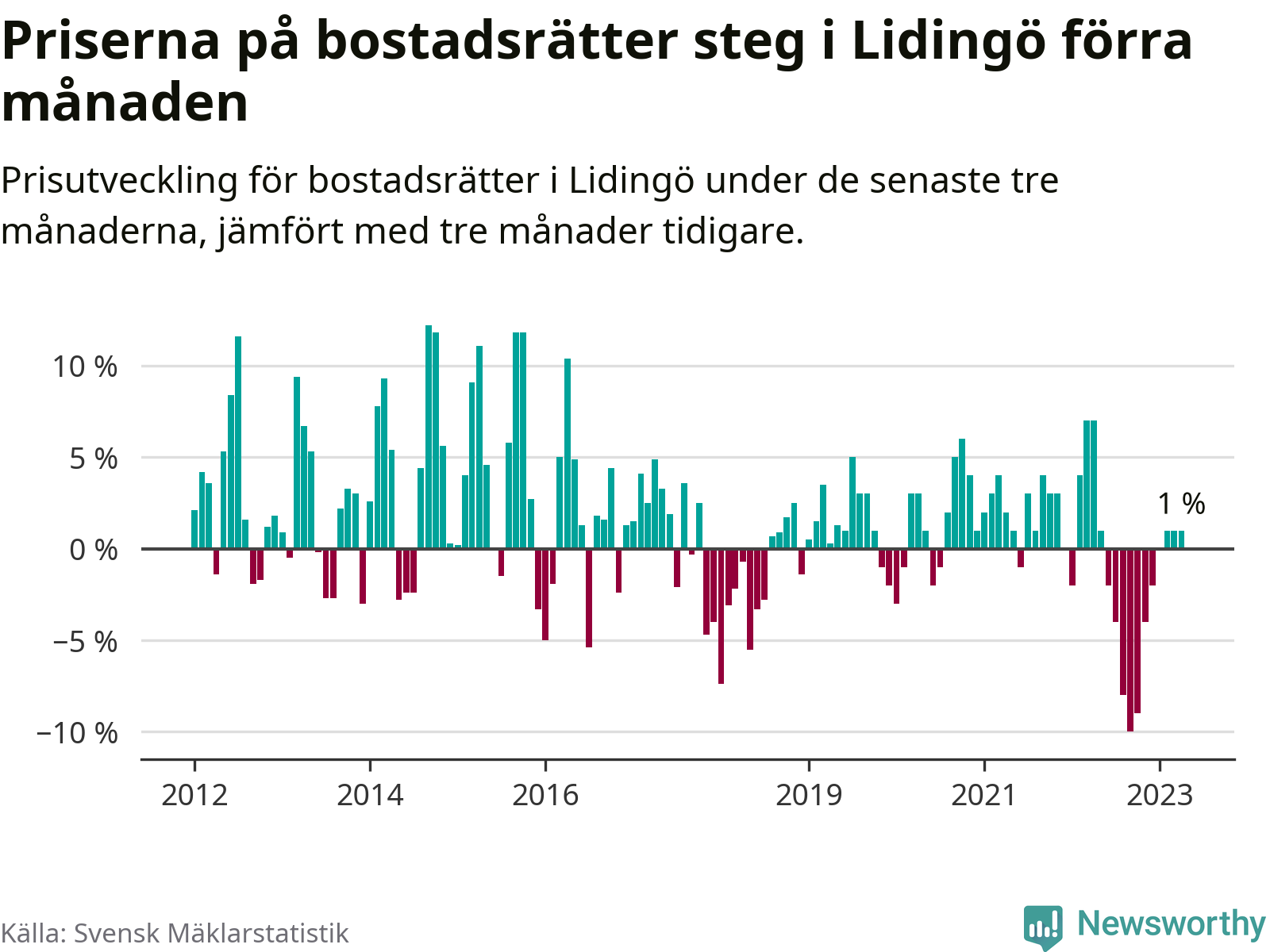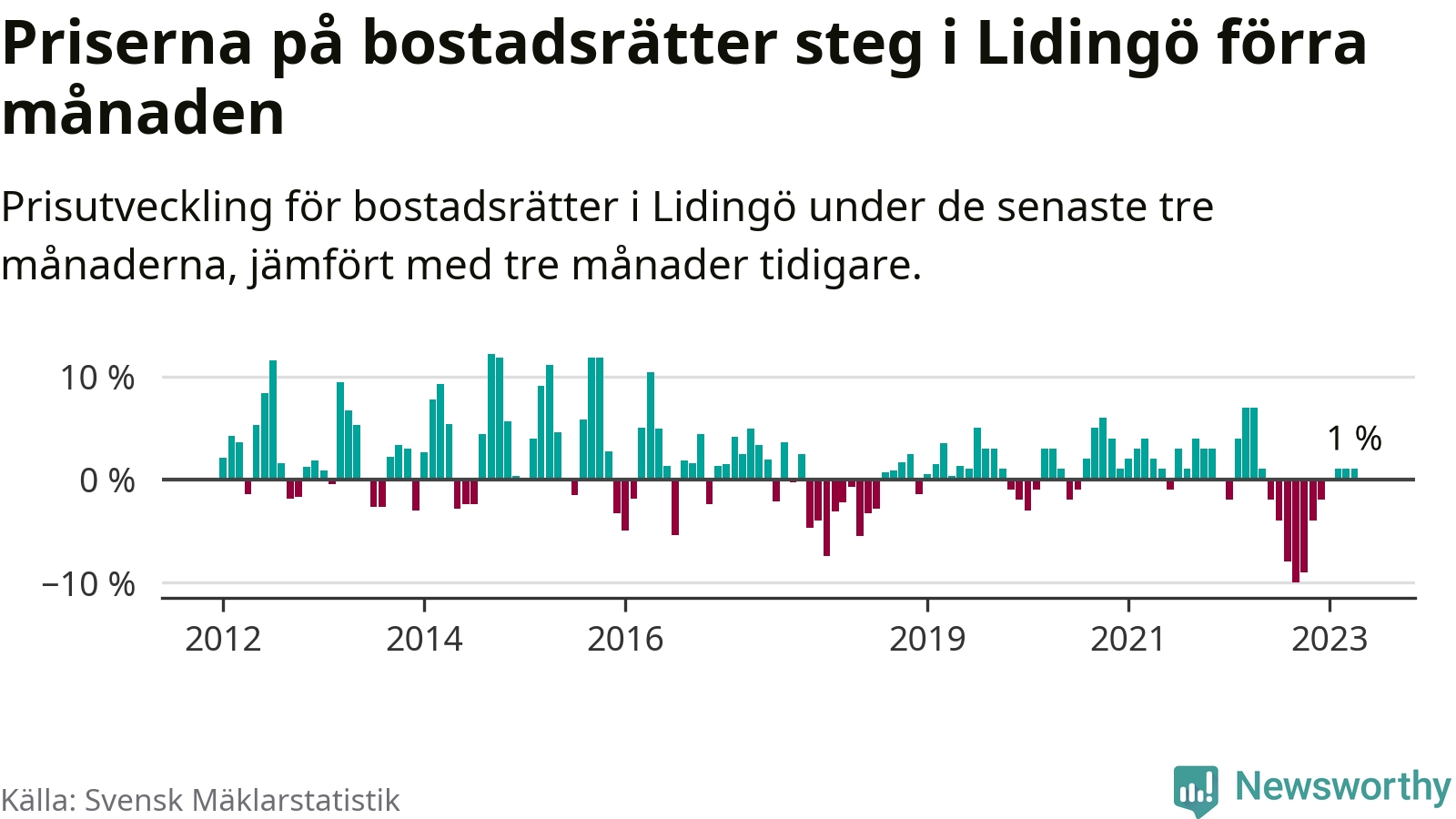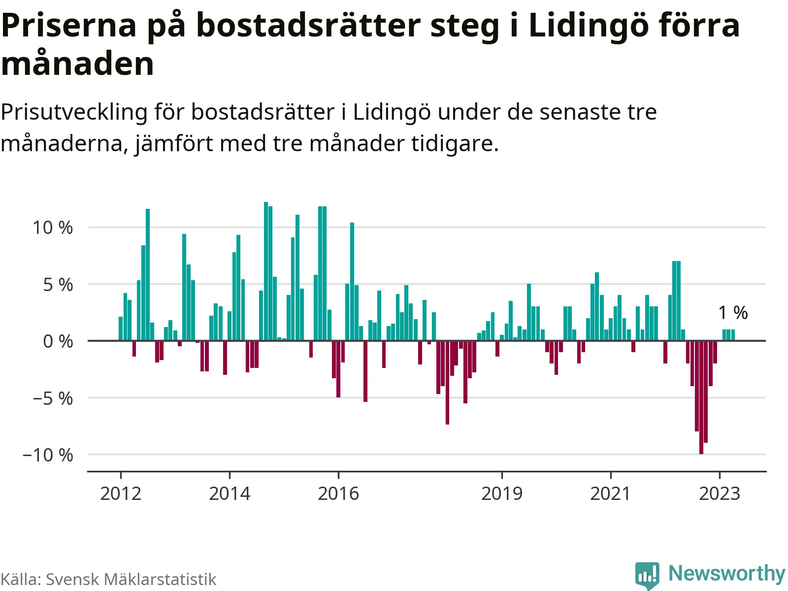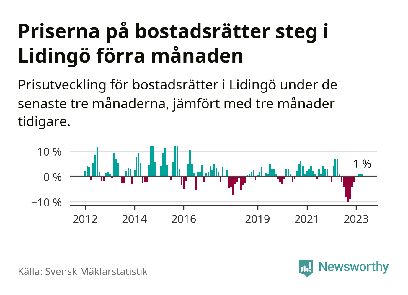 Priserna på bostadsrätter har gått upp i Lidingö kommun. Medelpriset på försäljningarna under de senaste tre månaderna visar på en uppgång med 1 procent.